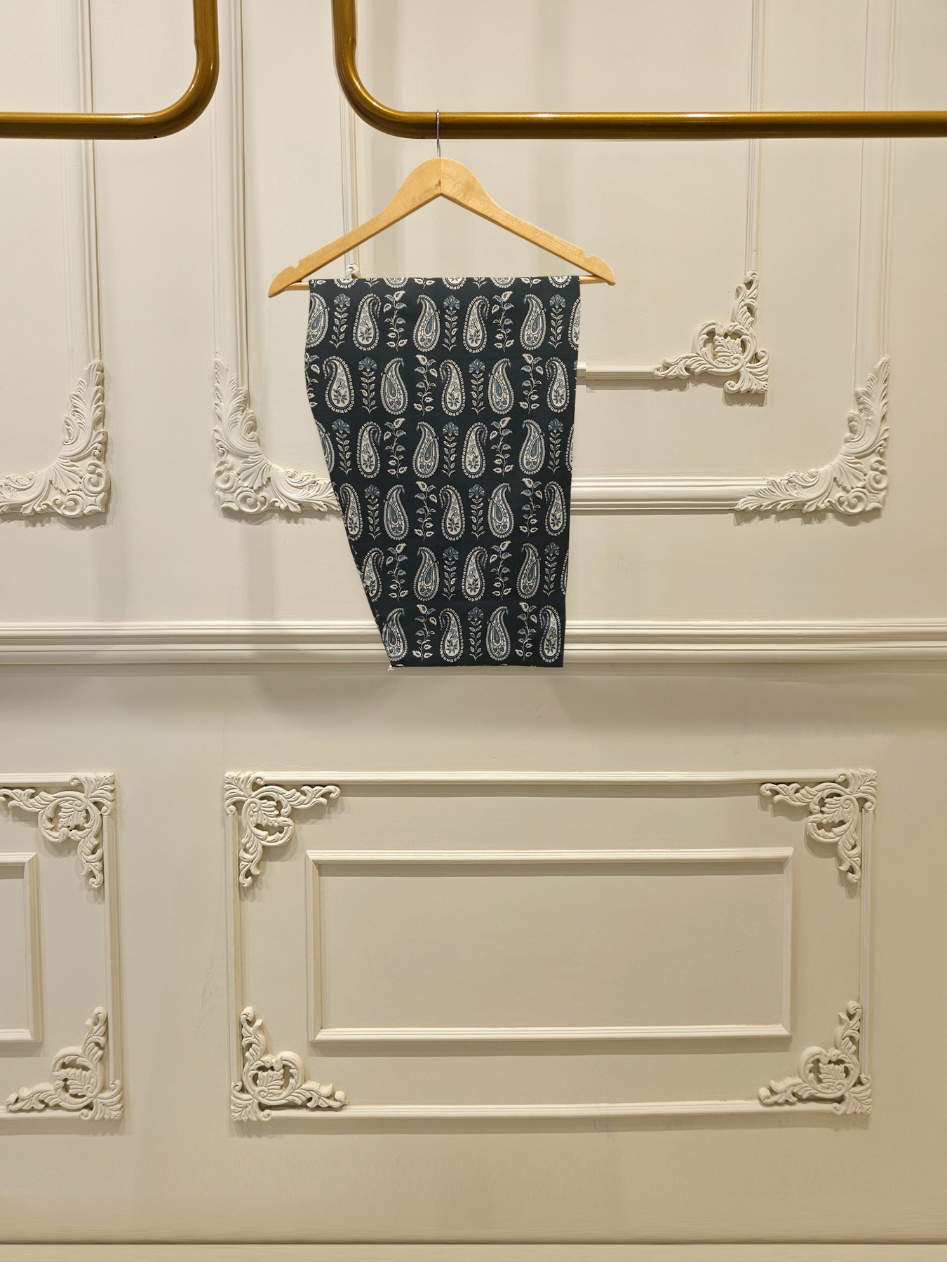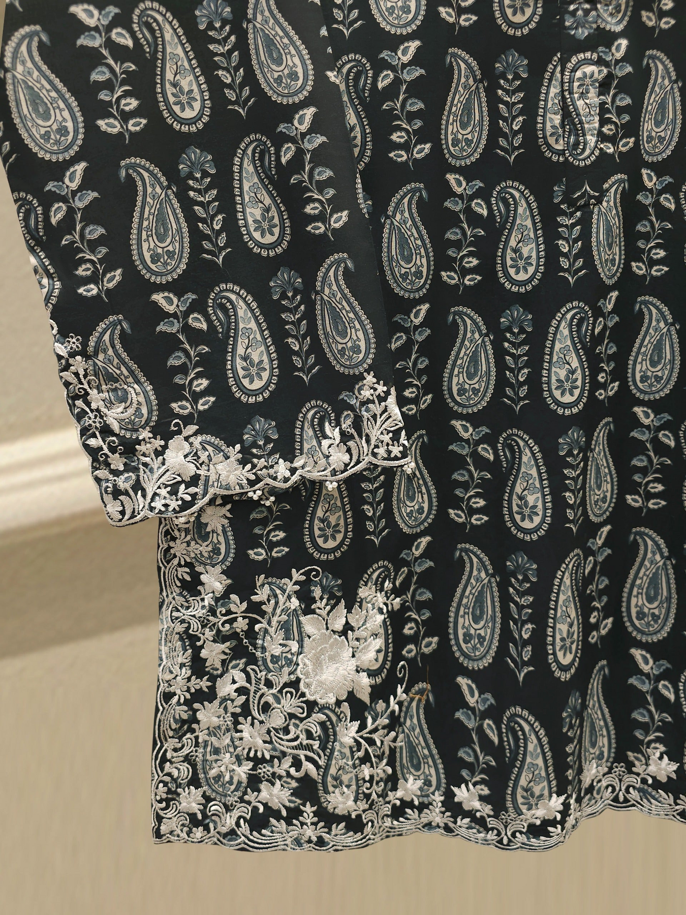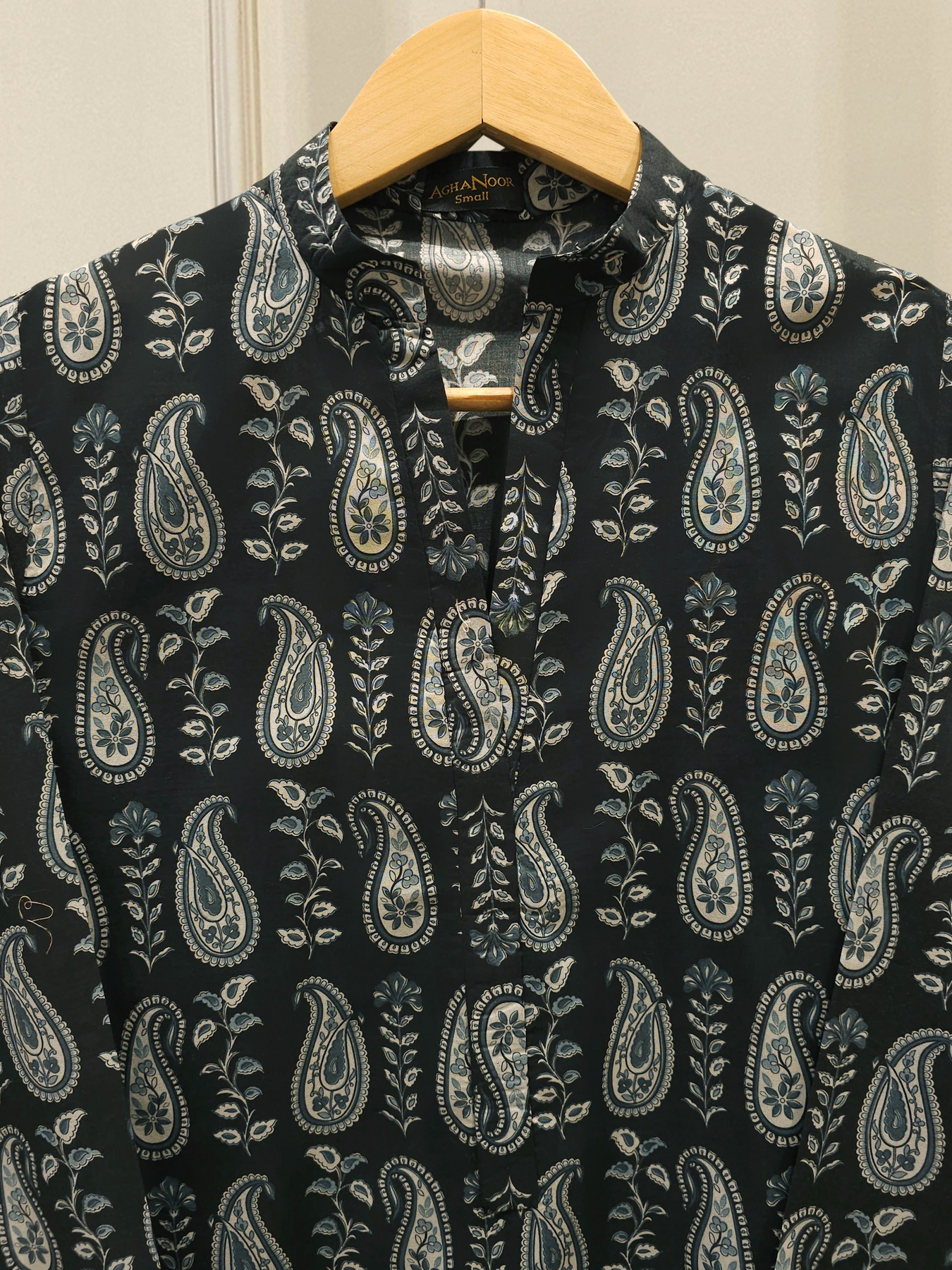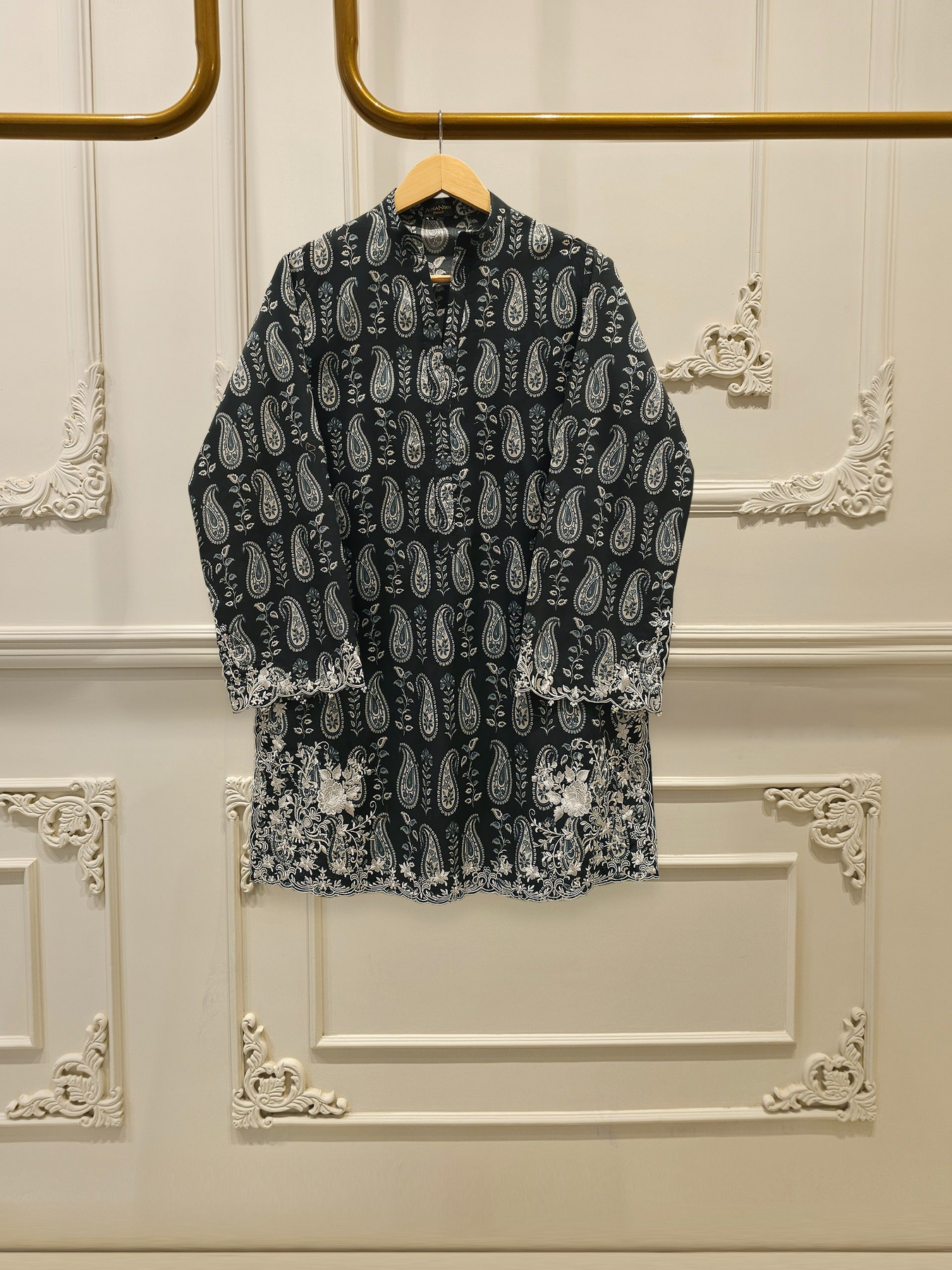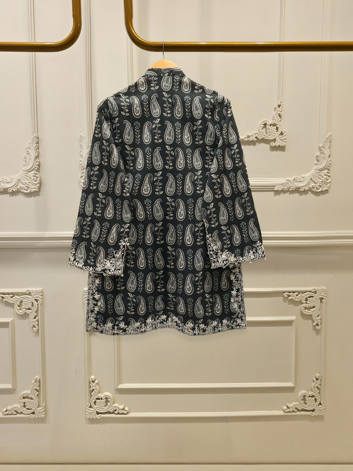 Elevate your summer wardrobe with this beautifully crafted black printed cambric shirt, featuring intricate Chikan Kari work on the sleeves and daman. Designed for timeless elegance, this piece blends breathable lawn fabric with traditional craftsmanship, perfect for festive occasions or casual sophistication. Pair it with pants for a complete look.
