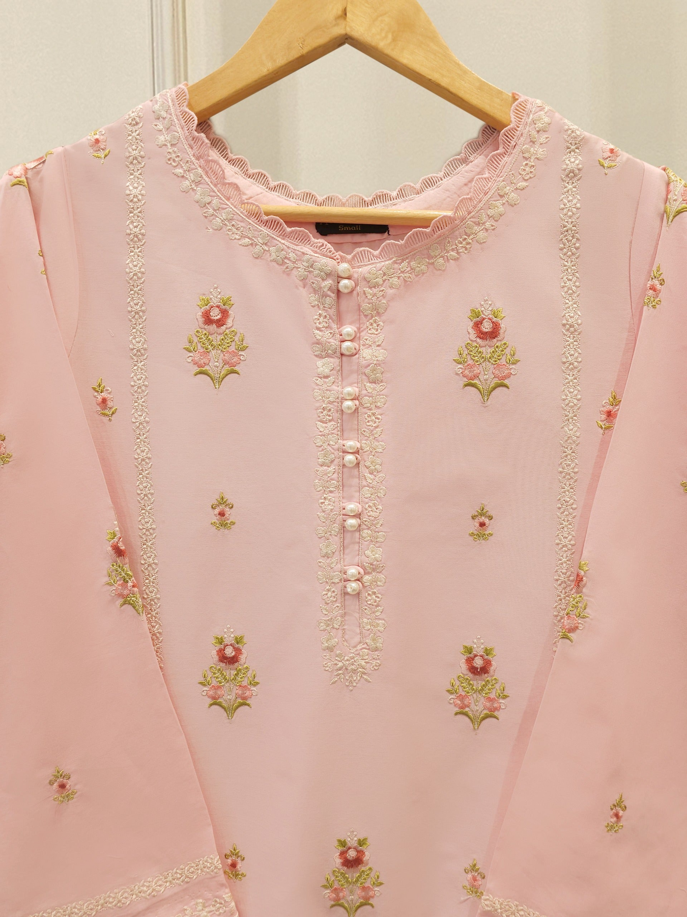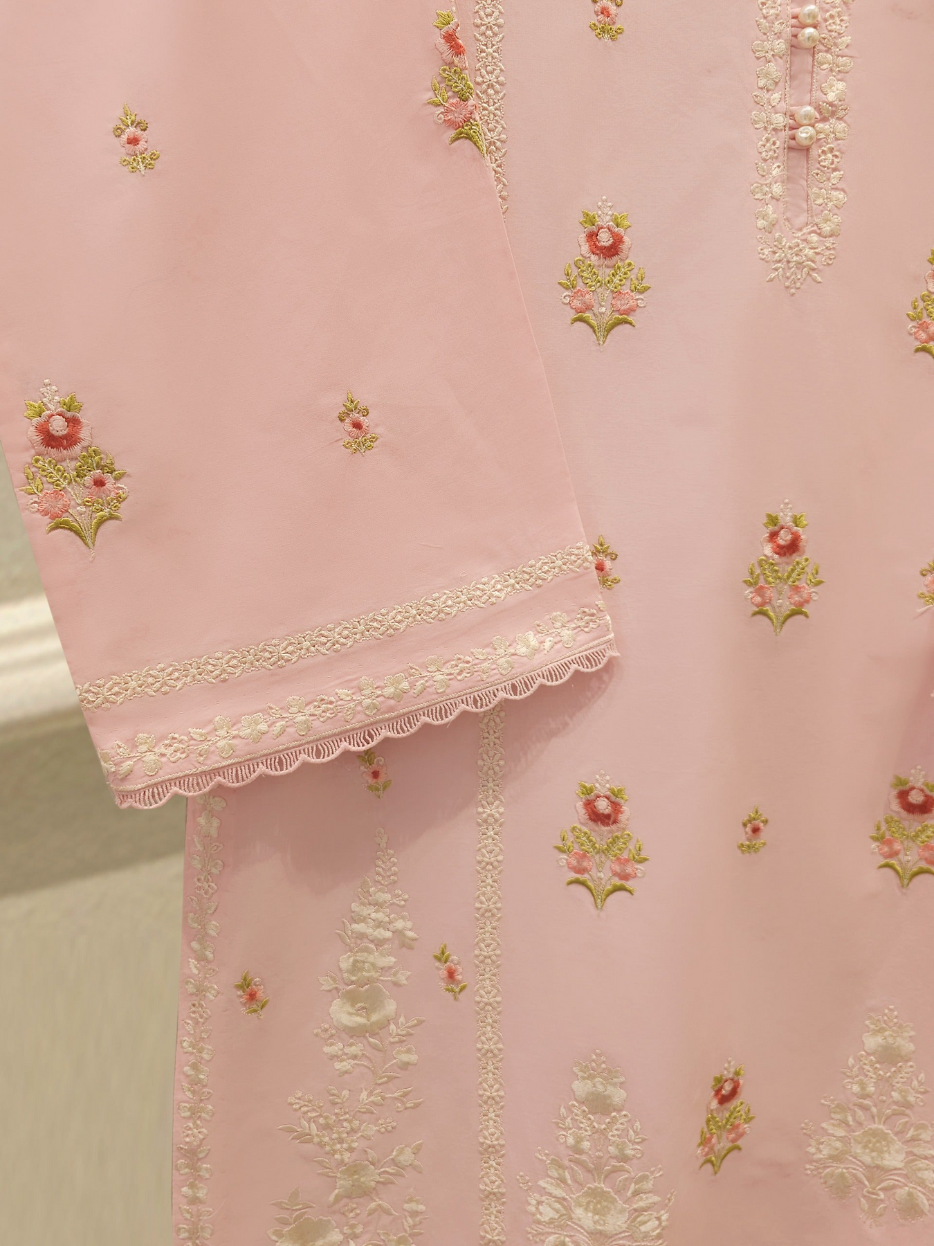 Elevate your summer wardrobe with this beautifully crafted pink cambric shirt, featuring intricate Chikan Kari work on the sleeves and daman. Designed for timeless elegance, this piece blends breathable lawn fabric with traditional craftsmanship, perfect for festive occasions or casual sophistication. Pair it with pants for a complete look.