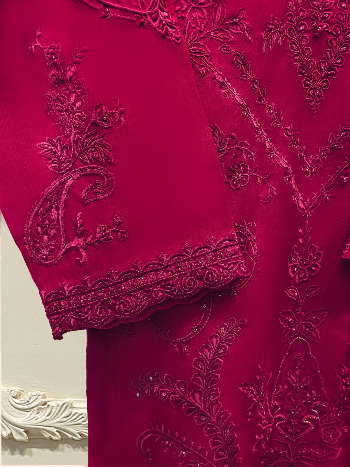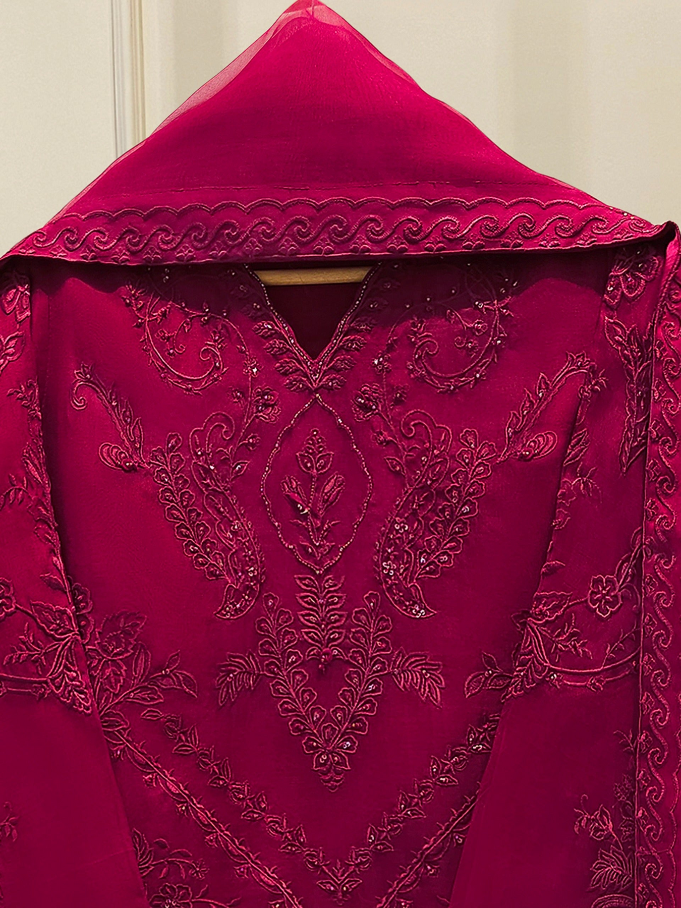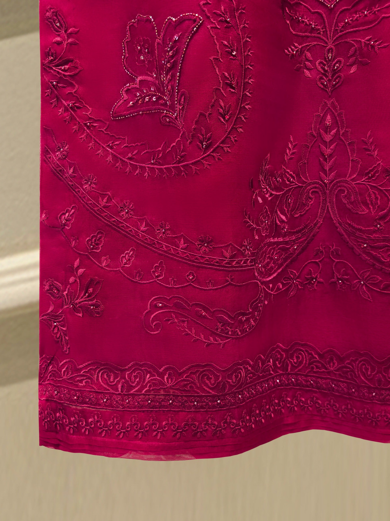 Elevate your style with maroon embroidered organza straight shirt crafted with utmost care and attention to detail. The shirt features intricate embroidery on the front and sleeves, adding a touch of timeless charm.