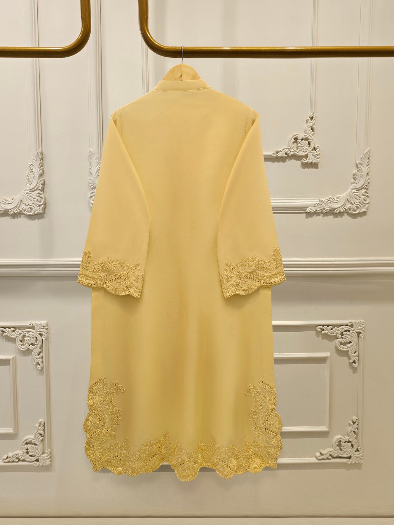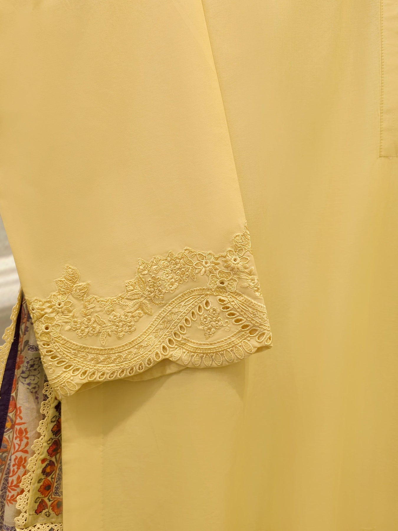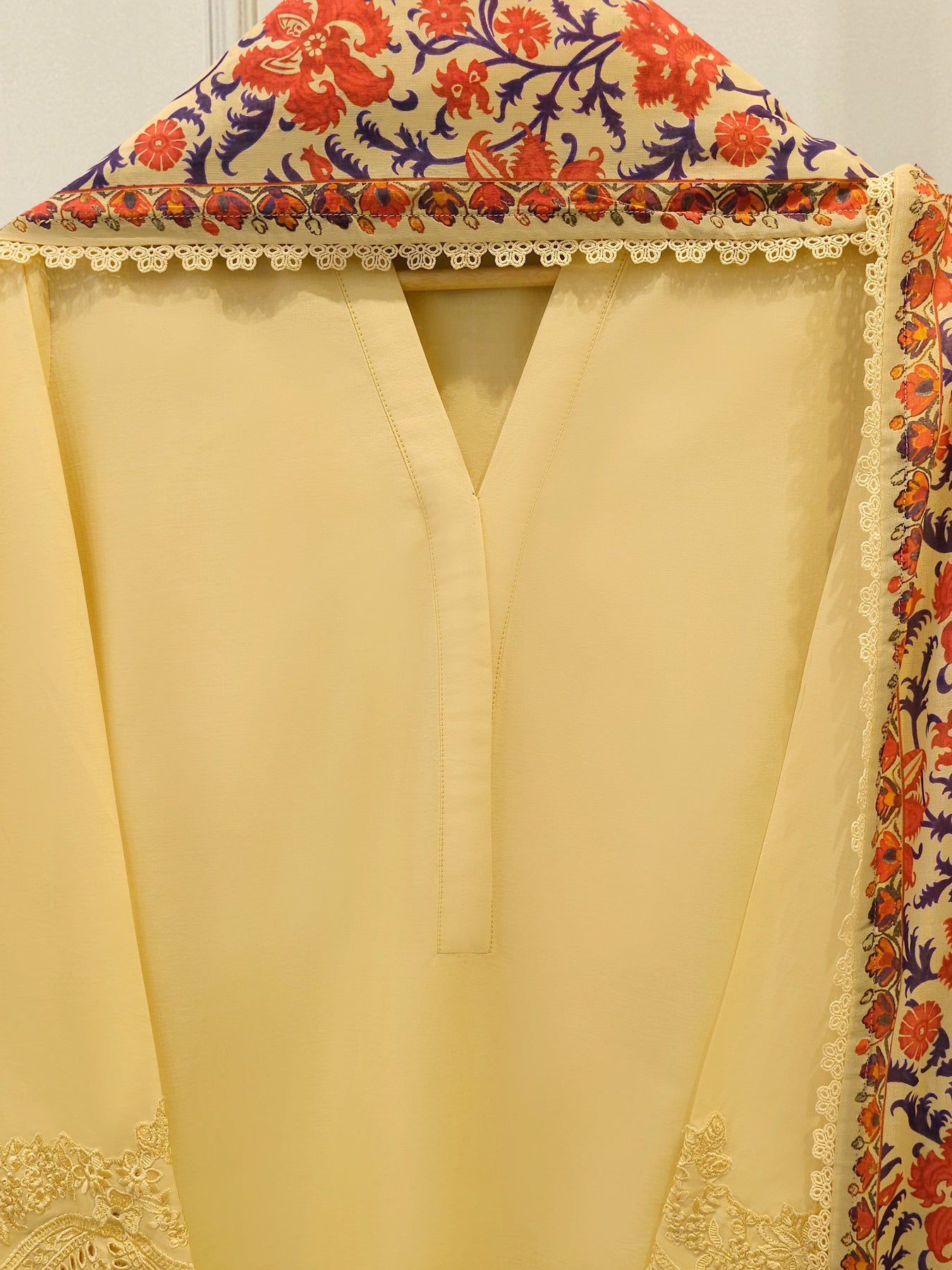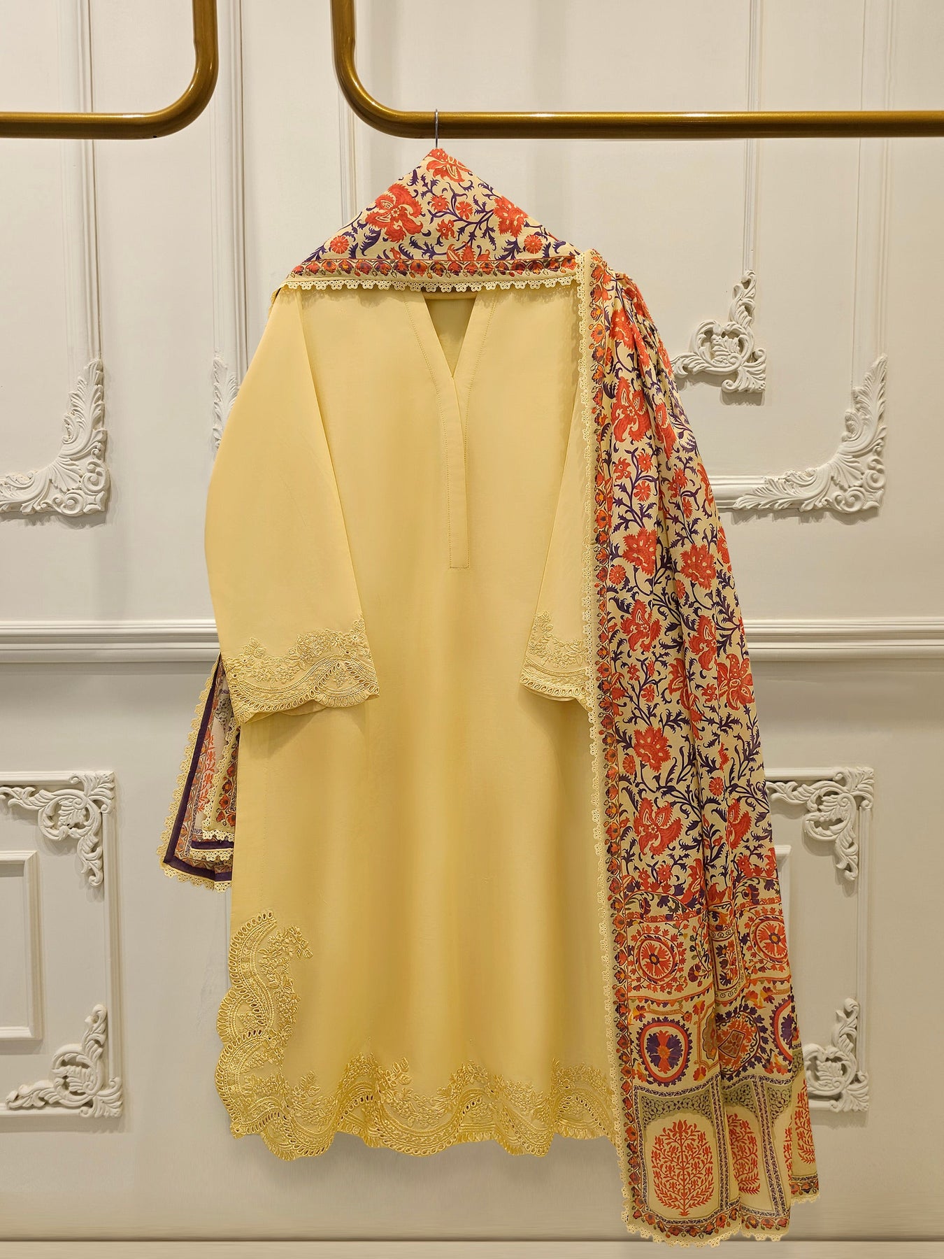 Elevate your summer wardrobe with this beautifully crafted yellow cambric shirt, Designed for timeless elegance, this piece blends breathable lawn fabric with traditional craftsmanship, perfect for festive occasions or casual sophistication. Pair it with shalwr for a complete look.