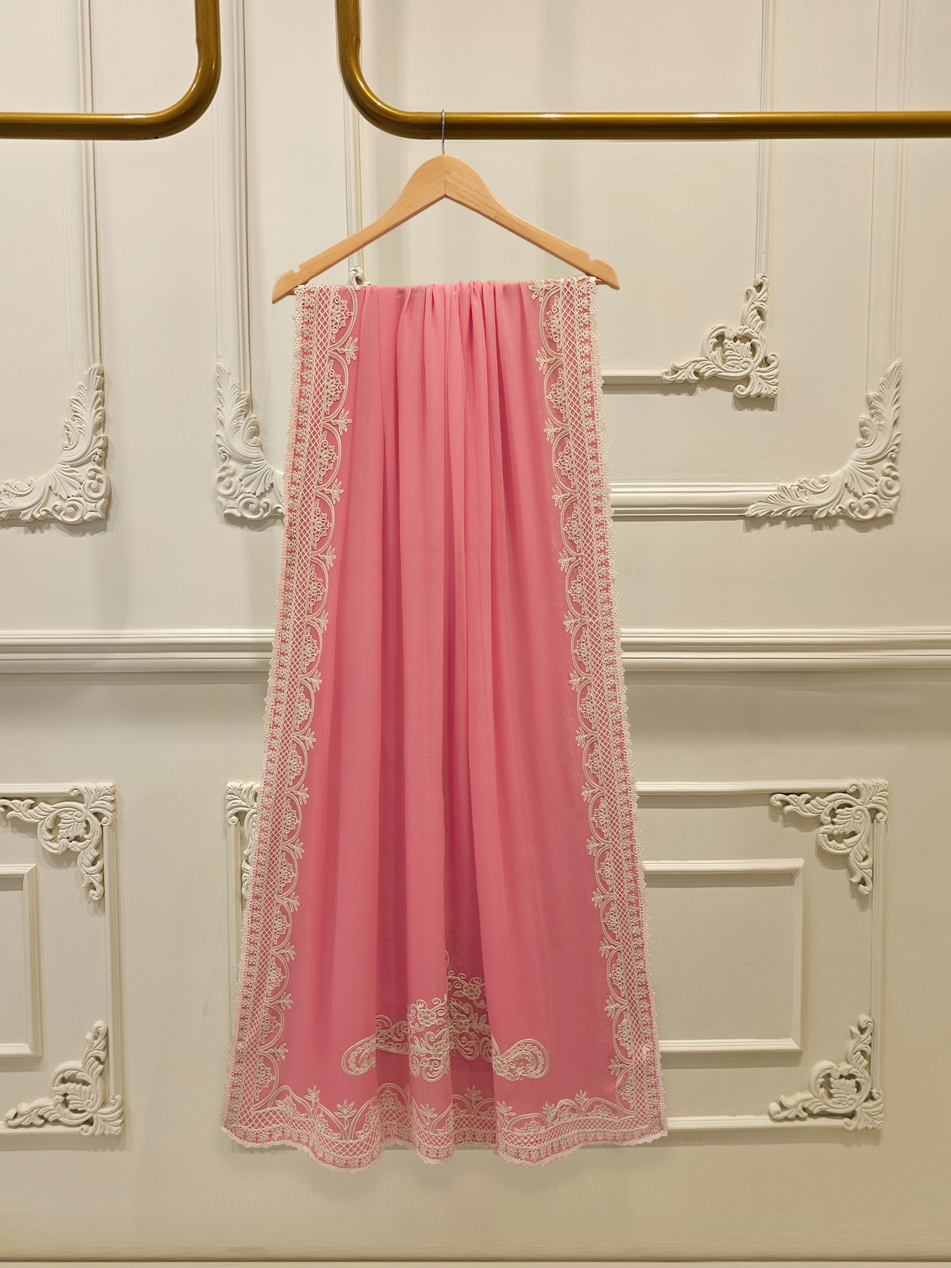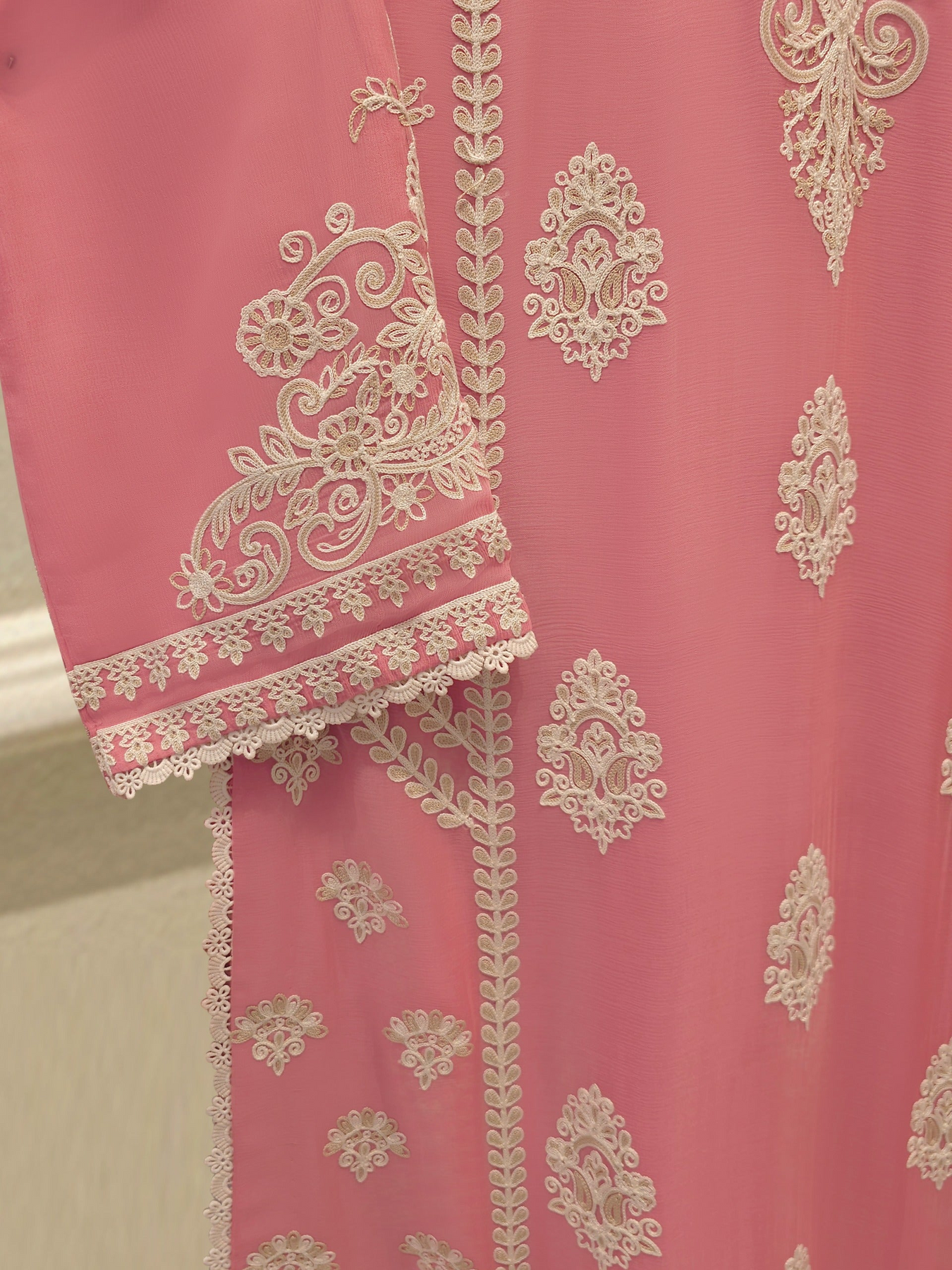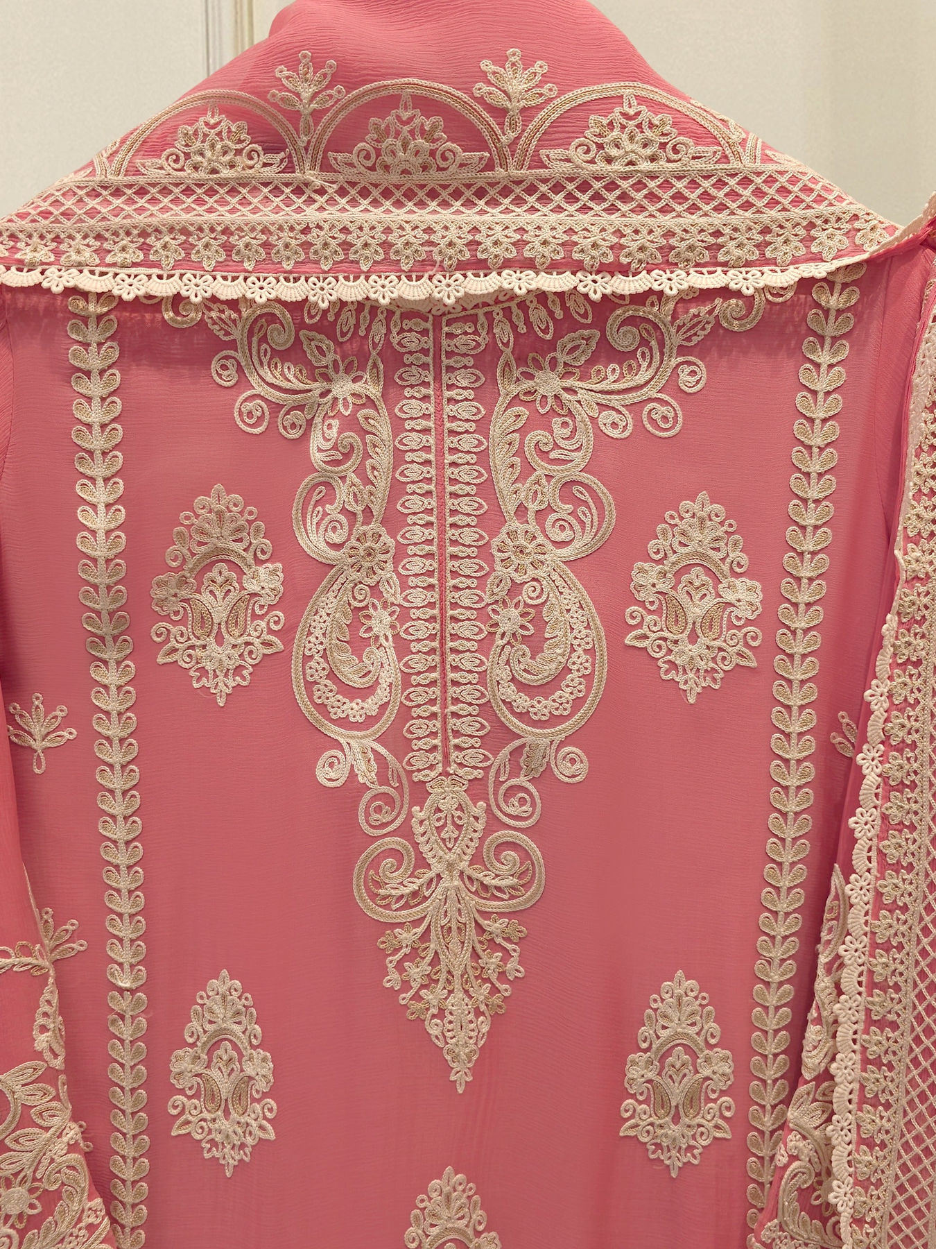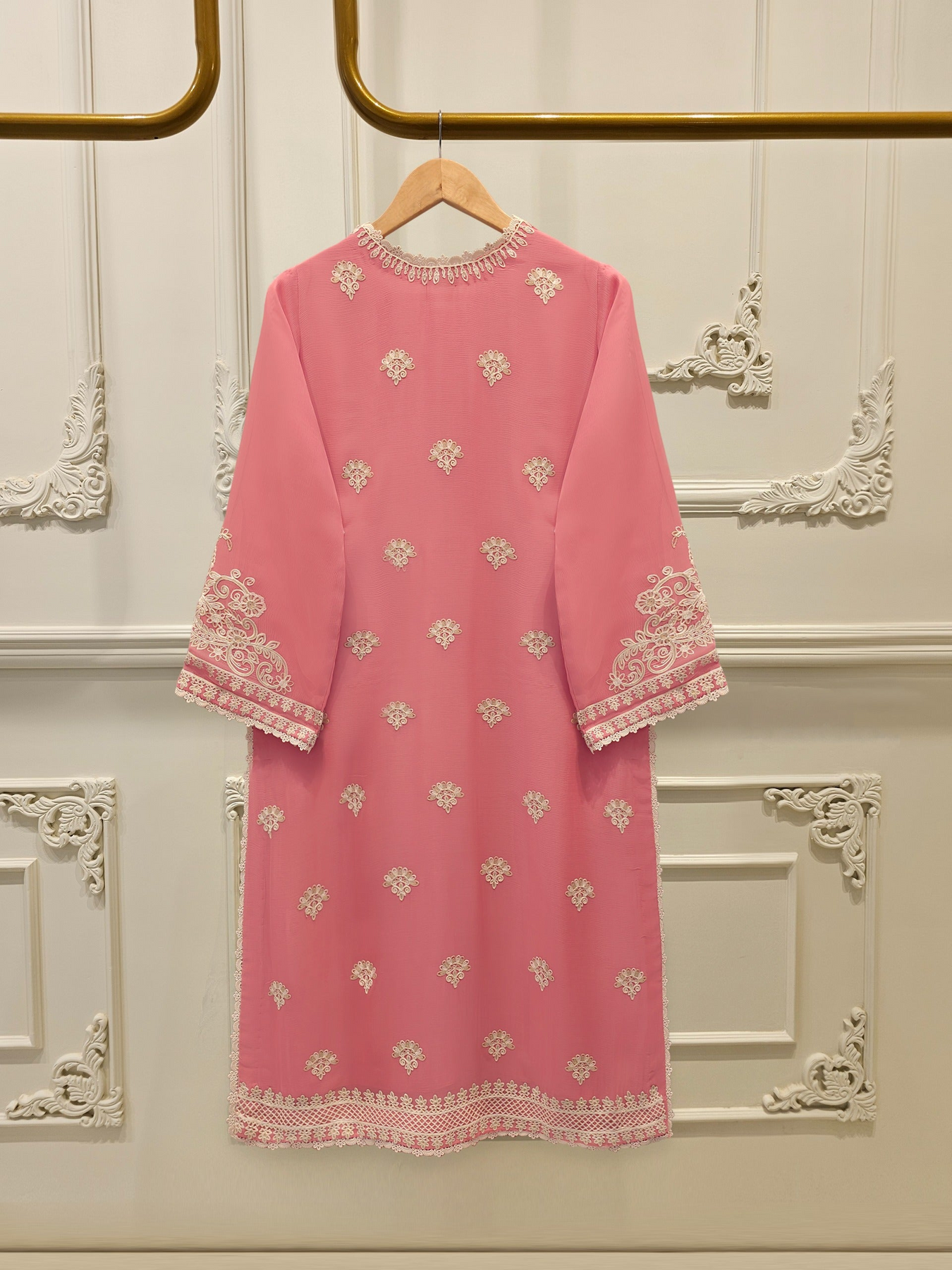 Elevate your style with our beige embroidered chiffon straight shirt crafted with utmost care and attention to detail. The shirt features intricate embroidery on the front and sleeves, adding a touch of timeless charm.