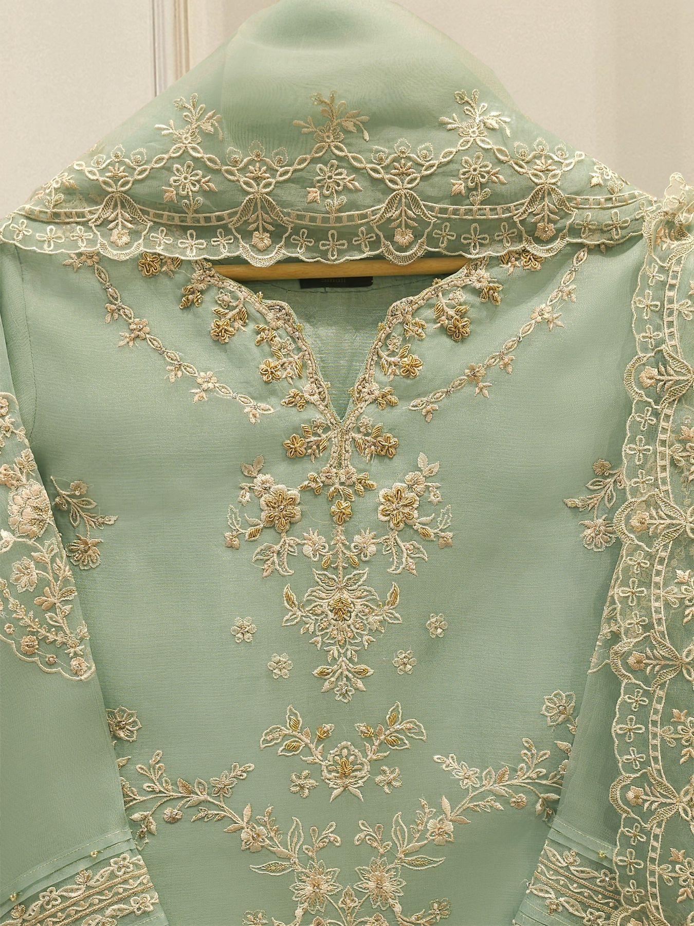 Elevate your style with sea green embroidered organza straight shirt crafted with utmost care and attention to detail. The shirt features intricate embroidery on the front and sleeves, adding a touch of timeless charm.