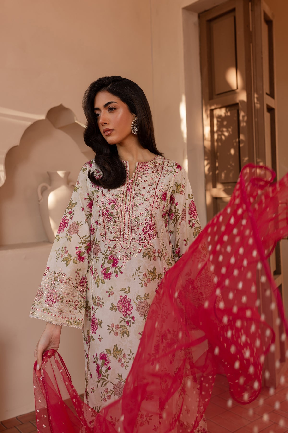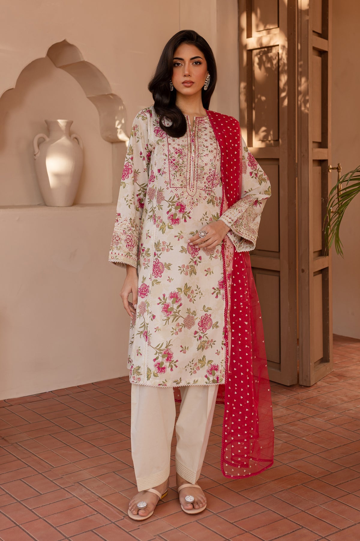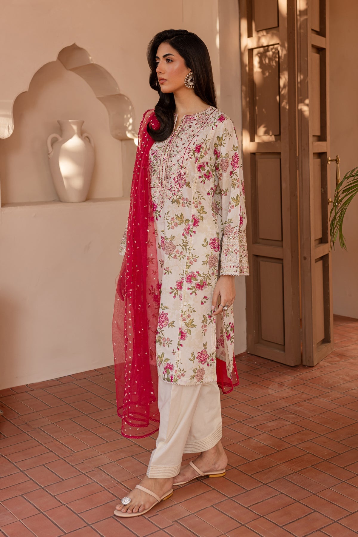 A net embroidered dupatta completes the look, featuring delicate embroidery that enhances the overall aesthetic with a soft and ethereal touch, making this outfit perfect for both casual and semi-formal occasions.