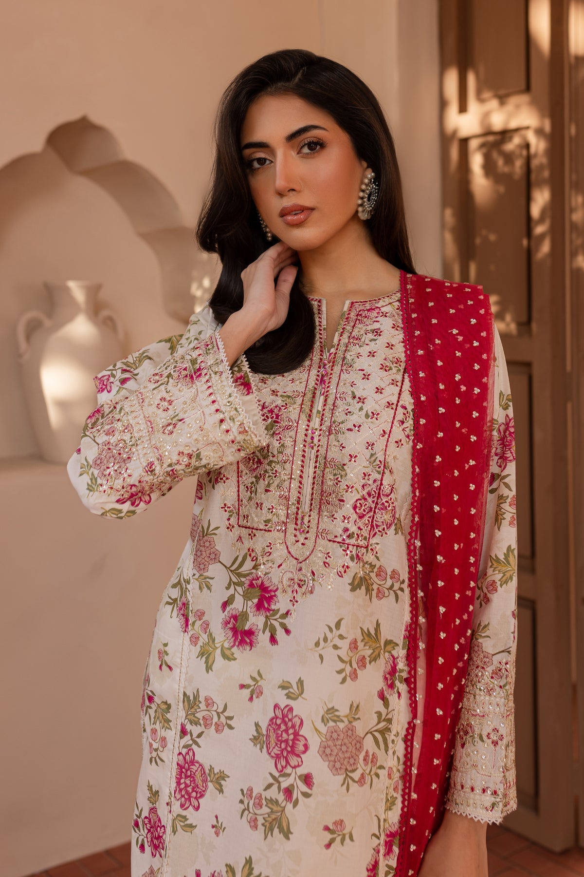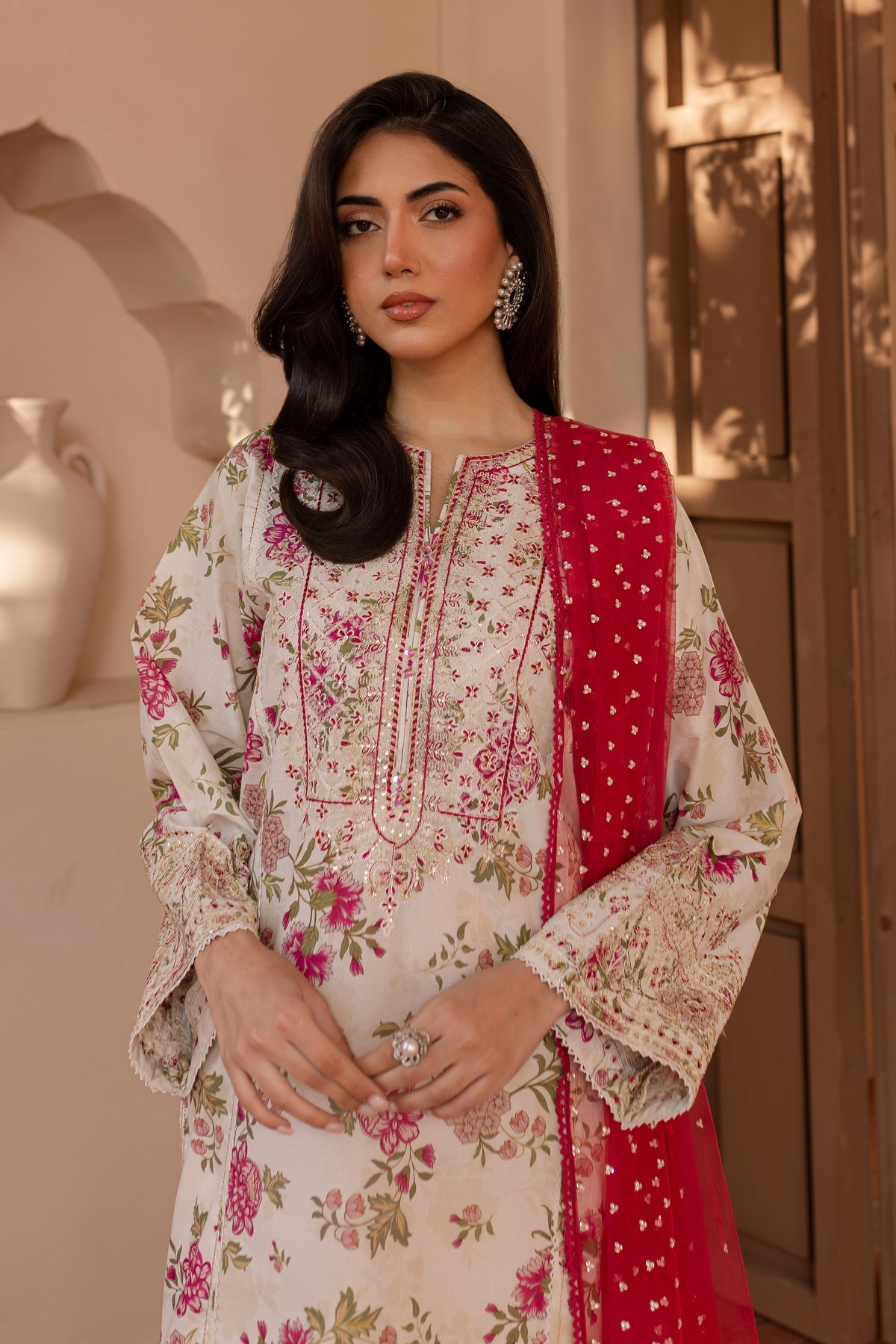 The shirt is paired with a cambric dyed shalwar, providing a comfortable yet stylish foundation that complements the shirt’s design.