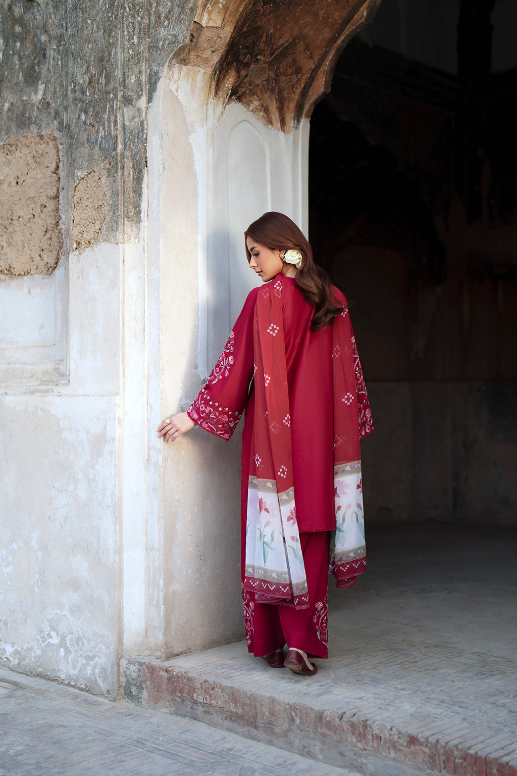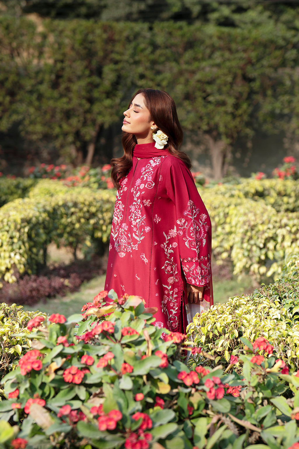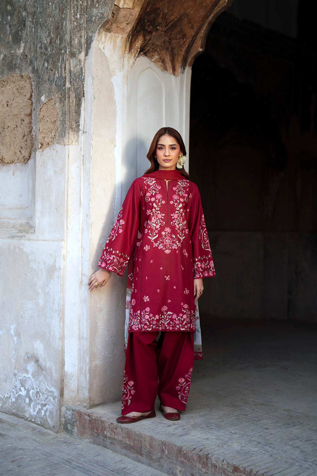 A deep maroon embroidered suit with a strong floral layout on the front and detailed sleeve work. The tones add warmth and richness, while the chiffon dupatta keeps the outfit light, giving a balanced day-to-evening appeal.