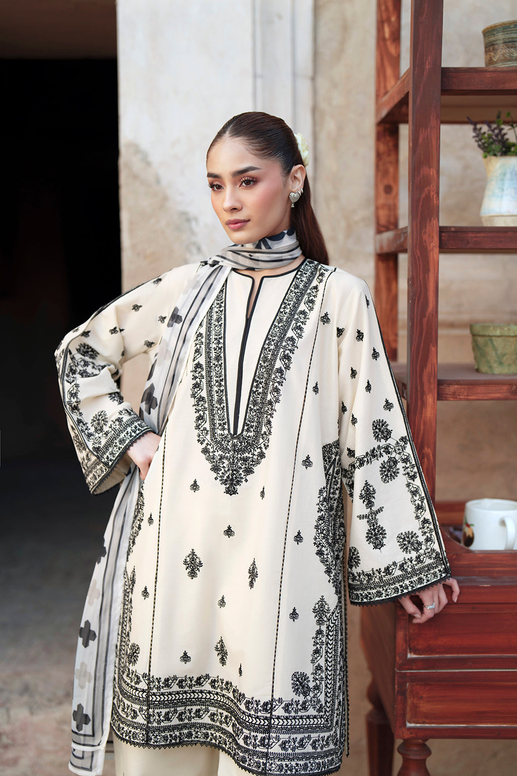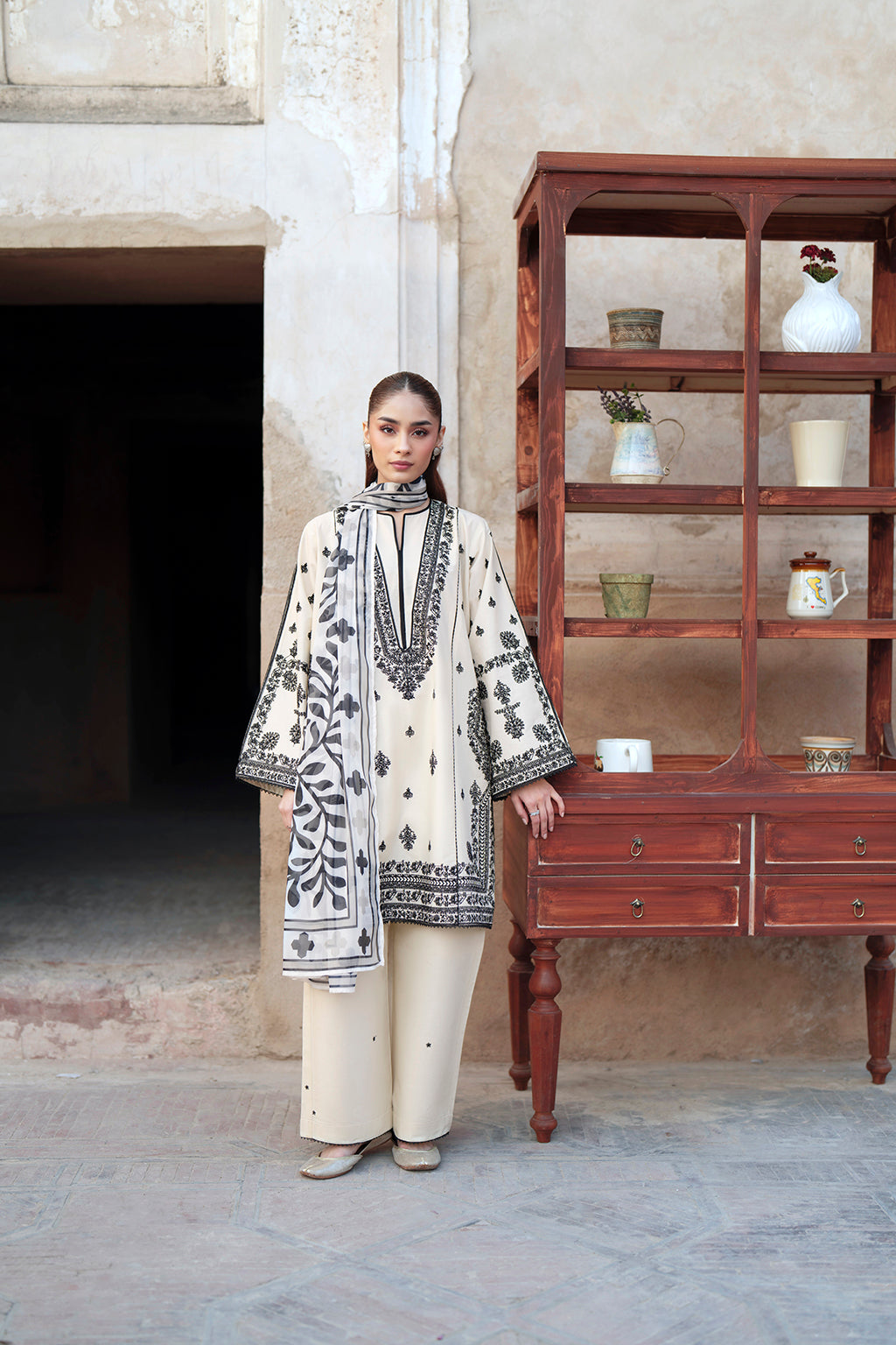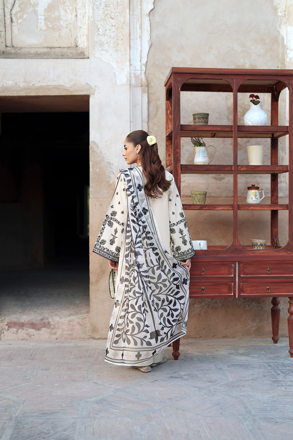 A monochrome black and white set built on balanced florals and defined panel embroidery. The contrast creates a crisp, composed look, while the silk dupatta brings a smoother element for a refined finish.