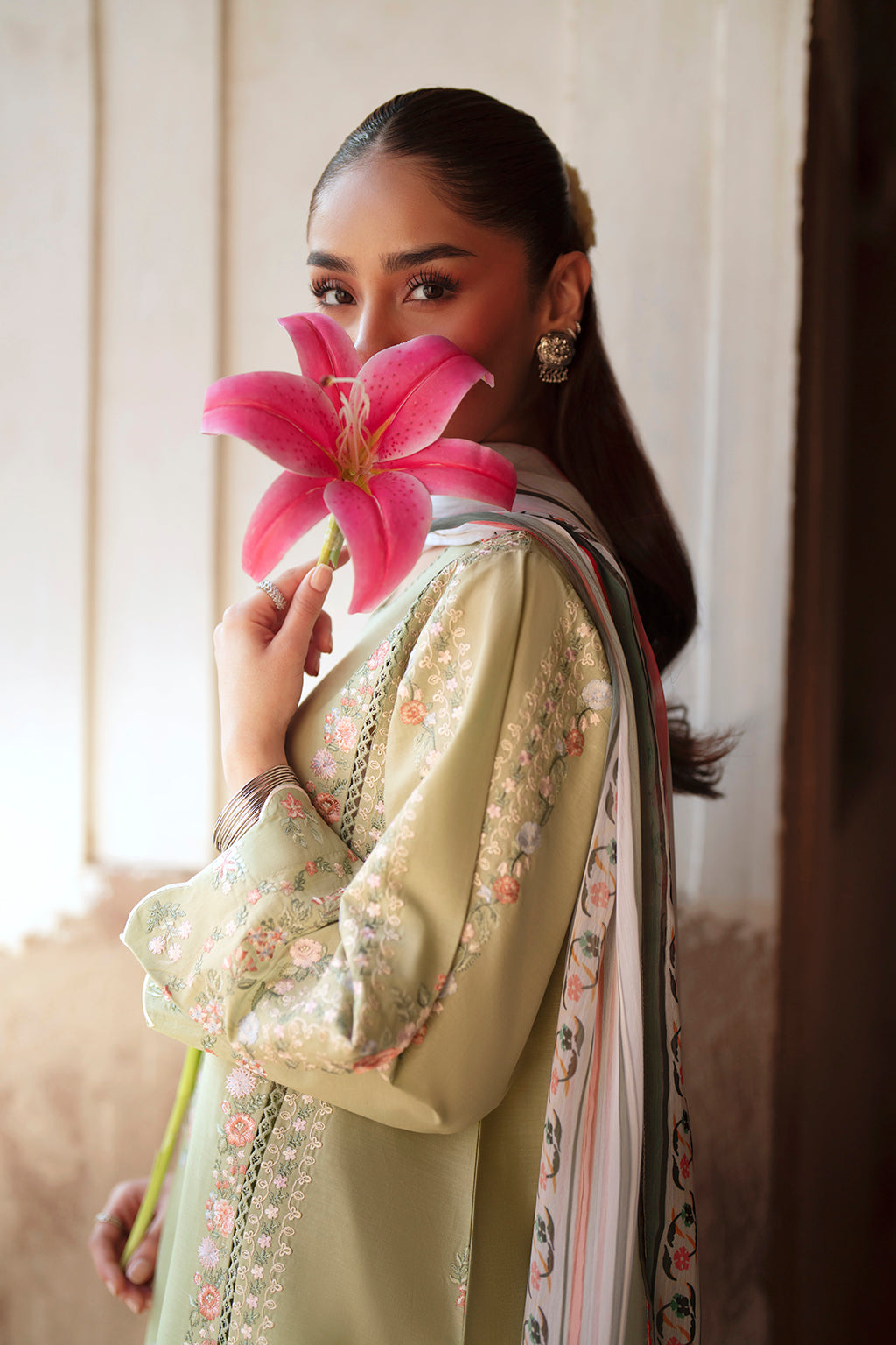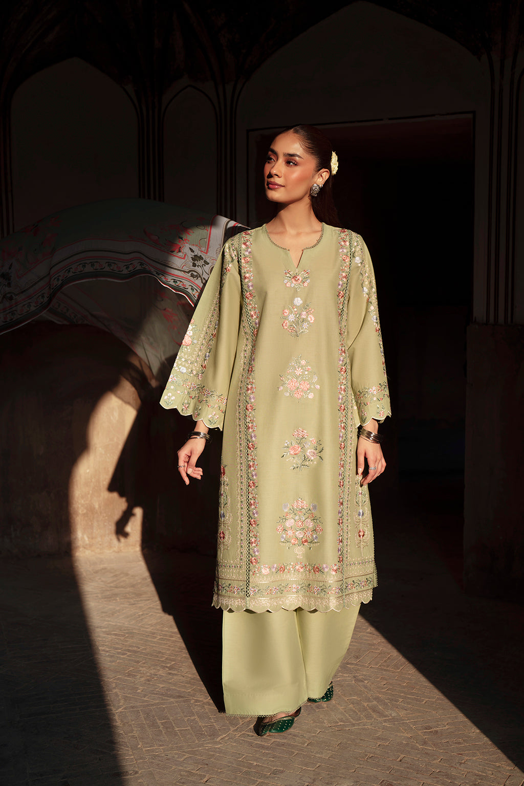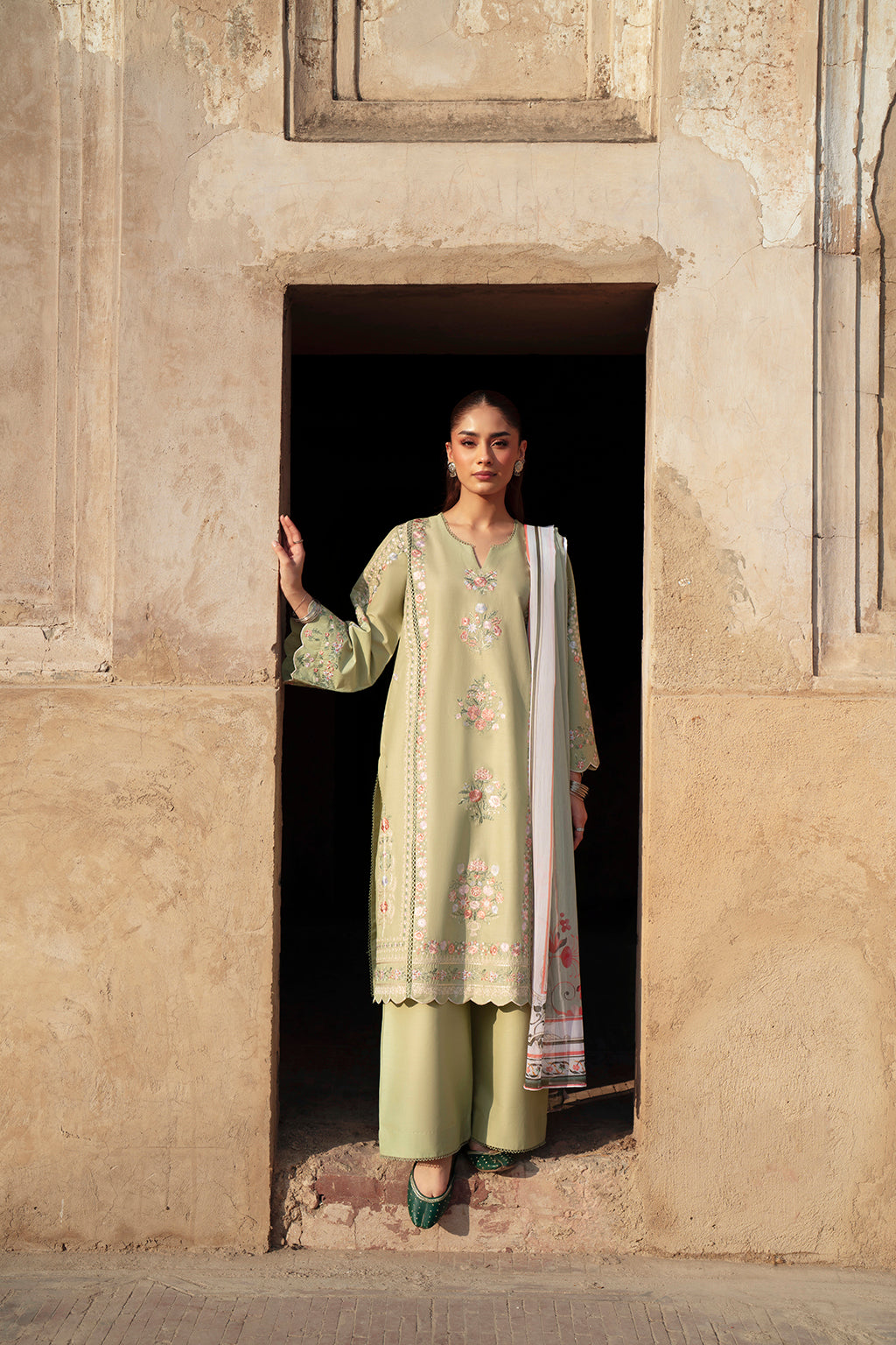 A pastel green outfit with fine embroidery, soft panels, and calm tones. The composed front layout, paired with embroidered sleeves, creates a neat structure, while the chiffon dupatta adds a refreshing finish, ideal for warm weather.