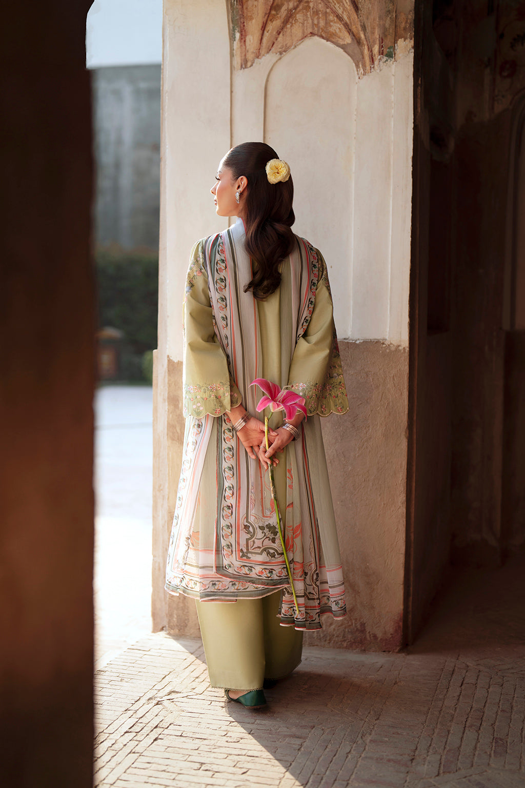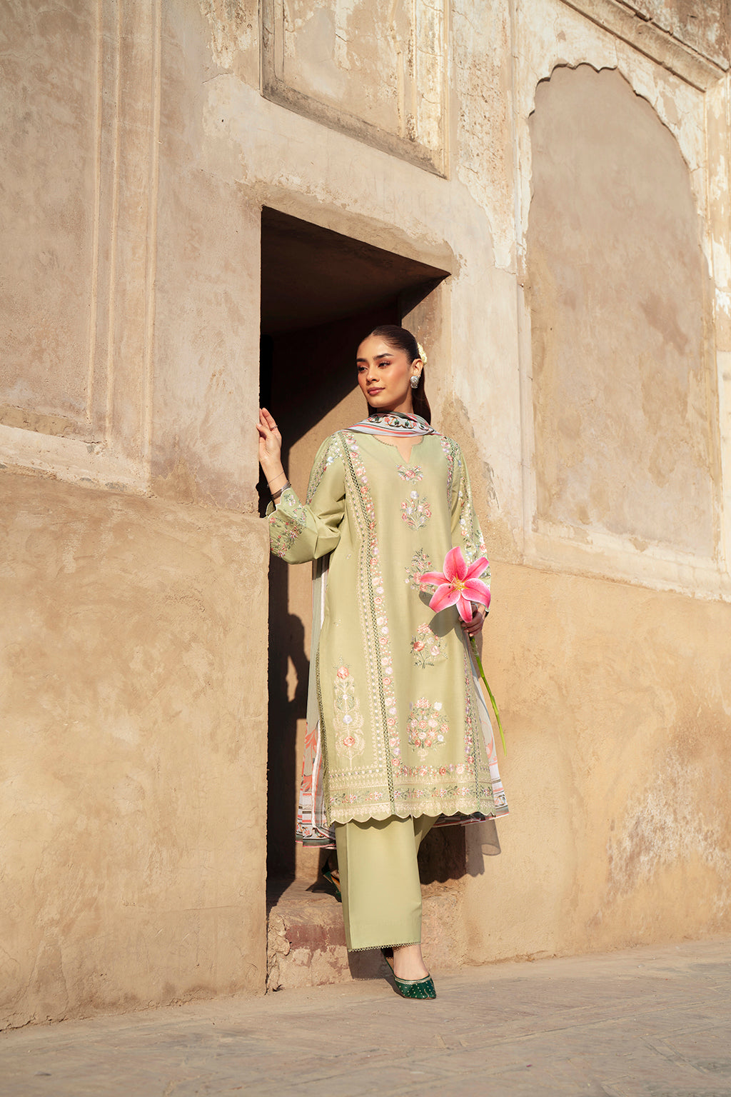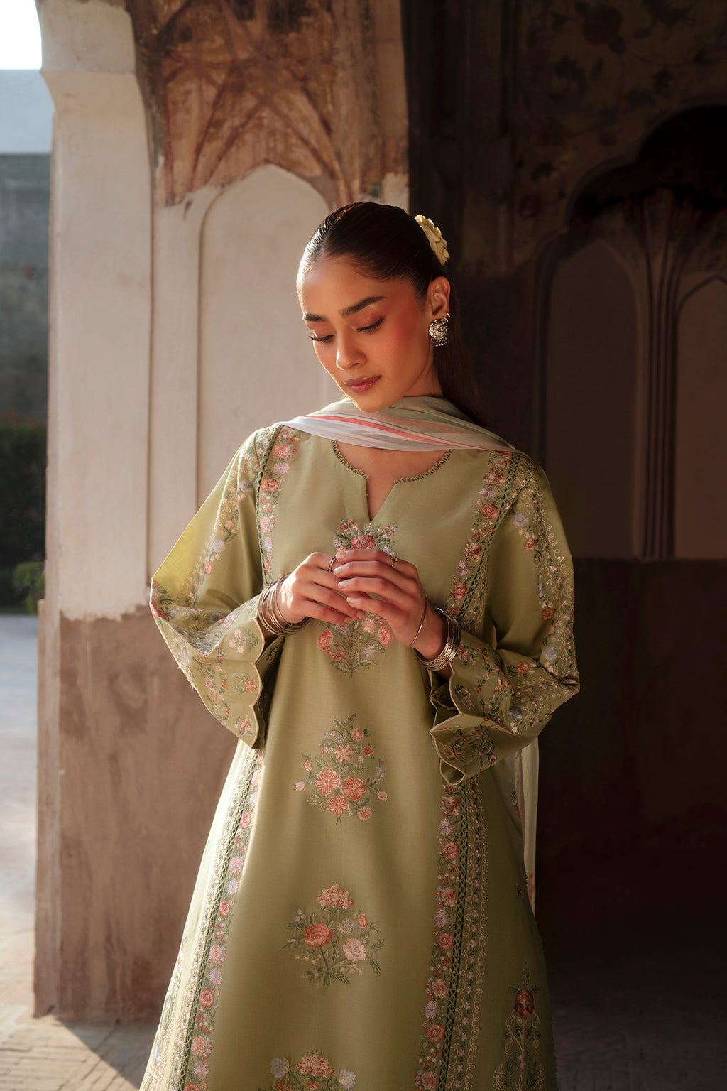A pastel green outfit with fine embroidery, soft panels, and calm tones. The composed front layout, paired with embroidered sleeves, creates a neat structure, while the chiffon dupatta adds a refreshing finish, ideal for warm weather.