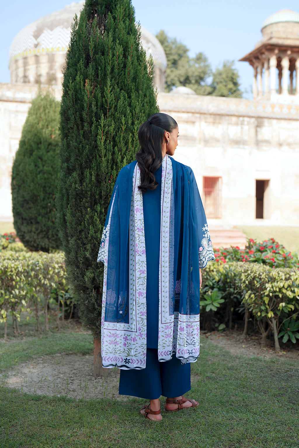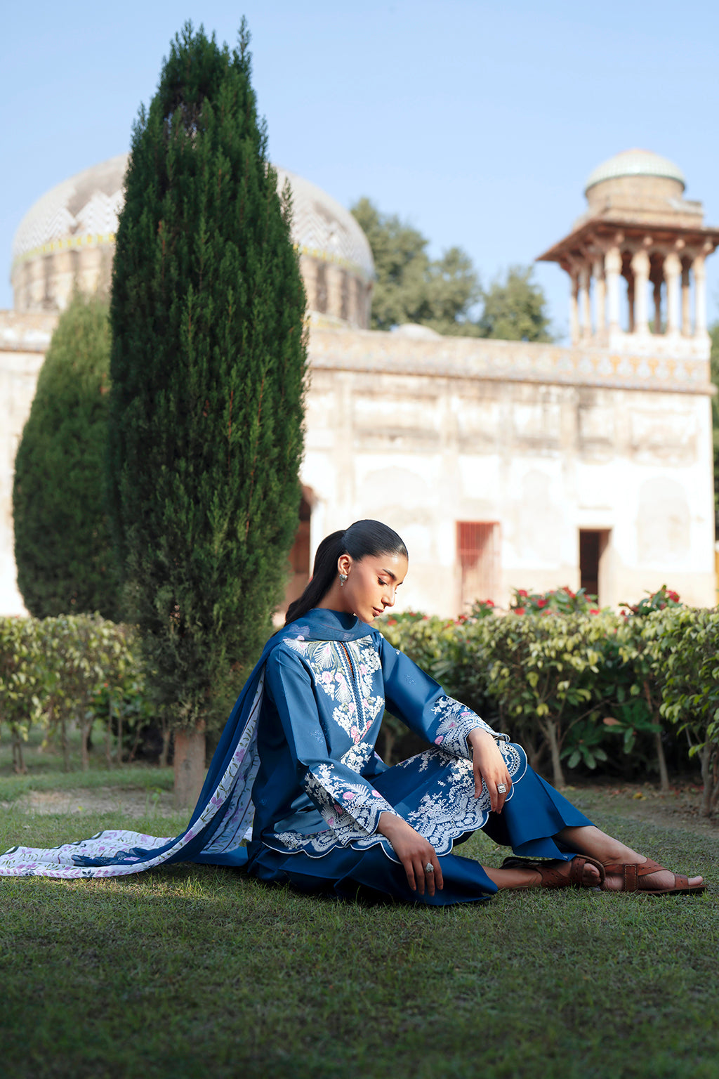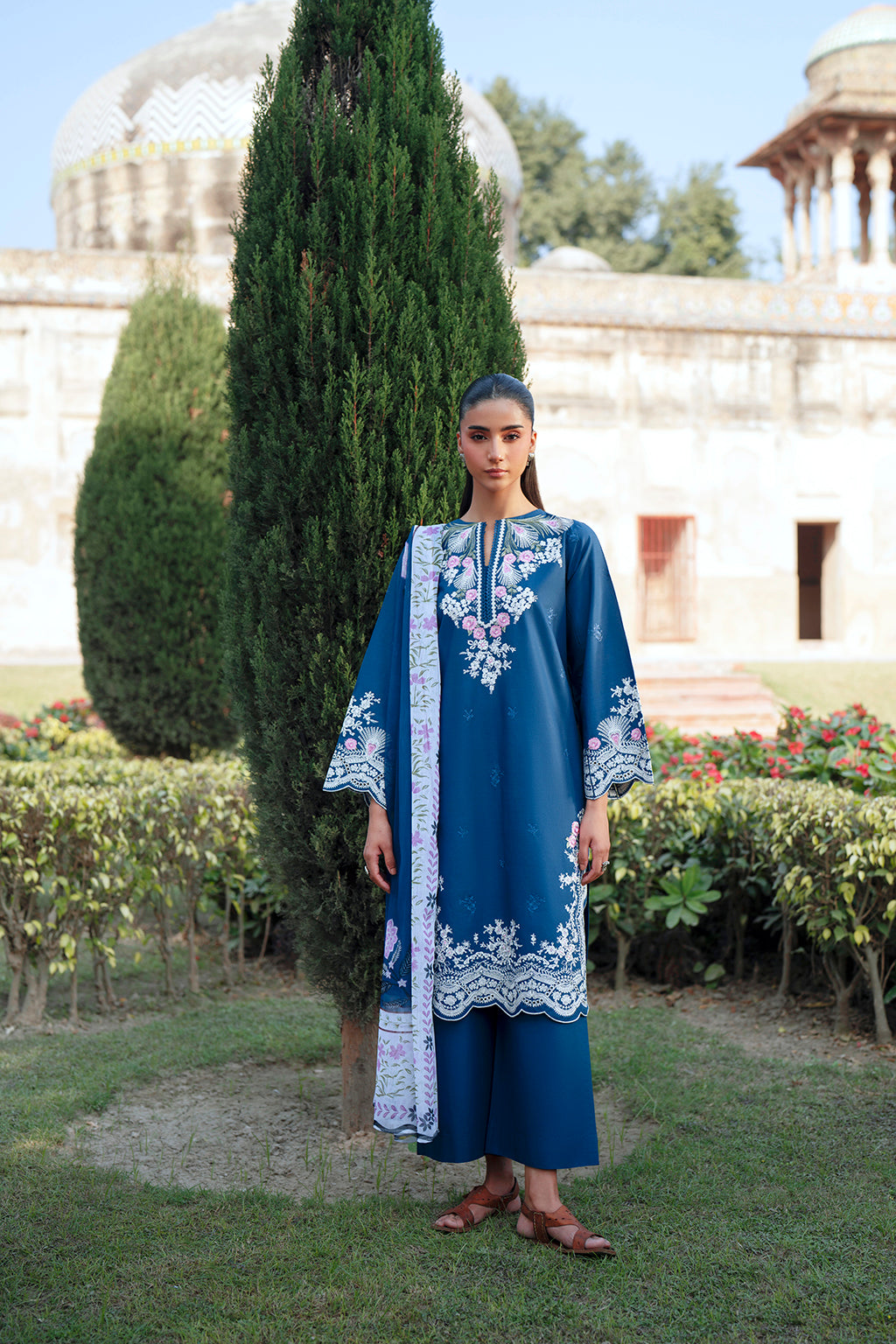 A navy design crafted with thoughtful embroidery that stands out against the deep base. The sleeve detailing adds structure, and the chiffon dupatta gives a light contrast, making this outfit suitable for both day and evening styling.