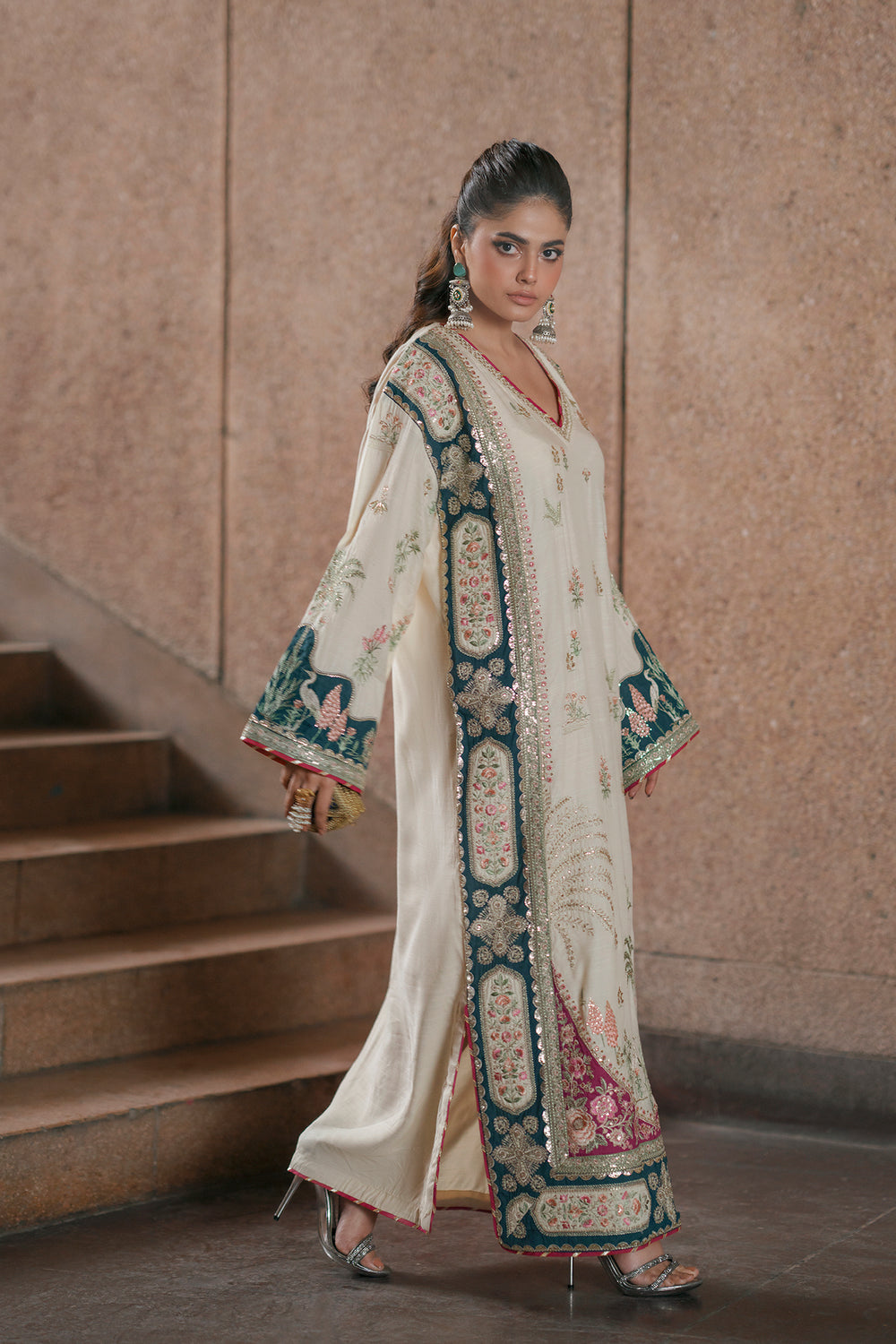 Elevate your wardrobe with this beautifully embroidered shirt, featuring delicate pink, teal, and green floral and botanical embroidery. The intricate detailing highlights the V-neckline and bell-shaped sleeves, flowing gracefully down the length of the shirt, with extra detail near the hem for a refined finish. The relaxed A-line silhouette and soft kimono-style sleeves create an effortless blend of traditional charm and modern elegance. Ideal for formal occasions or elegant evening wear, this statement piece reflects fine craftsmanship and timeless style, making it a standout addition to your wardrobe.