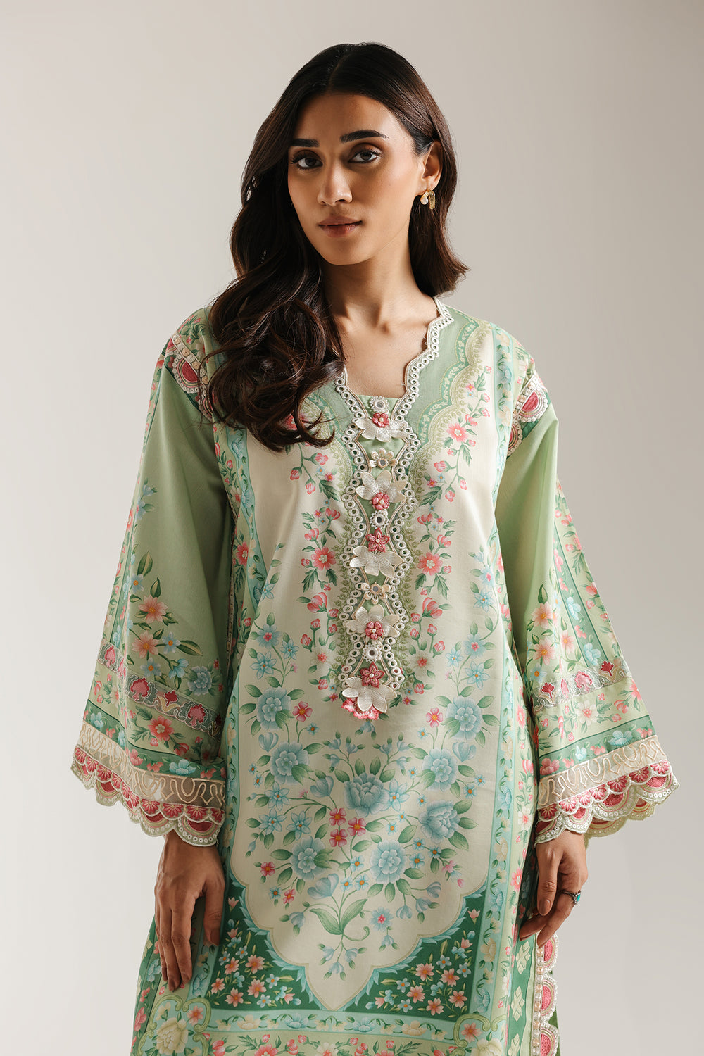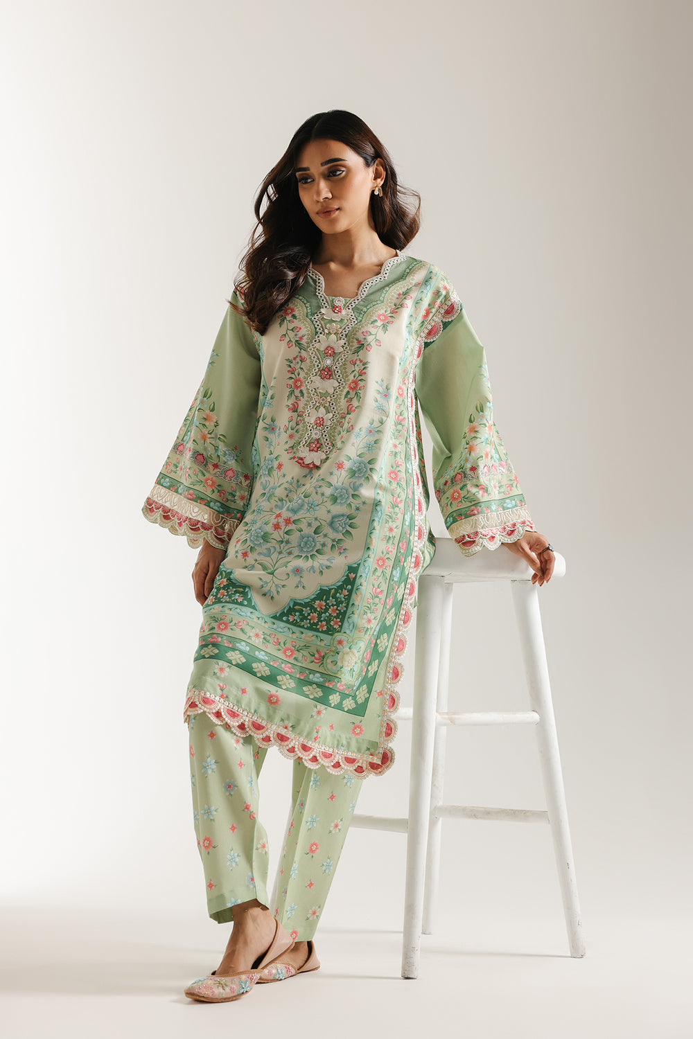 Bask in the fresh elegance of this exquisite mint green printed and embroidered Suit. The straight-cut kurta features a beautiful all-over mughal-inspired floral print in delicate shades of pink, dusty rose, and olive green. The neckline is lavishly detailed with intricate floral embroidery and embellishments, creating a stunning focal point. The wide sleeves and hem are finished with coordinating printed borders and delicate lace trim. The ensemble is perfectly matched with comfortable shalwar featuring a subtle floral print and elegant hem detail, creating a harmonious and graceful look.