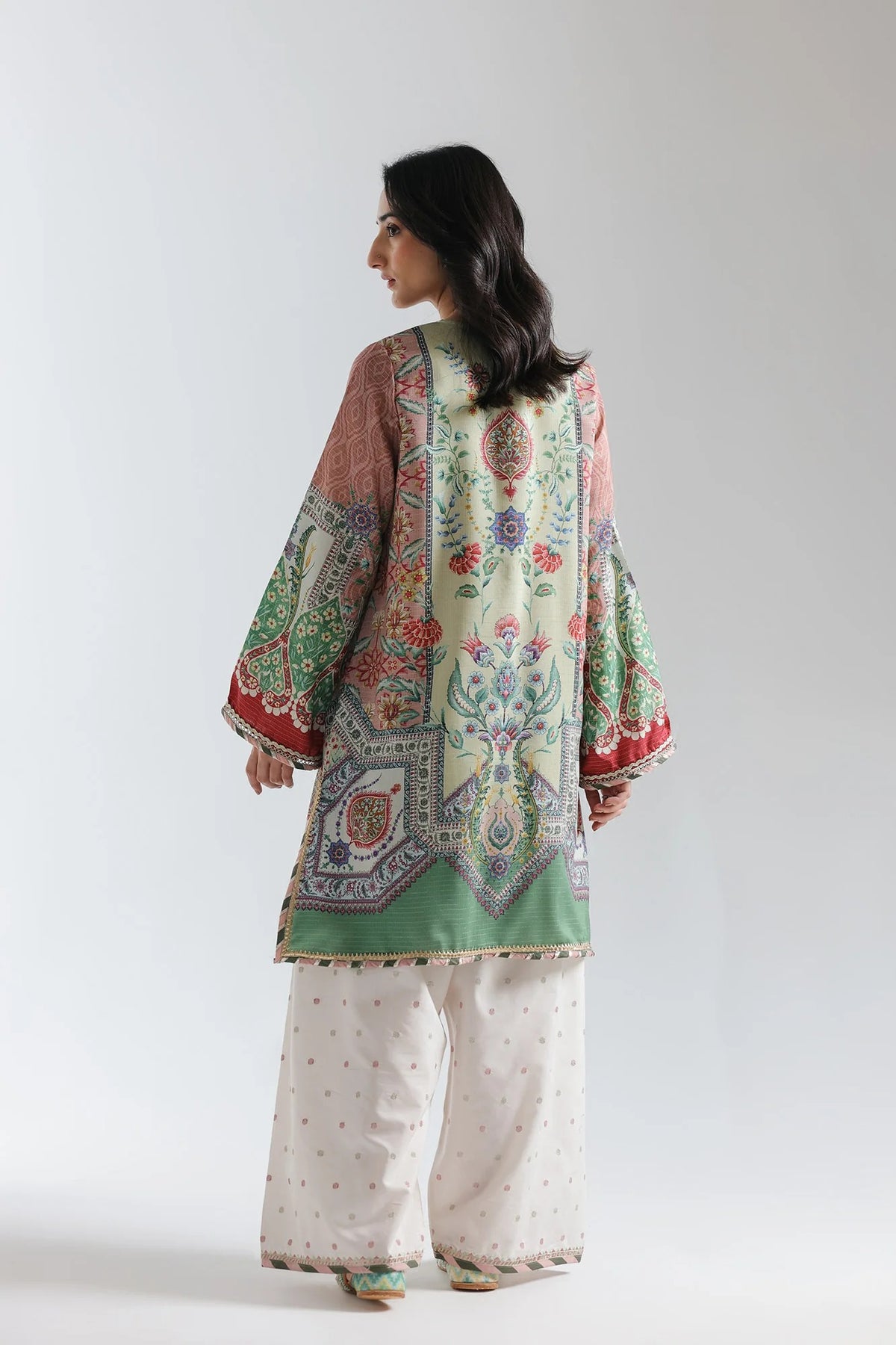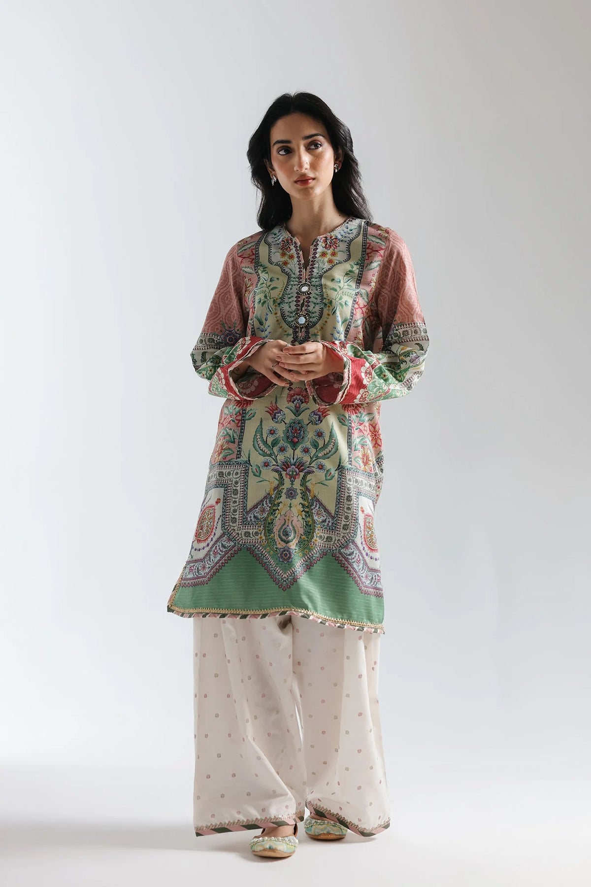 This exquisite embroidered suit features a soft mint-green base adorned with intricate paisley motifs in rich jewel tones—emerald, rust, and gold—creating visual depth and sophistication. A contrasting reddish-pink shoulder detail and vibrant cuff bands add dynamic movement, while the deep green border at the hemline grounds the design. The band collar with subtle button detailing maintains refined elegance. Paired with cream-colored palazzos featuring delicate scatter patterns, this mid-thigh length ensemble balances traditional artistry with modern wearability, perfect for festive occasions or elevated everyday styling.