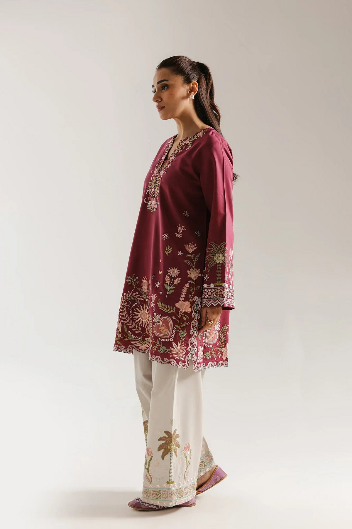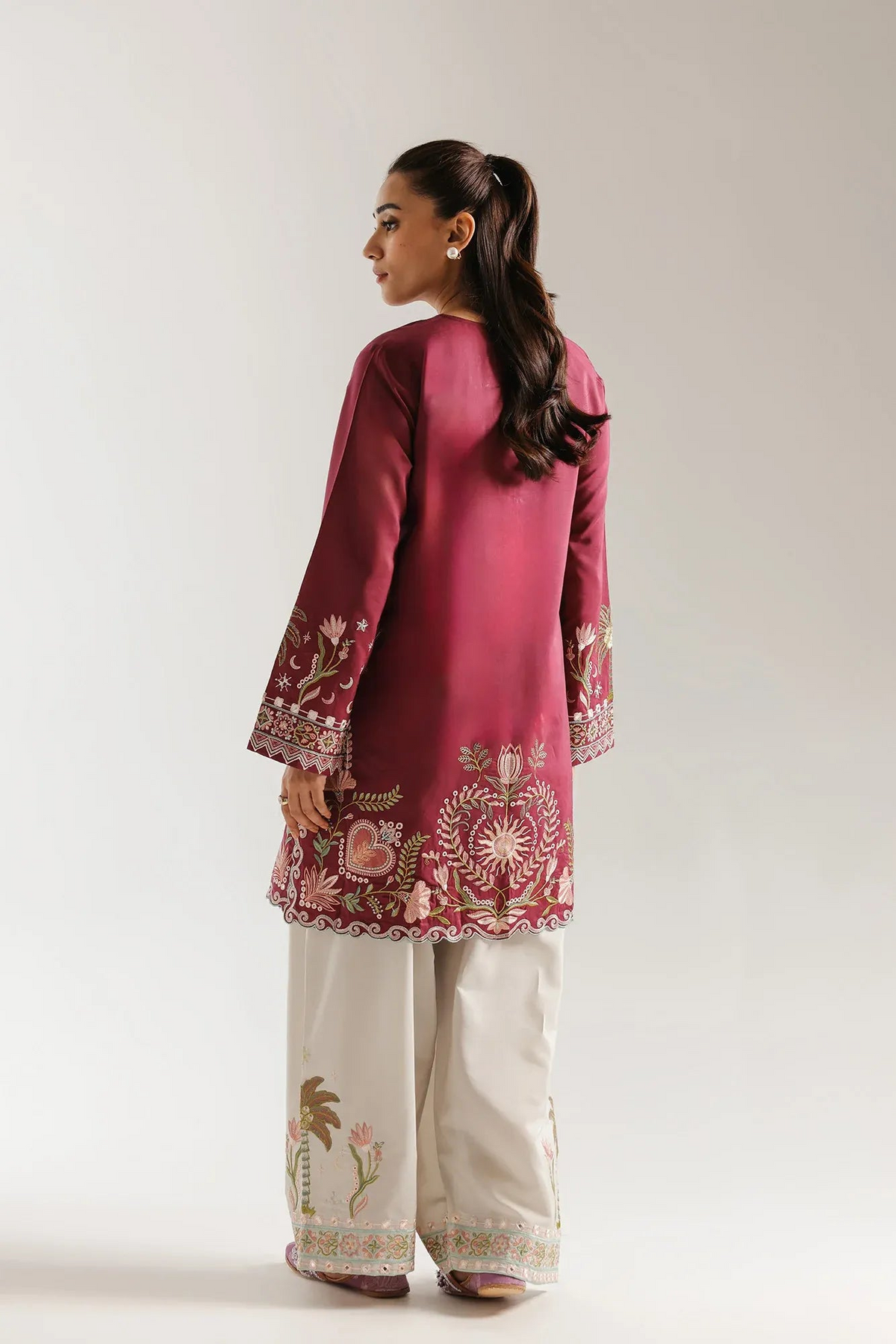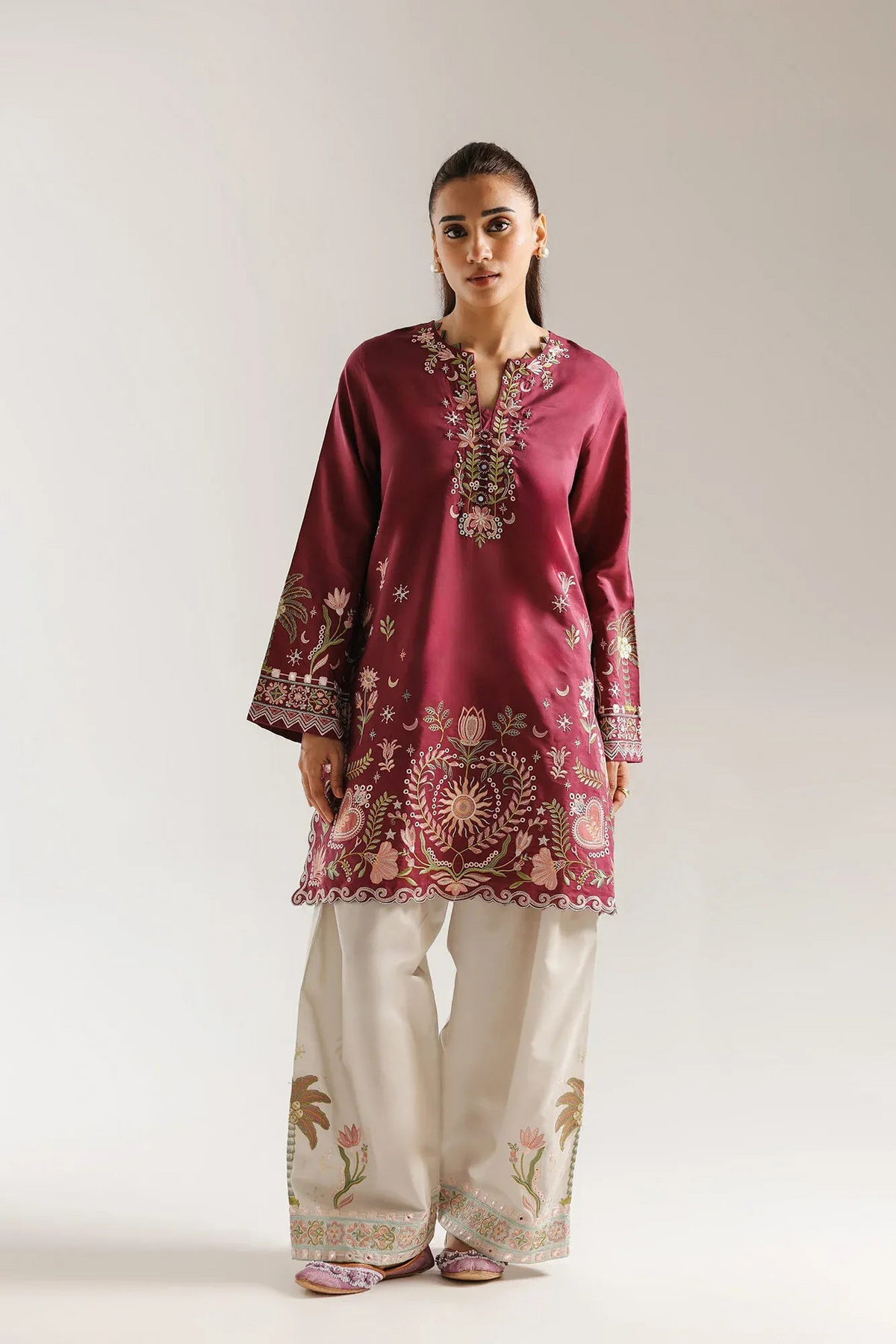 Bask In The Rich, Lustrous Glow Of This Deep Maroon Satin Shirt, A Garment That Beautifully Marries Celestial Inspiration With Vibrant Botanical Artistry. The Shirt Features A Sophisticated Split Neckline, Intricately Framed With Pink And Sage Floral Threadwork That Cascades Into A Delicate Central Vine. The Centerpiece Of This Design Is The Elaborate Sunburst And Tulip Motif At The Hem, Rendered In Vivid Pastels And Surrounded By A Unique Laser-cut Scalloped Edge. The Statement Sleeves Echo This Craftsmanship With Dense Embroidery Featuring Palm Trees, Crescents, And Blooming Flora, Finished With A Structured Geometric Border. Perfectly Paired With Voluminous Ivory Shalwar That Showcase Coordinating Tropical Embroidery At The Ankles, This Ensemble Offers A Regal And Spirited Look For Any Festive Occasion.