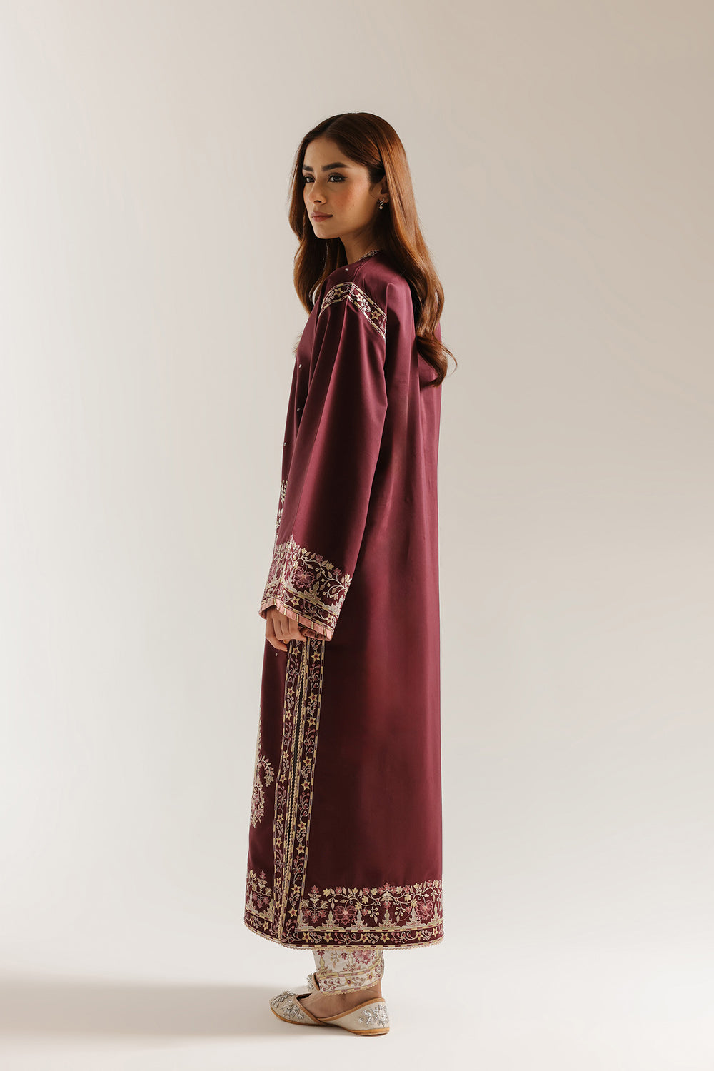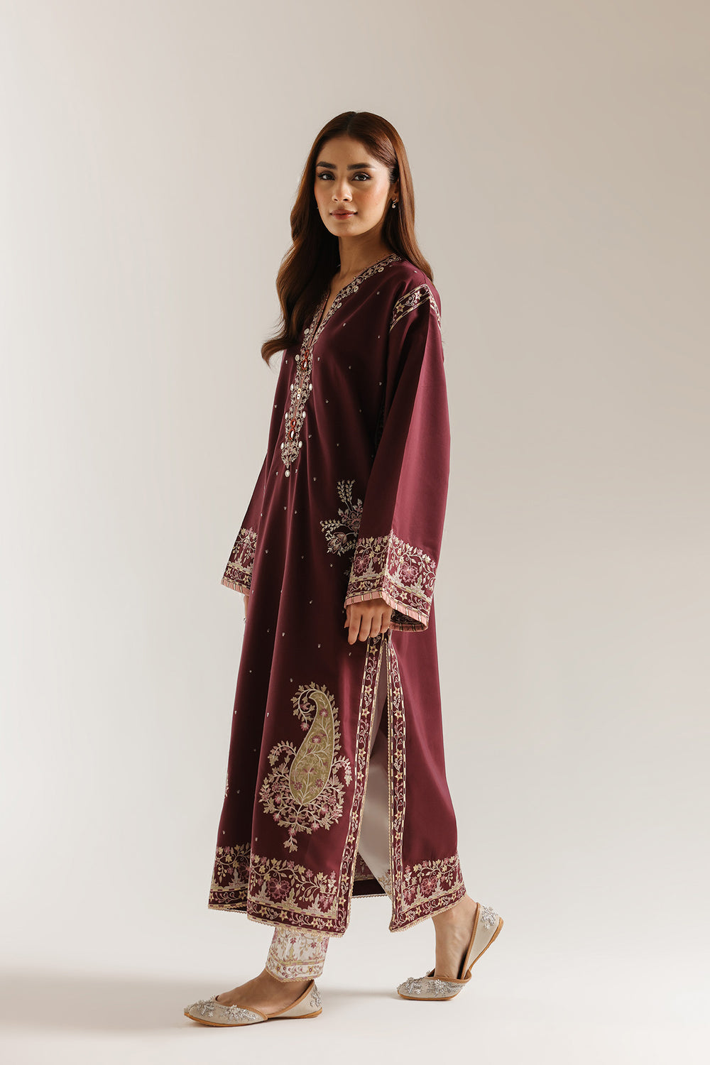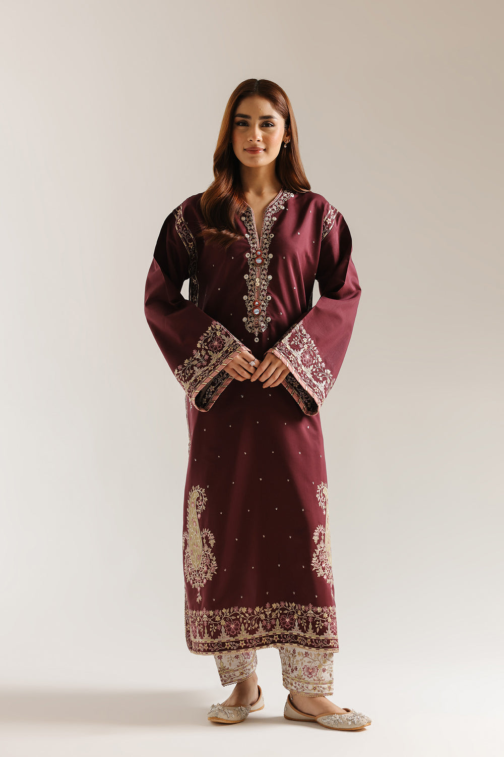 Indulge in the deep, regal tones of this exquisite two-piece ensemble, rendered in a luxurious plum-burgundy satin that radiates sophisticated charm. The long shirt is a masterpiece of artisanal detail, featuring a refined split V-neckline lavishly framed with silver and rose-gold embroidery and accented with shimmering mirror-style accents. Tiny, delicate ivory sprigs are scattered across the bodice, adding a subtle starlit texture to the rich fabric. The statement wide sleeves and hemline serve as the focal point of the design, showcasing dense paisley and floral borders that echo traditional heritage artistry. These intricate patterns are rendered in muted gold and cream, providing a soft contrast that elevates the overall silhouette. The look is beautifully completed with matching shalwar, featuring a delicate all-over botanical motif that ensures a polished and cohesive finish. Timeless and commanding, this suit is the premier choice for formal evening celebrations and festive gatherings.