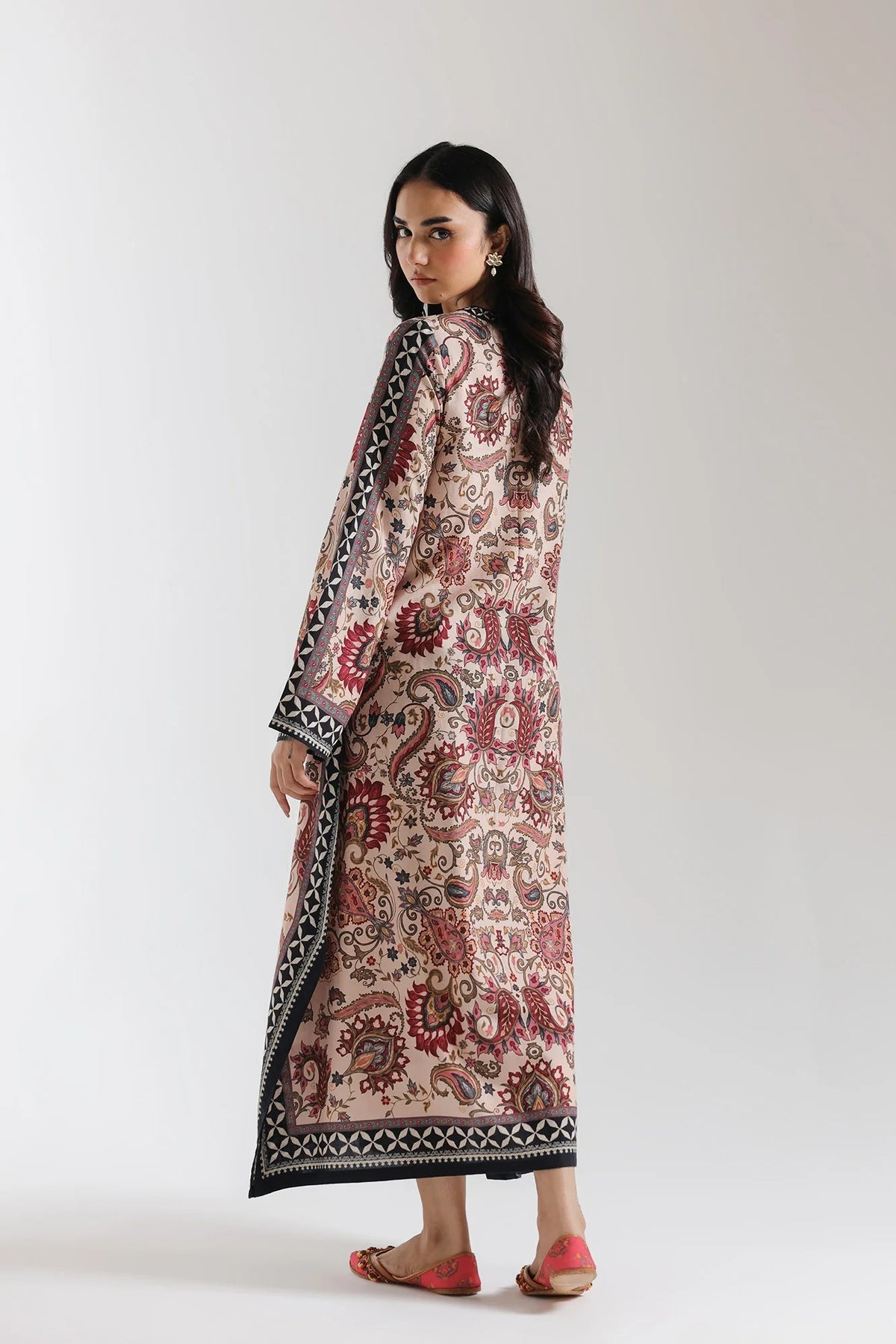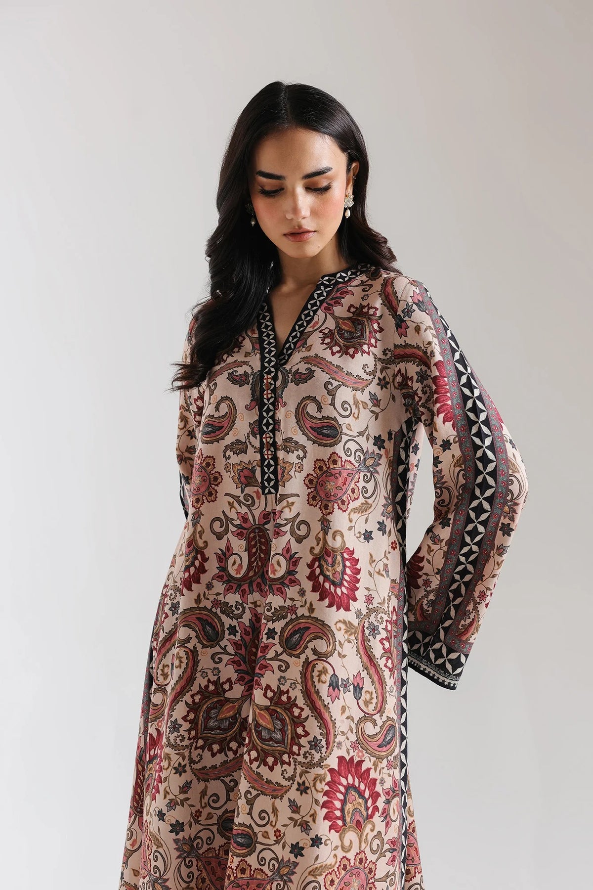 Elevate your wardrobe with this exquisite printed suit, a timeless piece that seamlessly blends traditional craftsmanship with contemporary elegance. Featuring an intricate paisley and floral pattern rendered in rich earth tones—beige, red, black, and brown—this floor-length silhouette offers understated sophistication. The generous, full sleeves are finished with a decorative border, while the refined V-neckline is accented with embroidered detailing. The relaxed, straight cut ensures comfort without compromising on style, making it an ideal choice for both formal occasions and refined everyday wear.