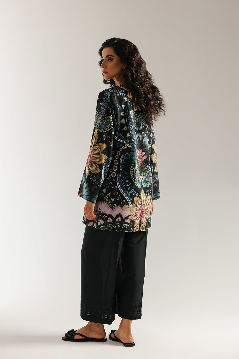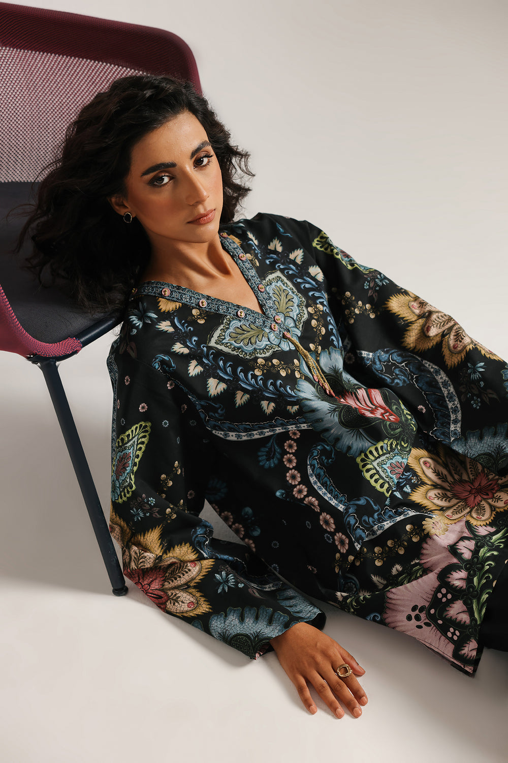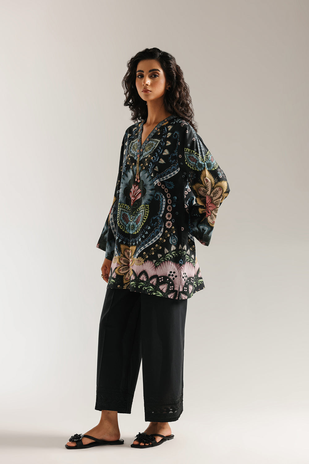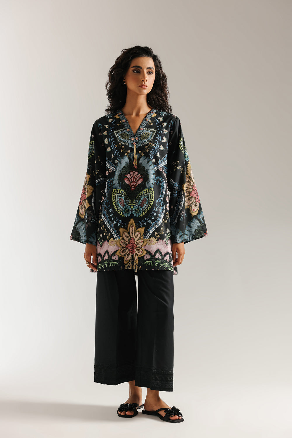 A masterpiece of sophisticated artistry. This stunning black printed kurti is adorned with an intricate and elaborate ornamental print in vibrant shades of blue, pink, and red. The relaxed-fit shirt features a beautiful V-neckline and flared sleeves, making it a statement piece that is both elegant and modern.