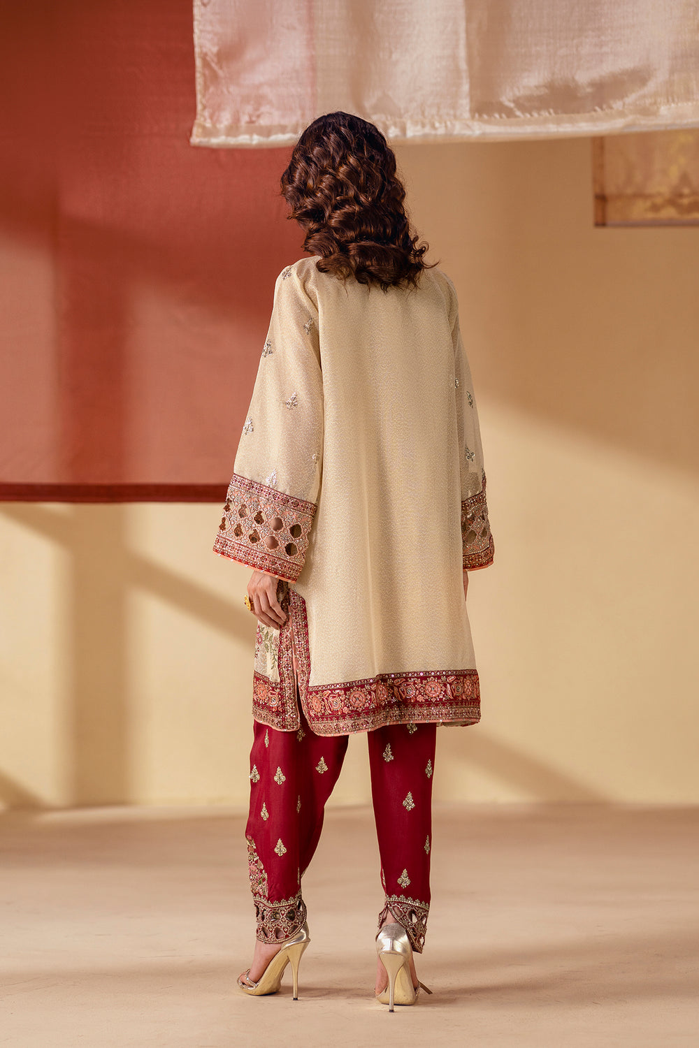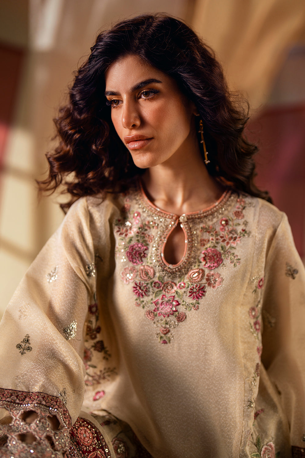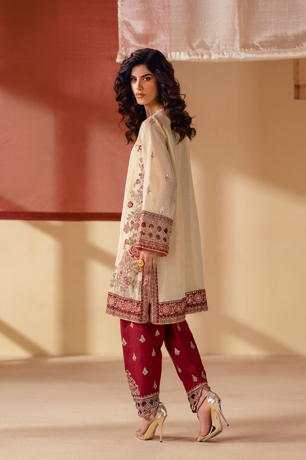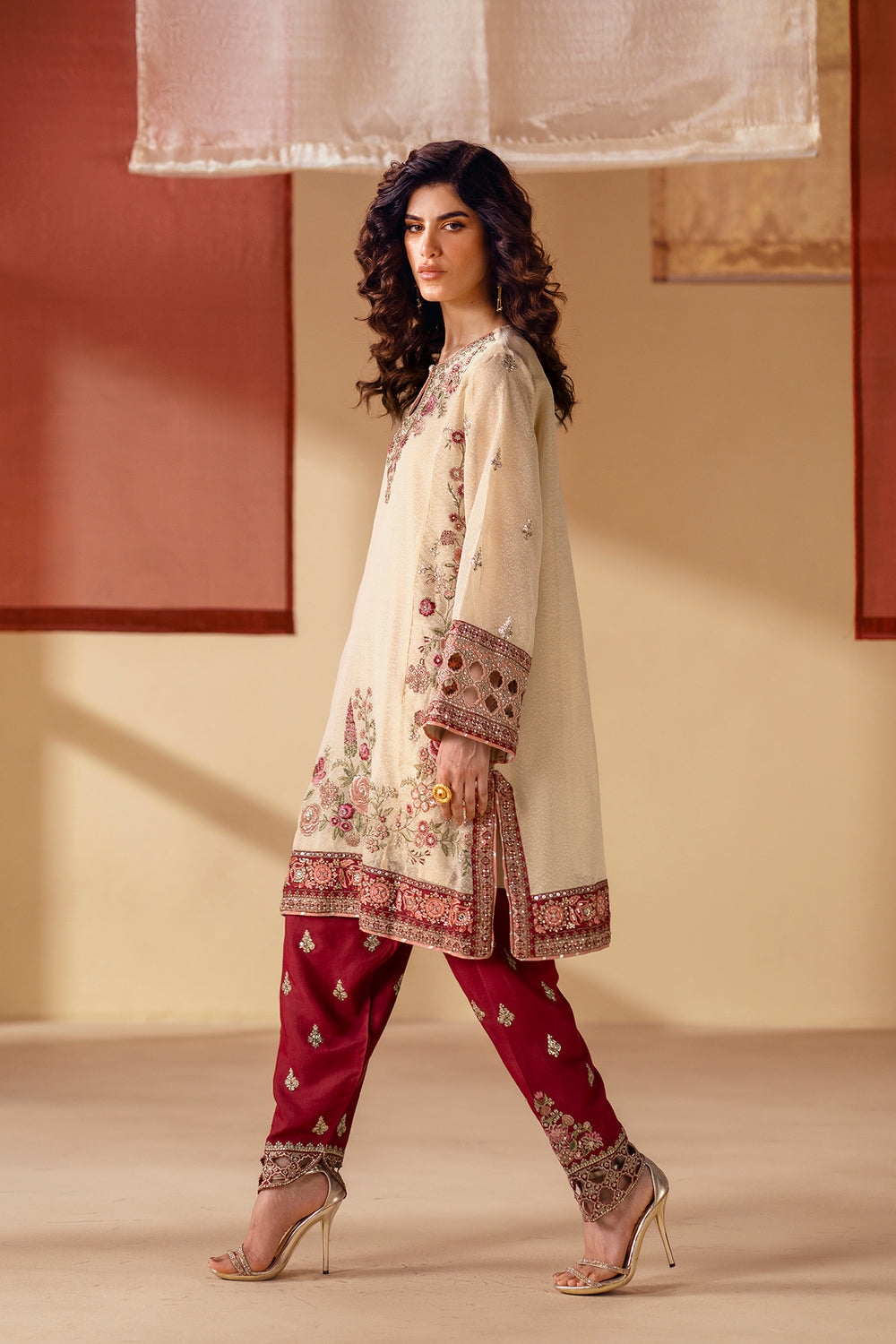 Explore the richness of modern artistry. This stunning suit features a light beige shirt adorned with intricate floral embroidery in vibrant shades of red and green. The look is completed with a beautiful maroon shalwar that is also heavily embroidered with a detailed, matching pattern at the hem. This ensemble is a celebration of striking color and captivating craftsmanship, perfect for making a bold and elegant statement.