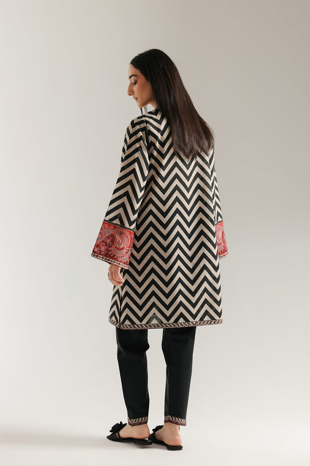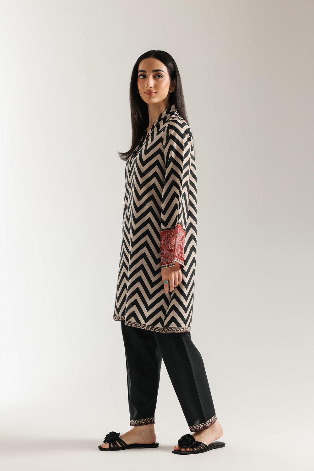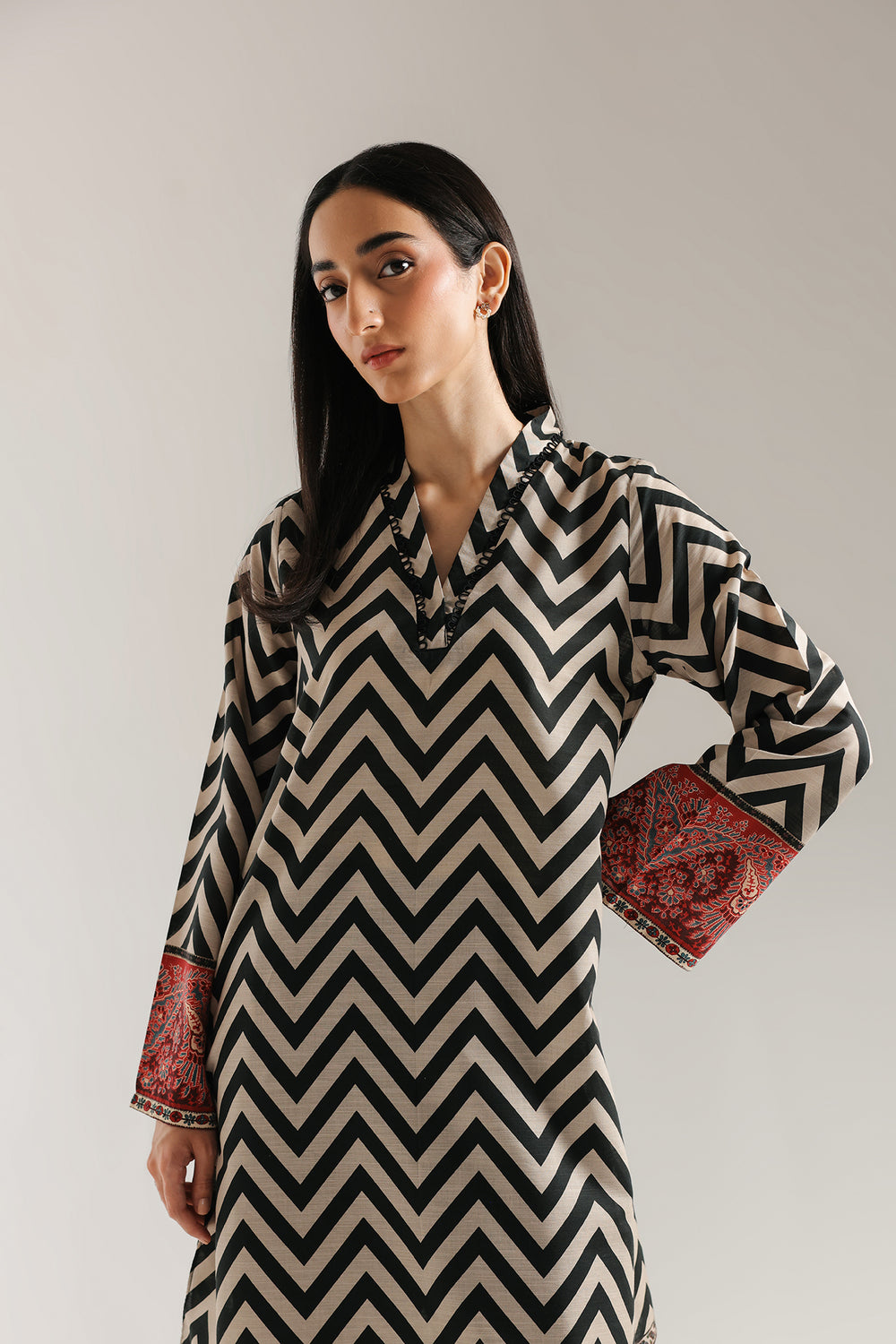 Embrace a bold and modern look with this captivating printed suit. This two-piece ensemble features a classic black and off-white zig-zag pattern throughout the shirt. The sleeves are finished with a contrasting red and black patterned cuff, adding a unique touch to the design. The suit is completed with black shalwar, making it a perfect choice for any occasion.
