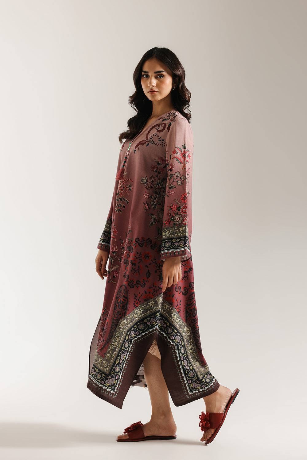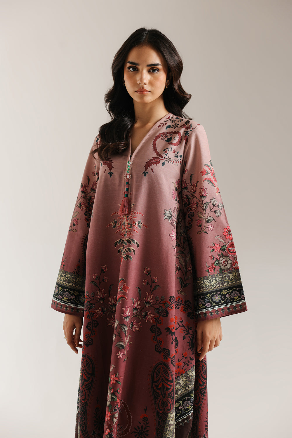 Unveil a look of regal, intricate beauty with this gorgeous dusty rose printed dress. This long, loose fit dress is rendered in a soft mauve/rose fabric and features a rich, all-over traditional print. The elaborate patterns include floral, paisley, and decorative border motifs in shades of deep maroon, olive green, and dark blue. The neckline has a subtle V-slit with a decorative tassel, and the wide sleeves and hem are beautifully finished with detailed borders. This piece offers an effortlessly majestic and comfortable statement look.