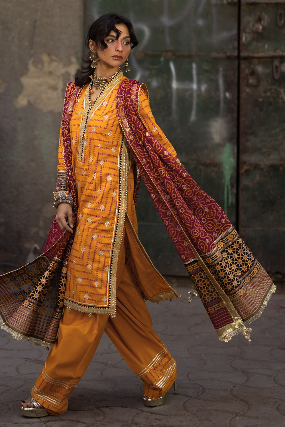 • Embroidered Gold and Lacquer Printed Lawn Shirt Front and Sleeves with Gold and Lacquer Printed Lawn Back and Embroidered Lace for Shirt - 1.75 Meters