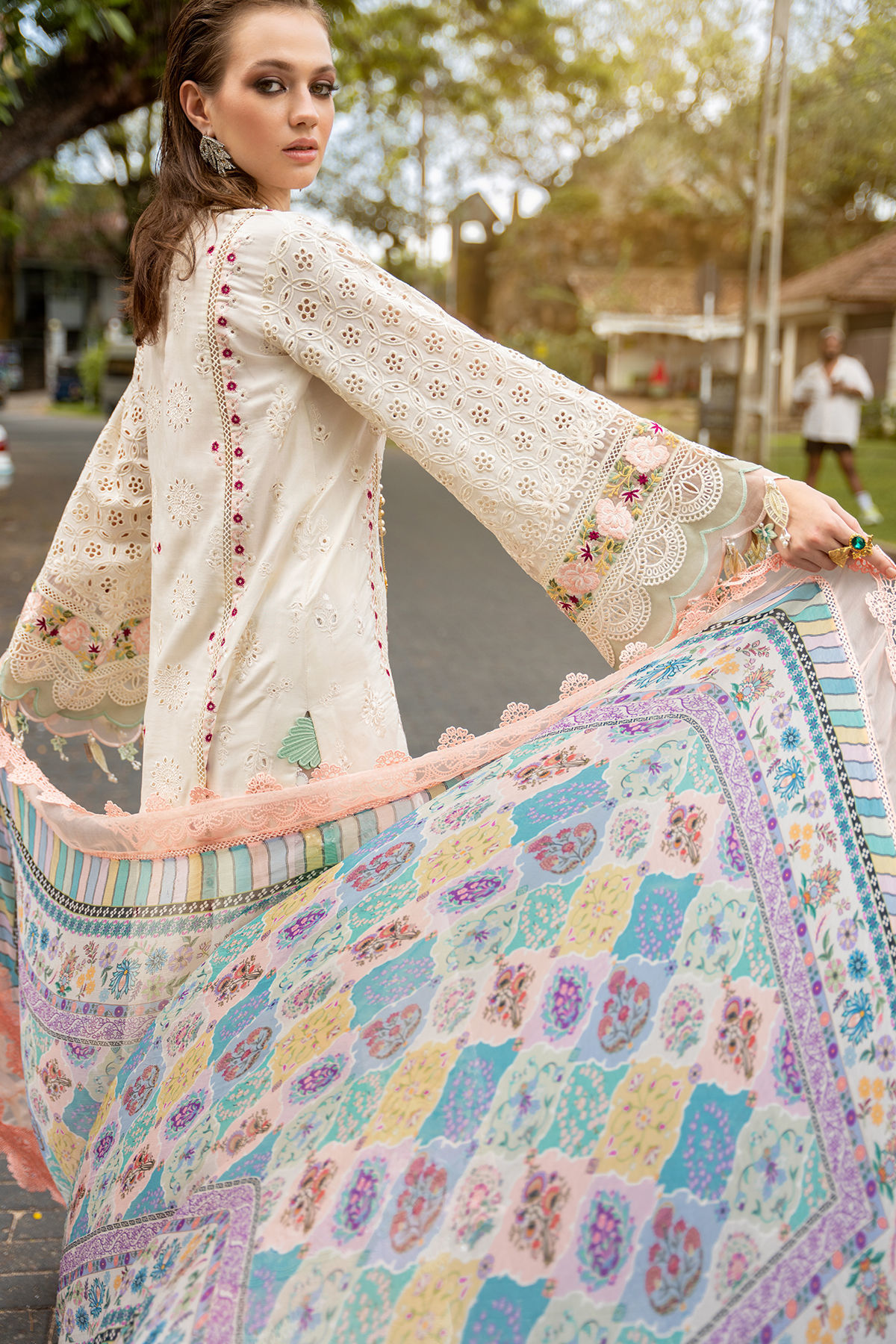 Showcasing a surreal symphony, 'Amal' features subtle minimalism on a dreamy powder pink canvas, the centre front showcases intricate schiffli details. The sheer organza panel on hem with bold silk thread floral details and scalloped embossed borders add an artistic finesse to the ensemble. Bold composed dupatta with floral and geometric details is sure to set you apart this summer season.