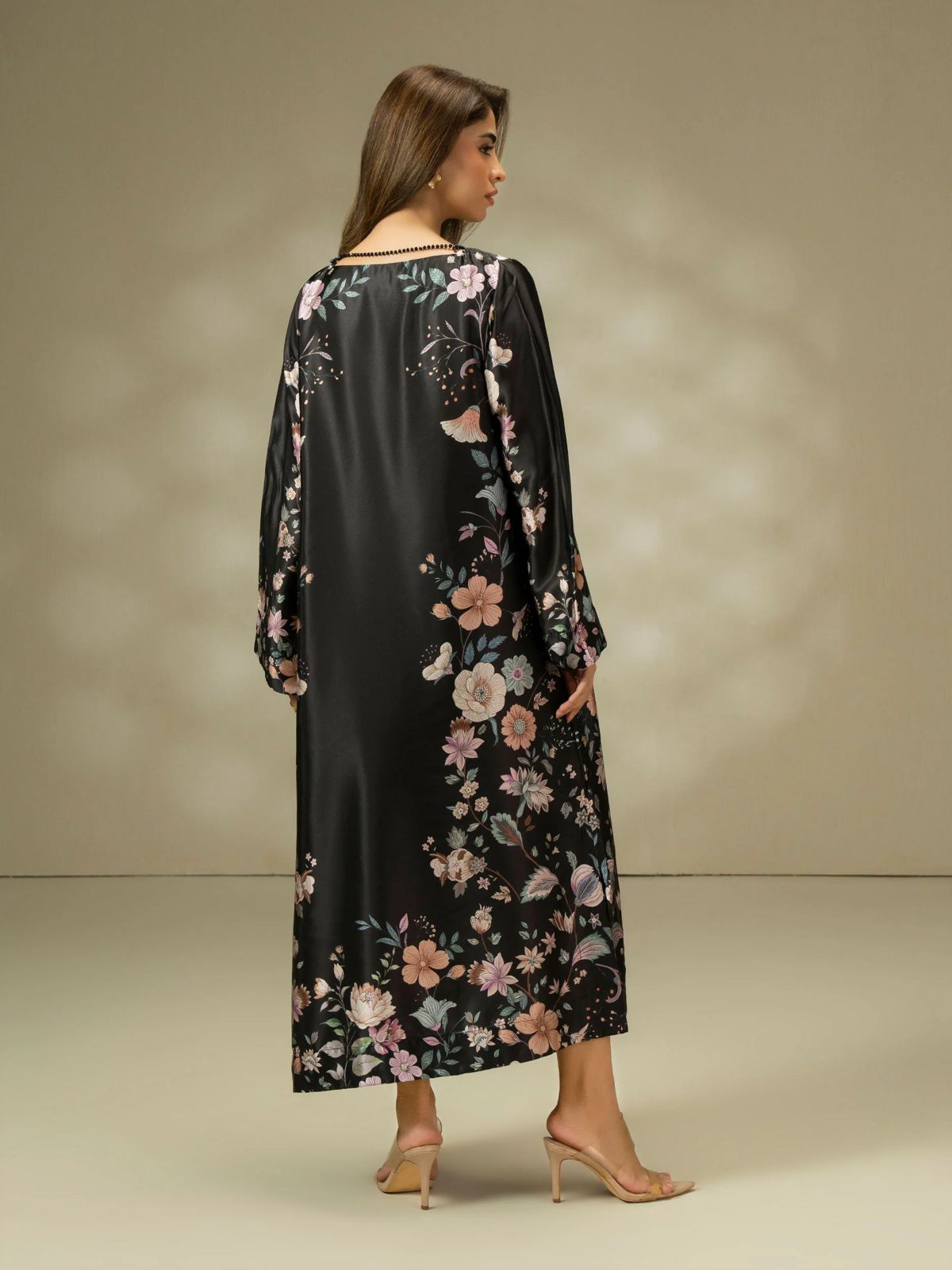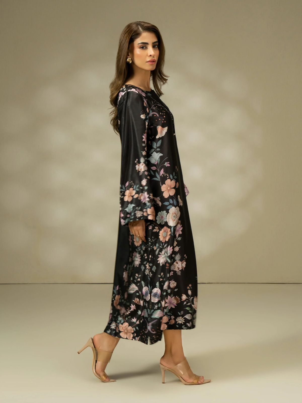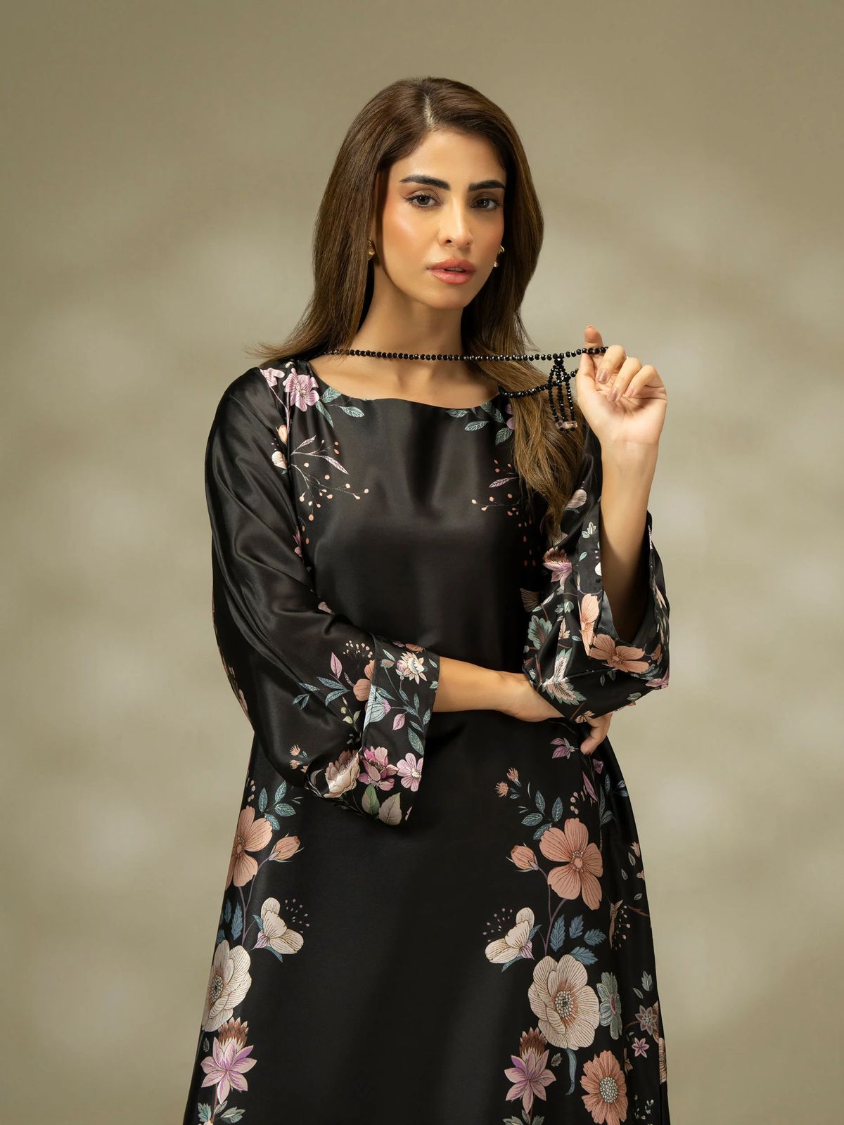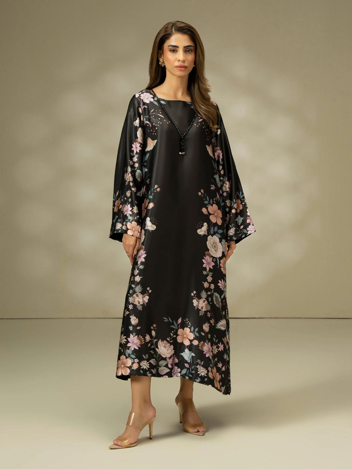 Dress : Printed dress with black beads accessory Side open seams