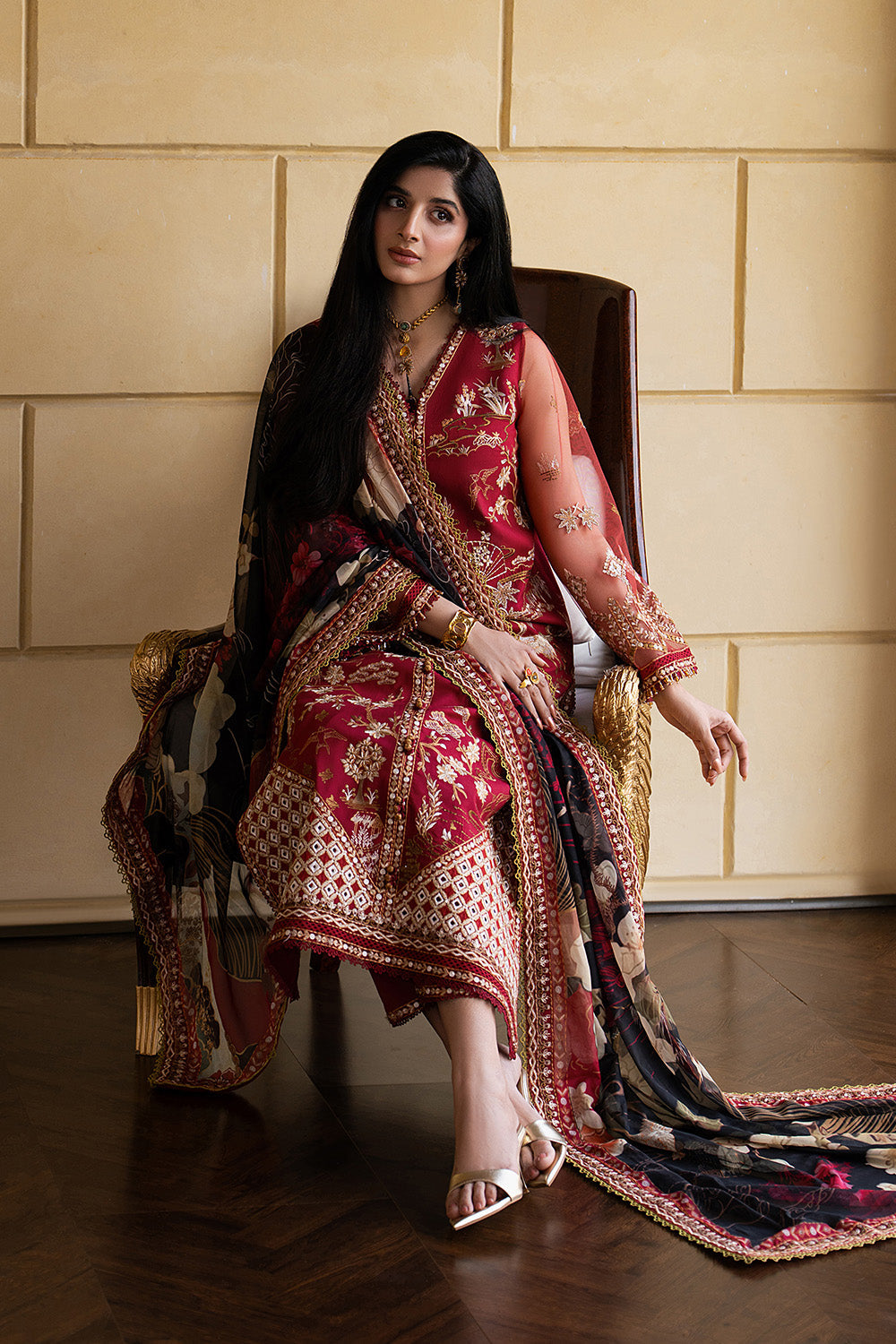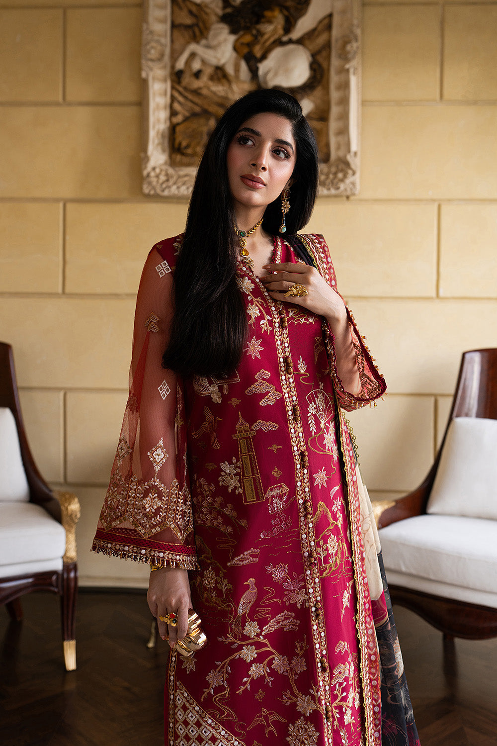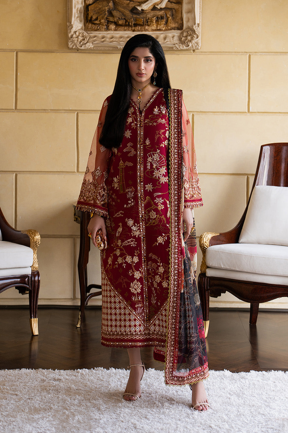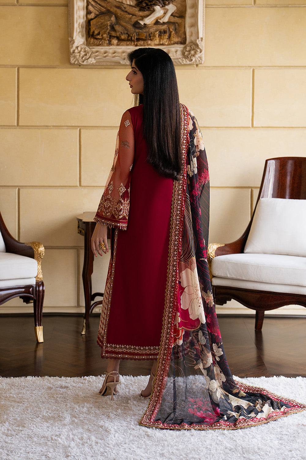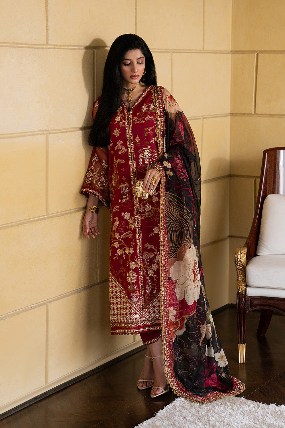 Make a bold yet graceful statement in Maroon with this exquisitely detailed 3-piece prêt ensemble. The lawn shirt features a V-neck, front-open design with button detailing, adorned with all-over embroidery and a delicately finished hem with embroidered borders and lace. Embroidered net sleeves with lace accents and playful tassel details add a touch of charm, paired effortlessly with a basic cambric cotton shalwar finished with an embroidered border. A printed medium silk dupatta framed with four-sided embroidery completes this look of refined sophistication.