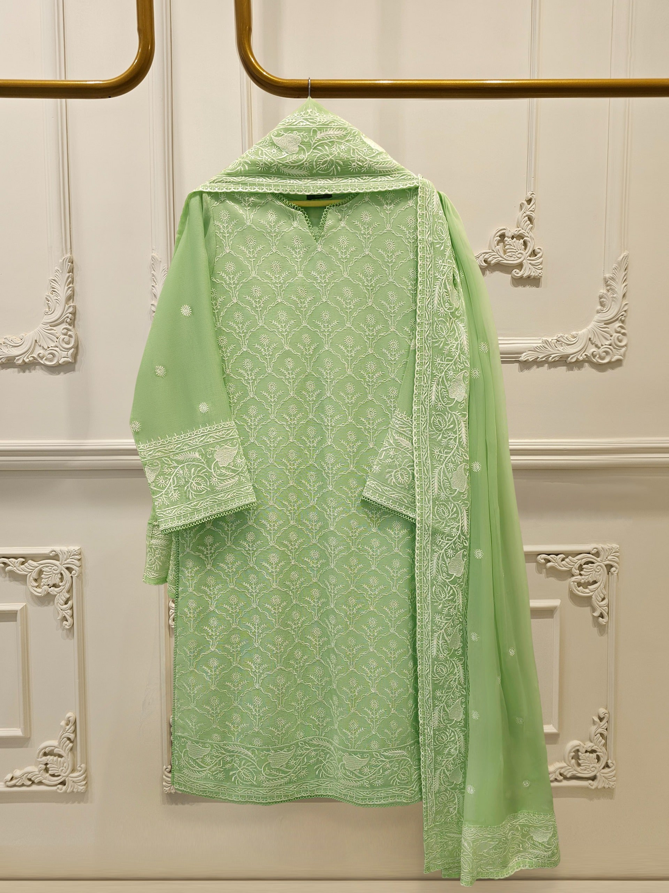 Introducing our elegant embroidered cotton net shirt with pants a perfect choice for those who appreciate intricate detailing and graceful style. Crafted from high-quality cotton net fabric, this shirt offers a lightweight and luxurious feel, allowing you to feel comfortable and chic throughout the day. The set comes with a matching pant which enhances the overall look and adds a touch of finesse to your outfit.