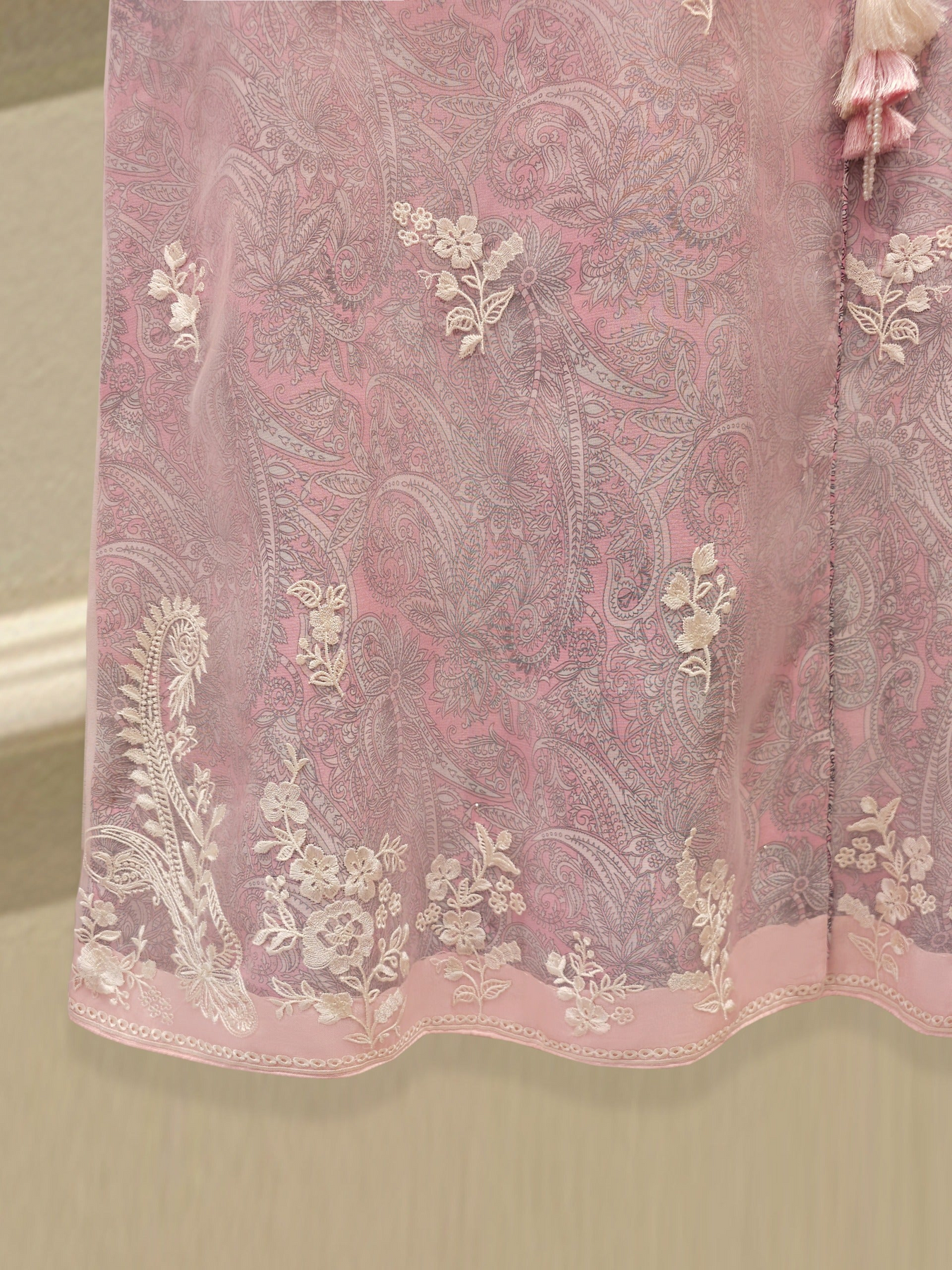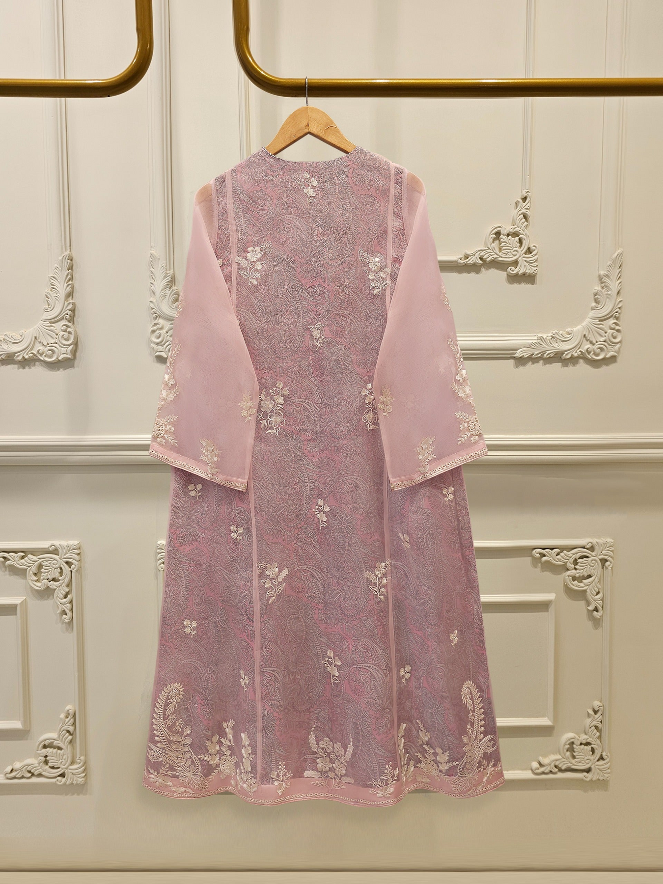 Elevate your style with pink embroidered organza straight shirt crafted with utmost care and attention to detail. The shirt features intricate embroidery on the front and sleeves, adding a touch of timeless charm.