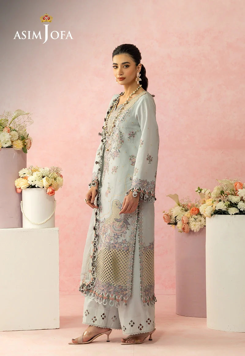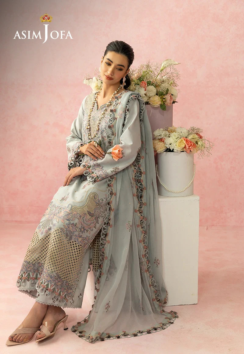 Woven from the silvery hush of a twilight sky, this grey ensemble is a poetic homage to the enduring romance of vintage florals. Like a botanical reverie, the canvas blooms with delicate tea pink, cornflower blue, beige, and sage green threadwork, arranged in an antique-inspired harmony that feels both timeless and graceful. At its core, a heavily embroidered neckline unfolds into an enchanting jaal, where the modern shimmer of holographic accents meets the meticulous artistry of traditional boring techniques—creating an ethereal interplay of light, depth, and texture. Completing this vision of elevated elegance is a finely embroidered chiffon dupatta, drifting effortlessly like a soft cloud and echoing the refined craftsmanship woven throughout the design.