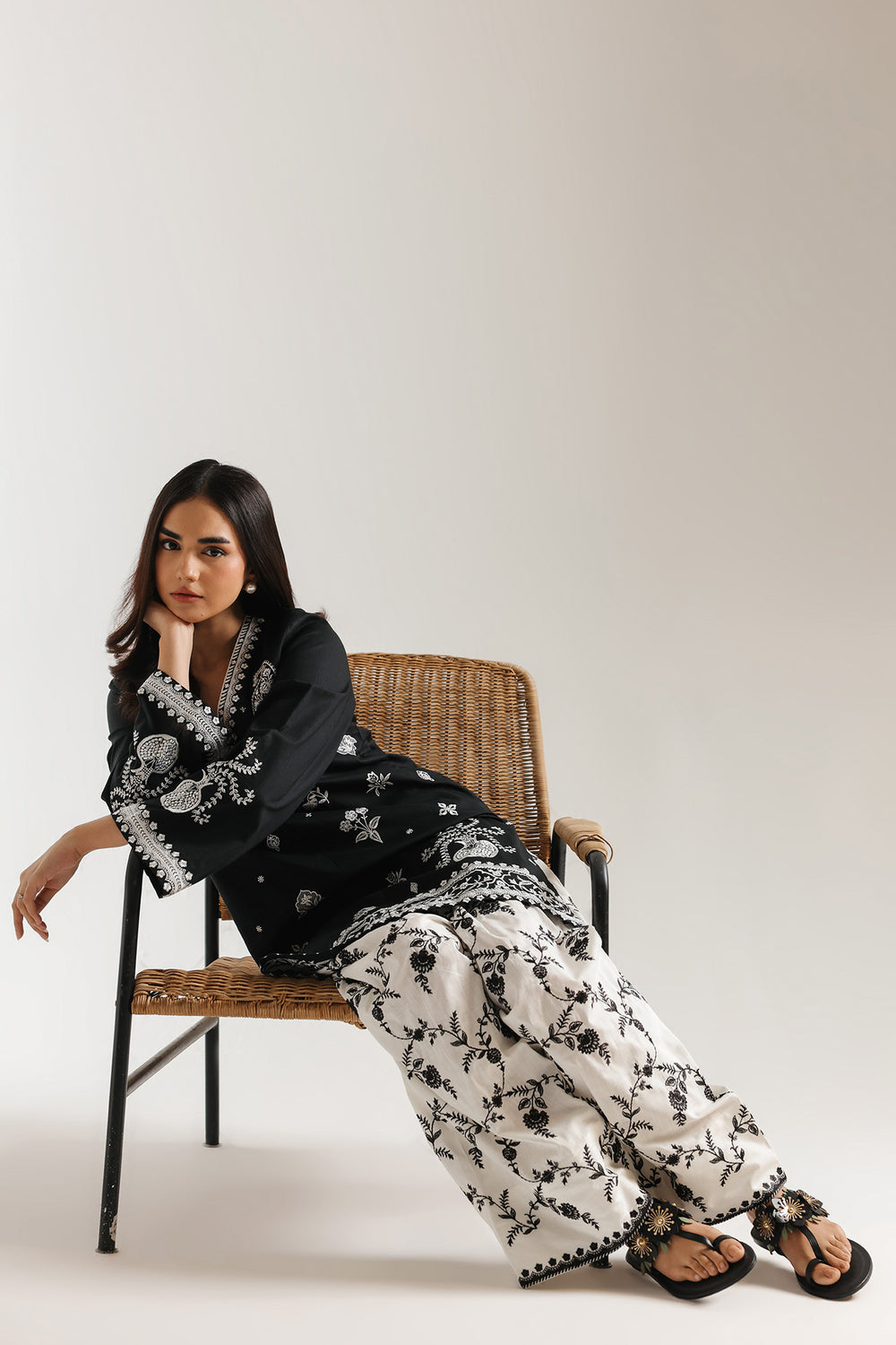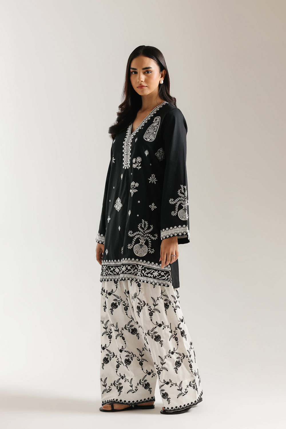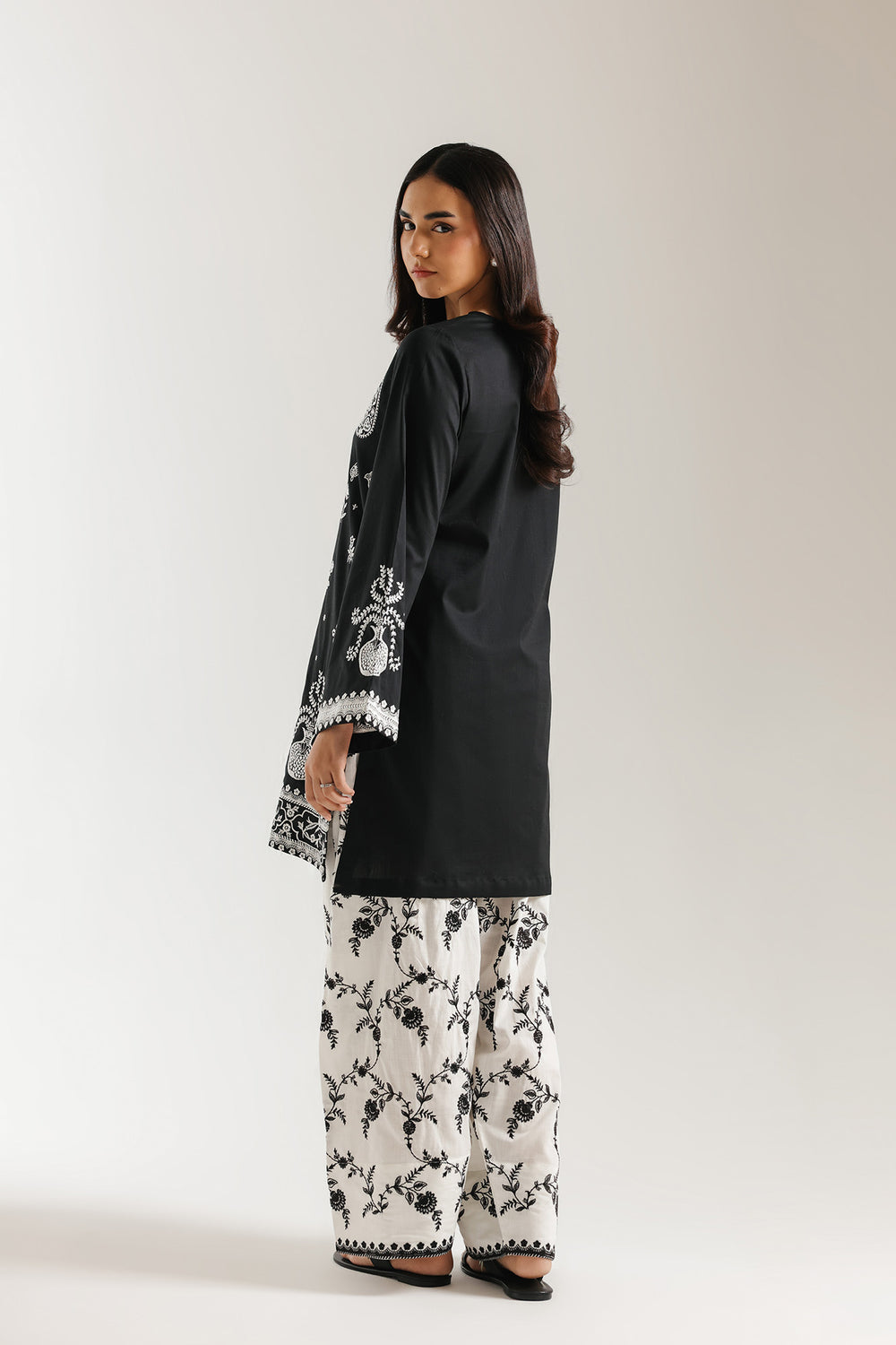 Bring a touch of modern heritage to your wardrobe with this striking black and ivory two-piece suit. The shirt features a sophisticated, loose-fit silhouette adorned with intricate white embroidery that creates a beautiful contrast against the deep black base. Delicate floral and geometric patterns frame the neckline and cascade down the front, while the flared sleeves and ornate hemline add a feminine, airy feel. Paired with voluminous ivory shalwar covered in a graceful black trailing vine print, this set perfectly balances bold monochromatic artistry with effortless daily comfort.