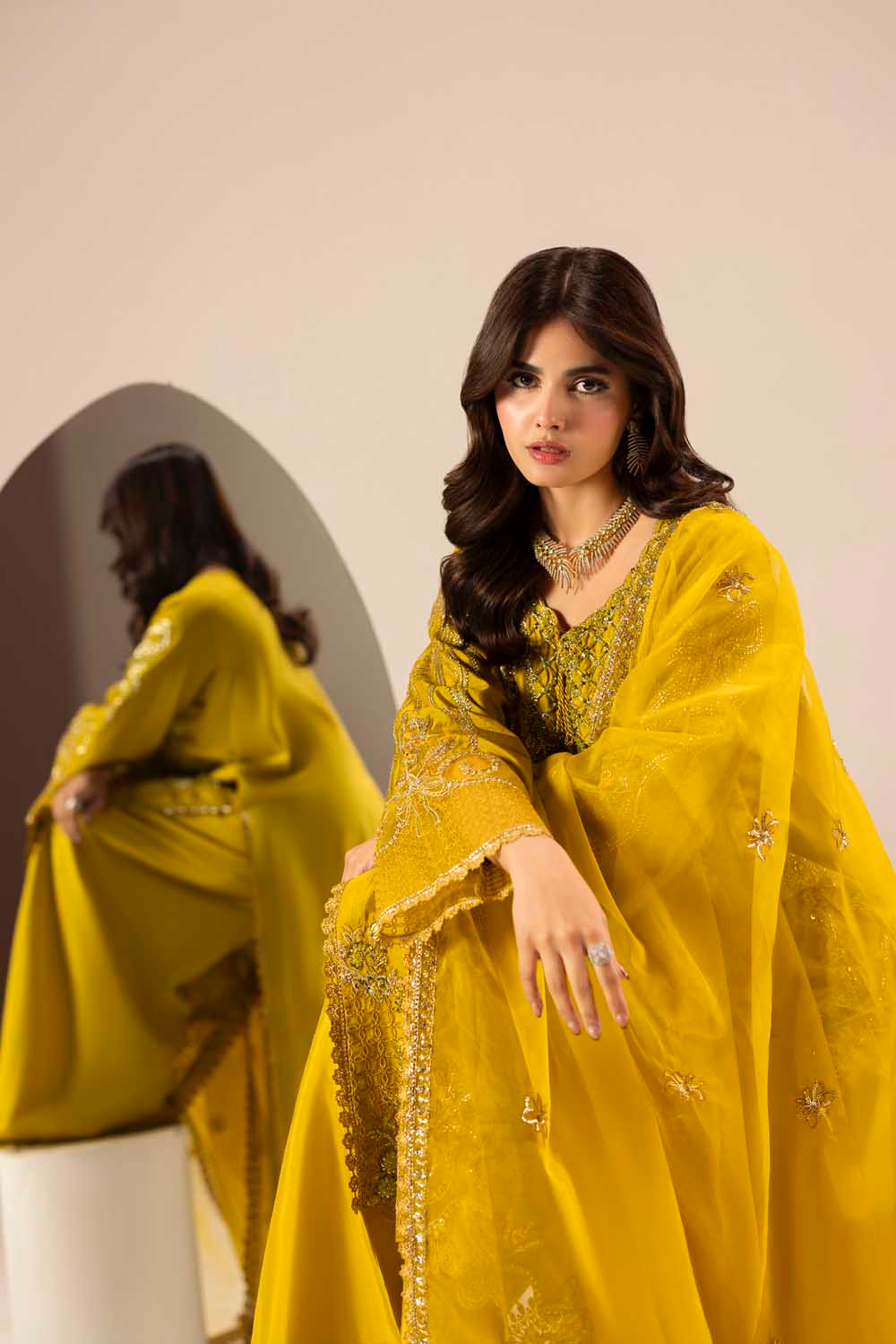 Dupatta: Organza embroidered dupatta, finished with an elegant embroidered border.