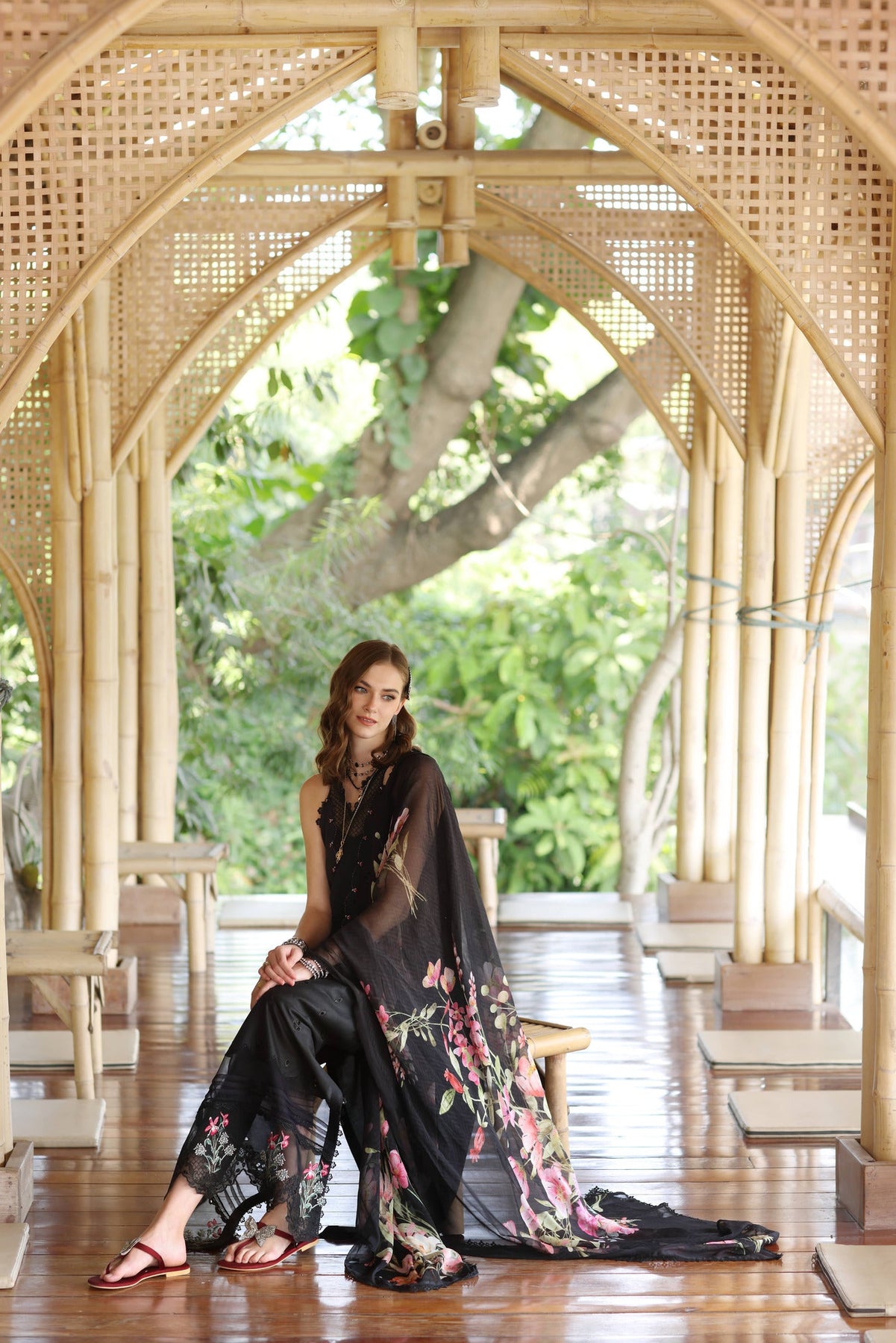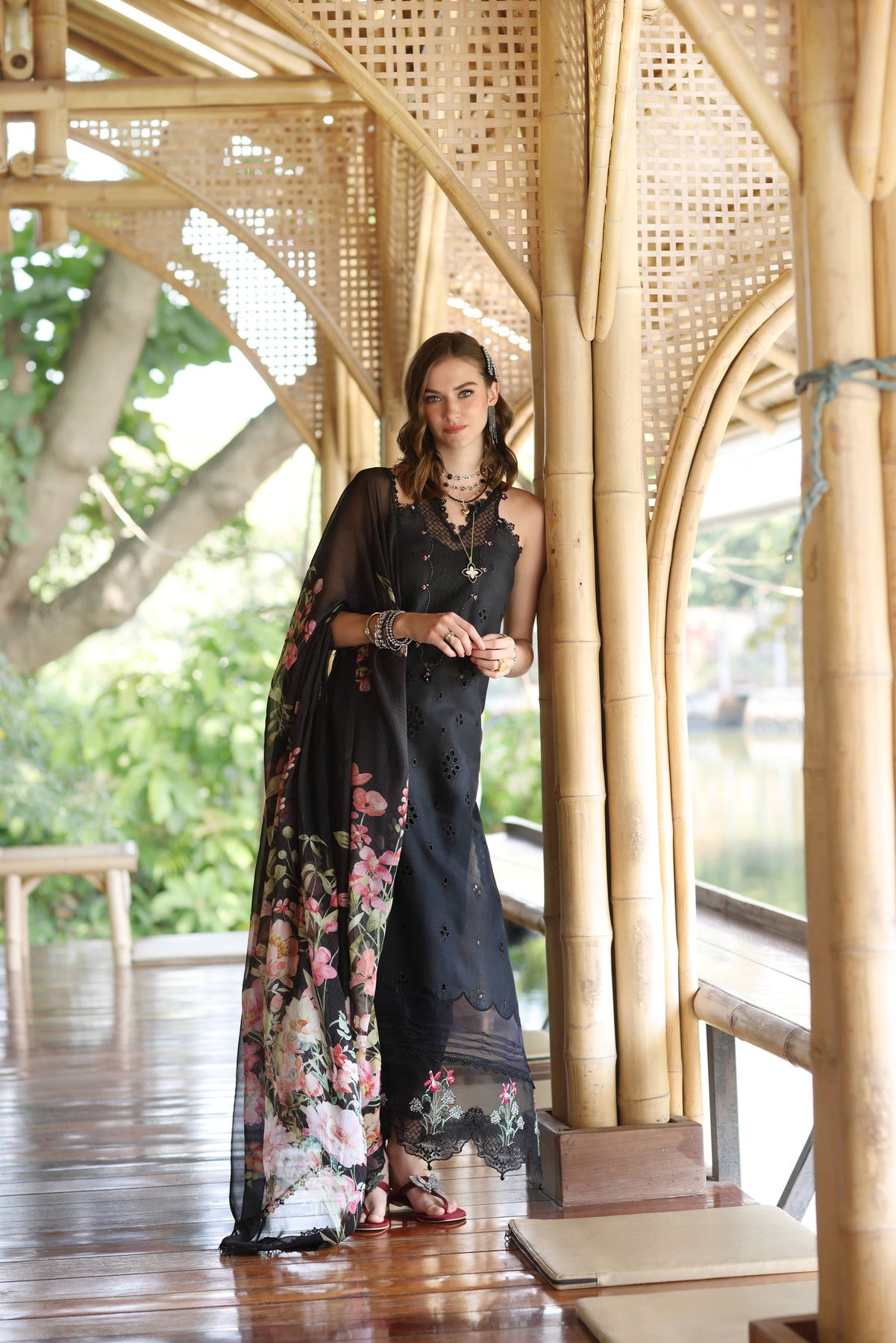 A wardrobe is incomplete without a deep rich color! Introducing our stunning new arrival featuring solid black lawn shirt in a bold schiffli pattern, with exquisite orchid floral hem border and intricately embroidered mesh pattern neckline for a flawless finish. Paired with a beautiful floral digital printed chiffon dupatta, this ensemble is easy to wear, breathable for comfort and sure to elevate your style game