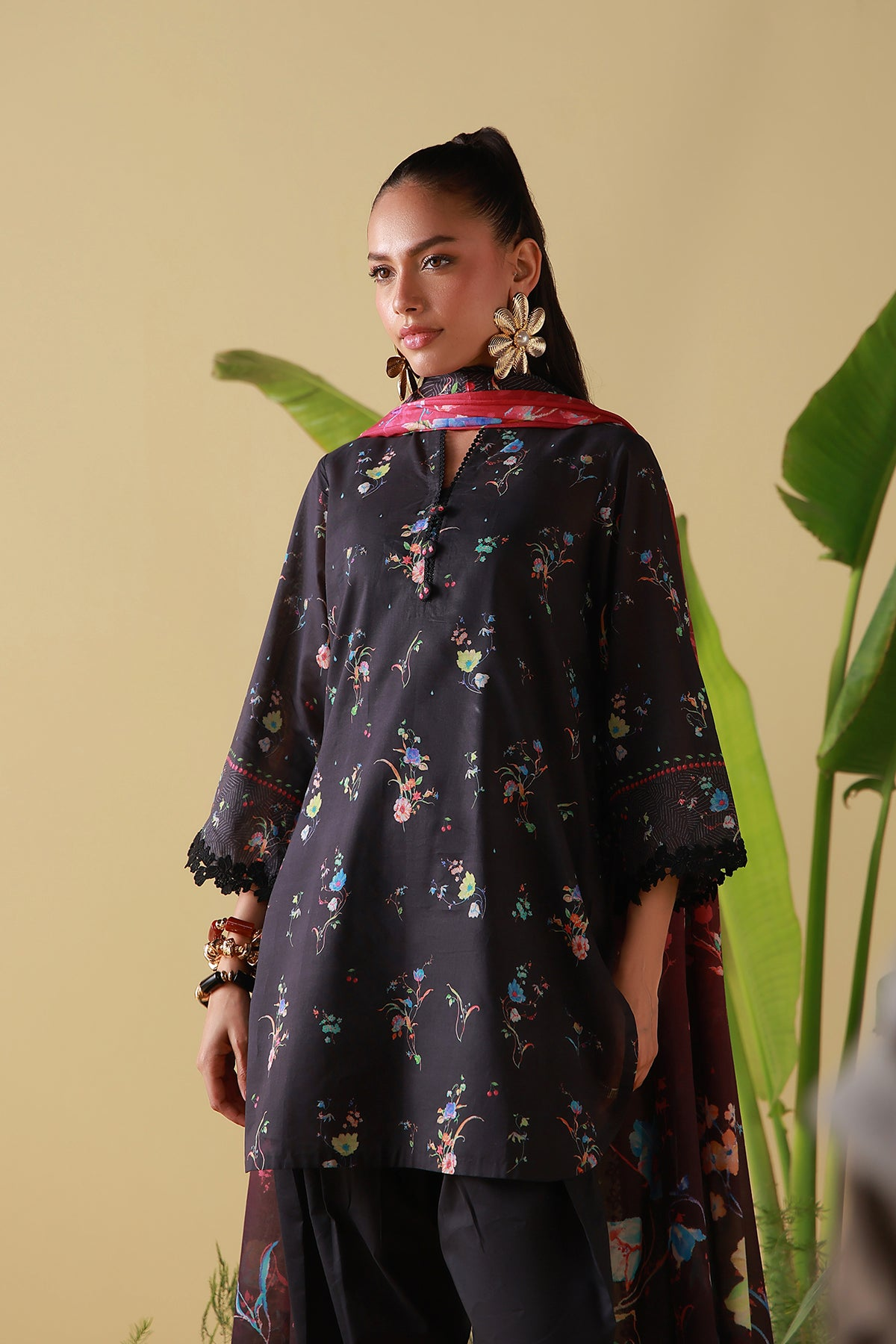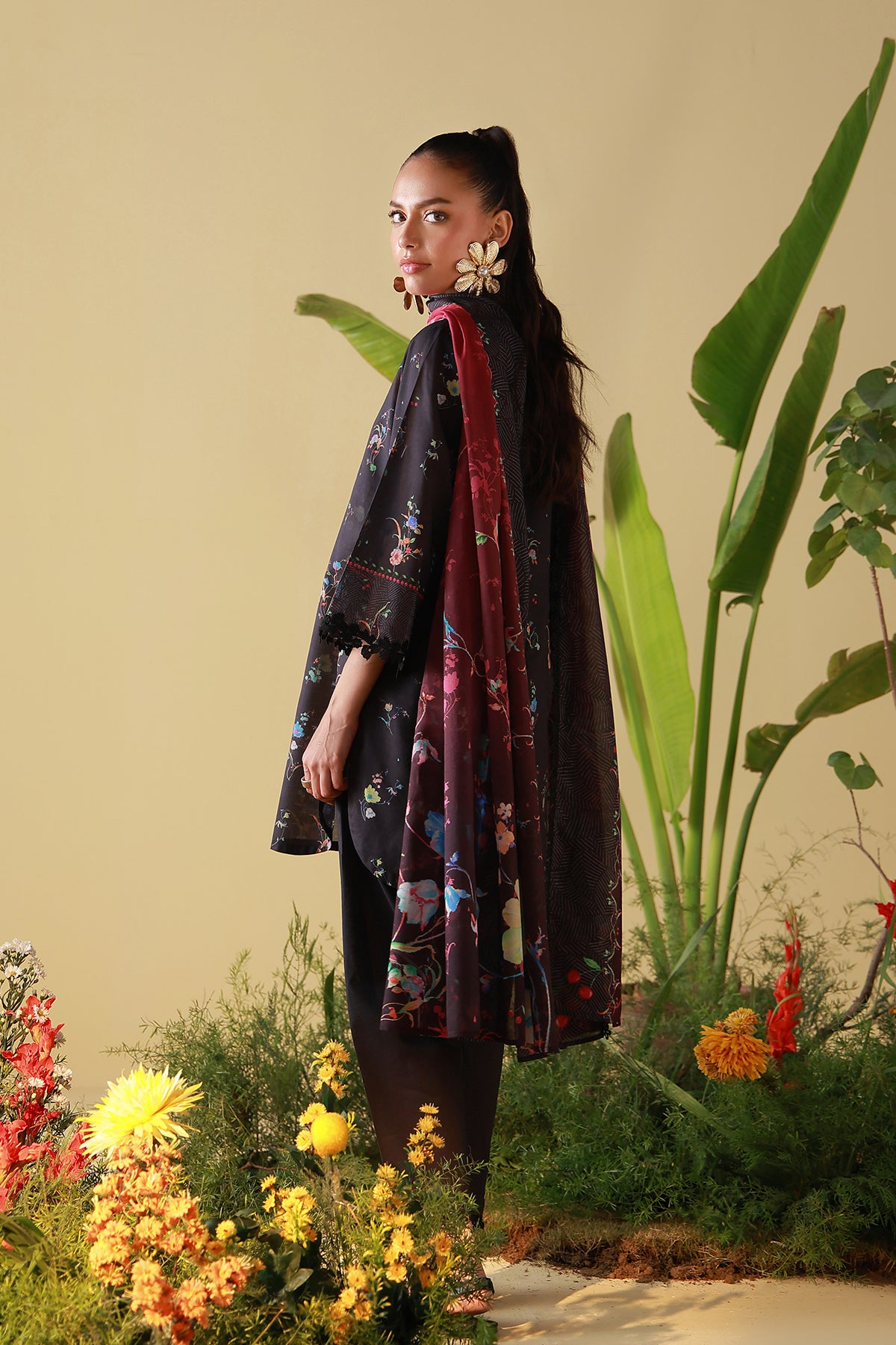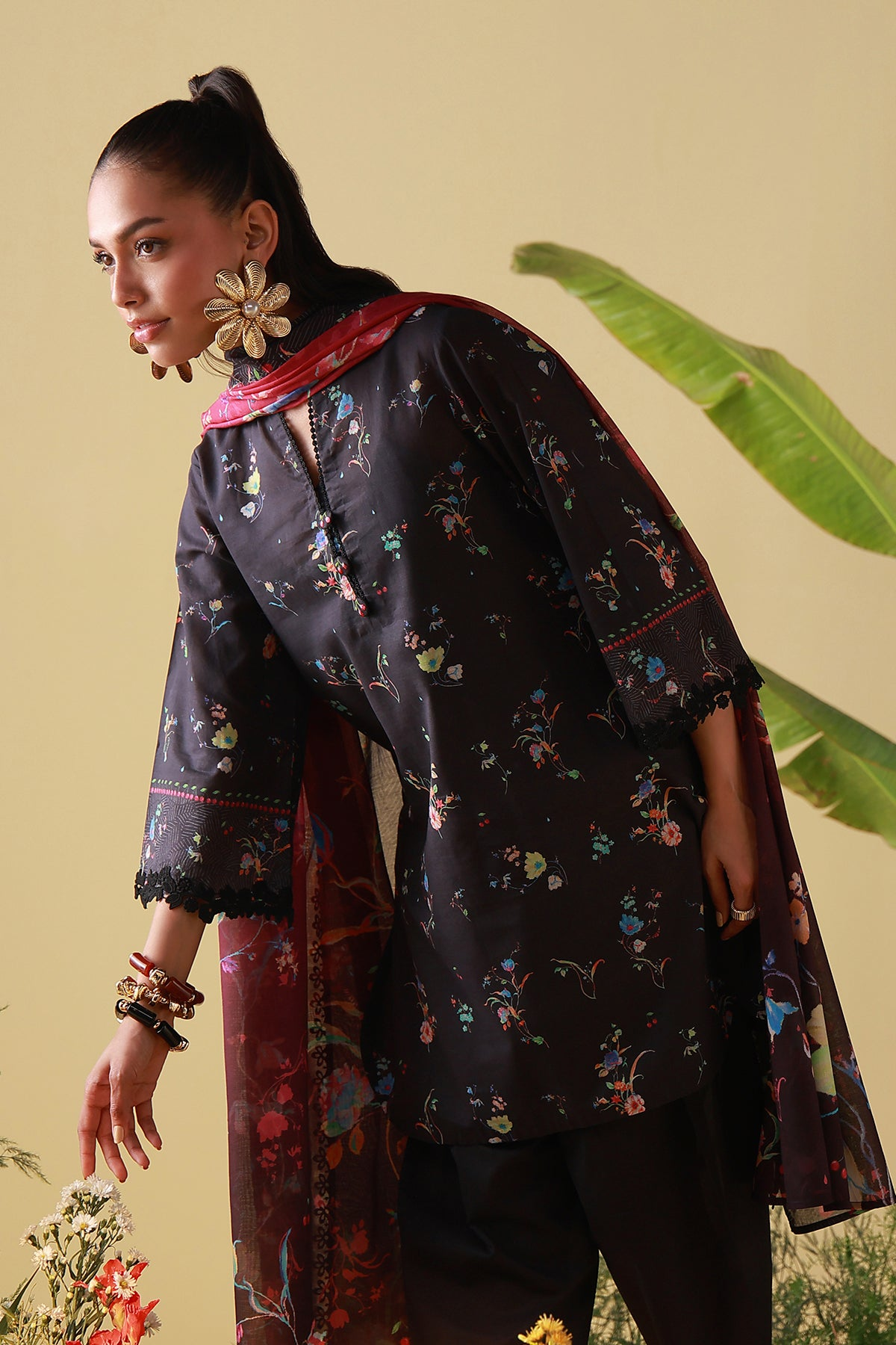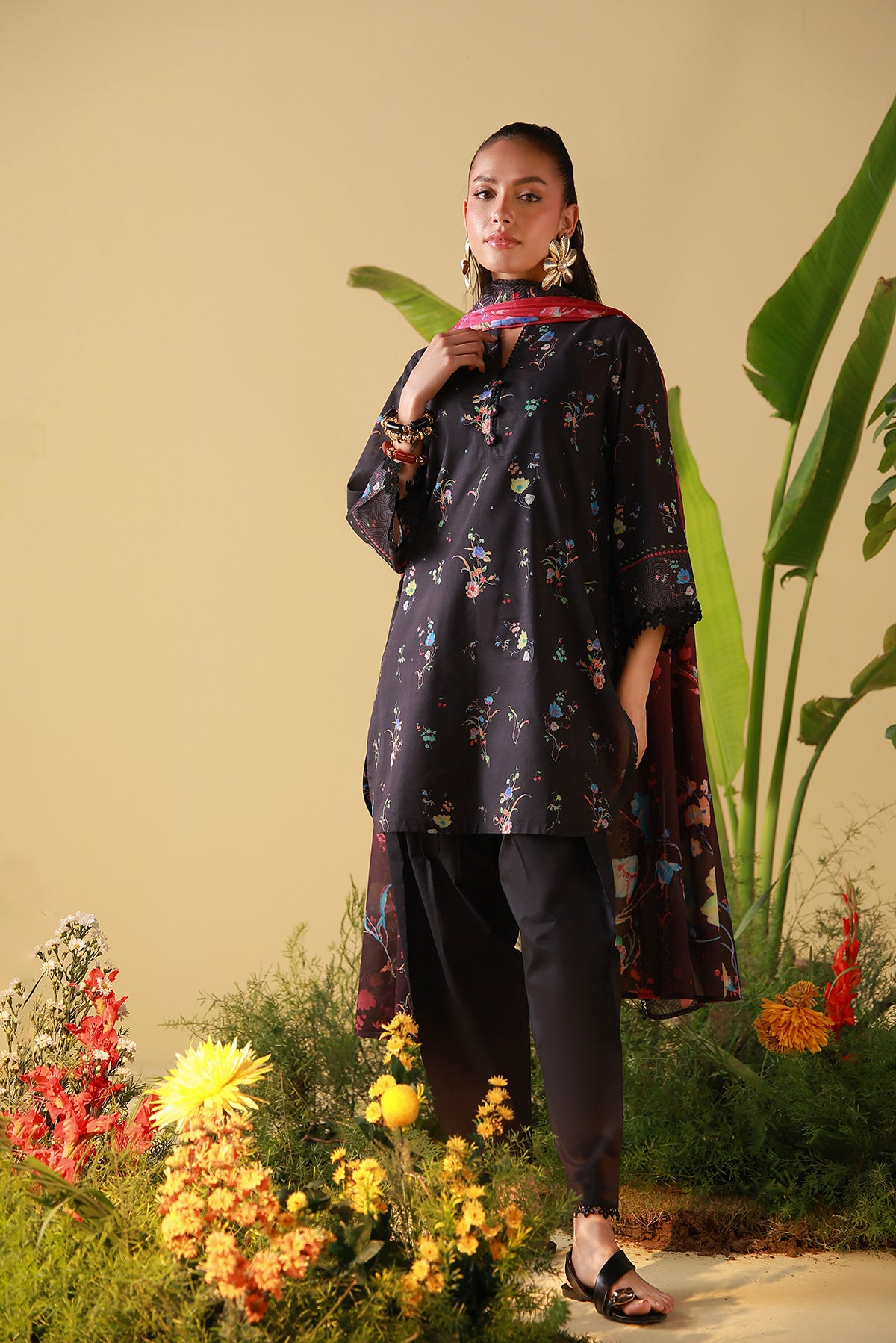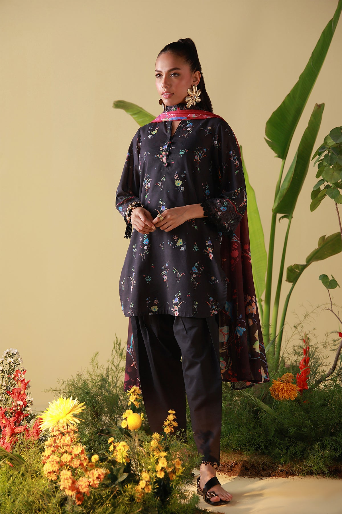 Deep black accented with scattered florals in jewel tones for subtle drama. The dupatta adds depth and movement, styled with classic pants. Elegant and effortlessly chic.
