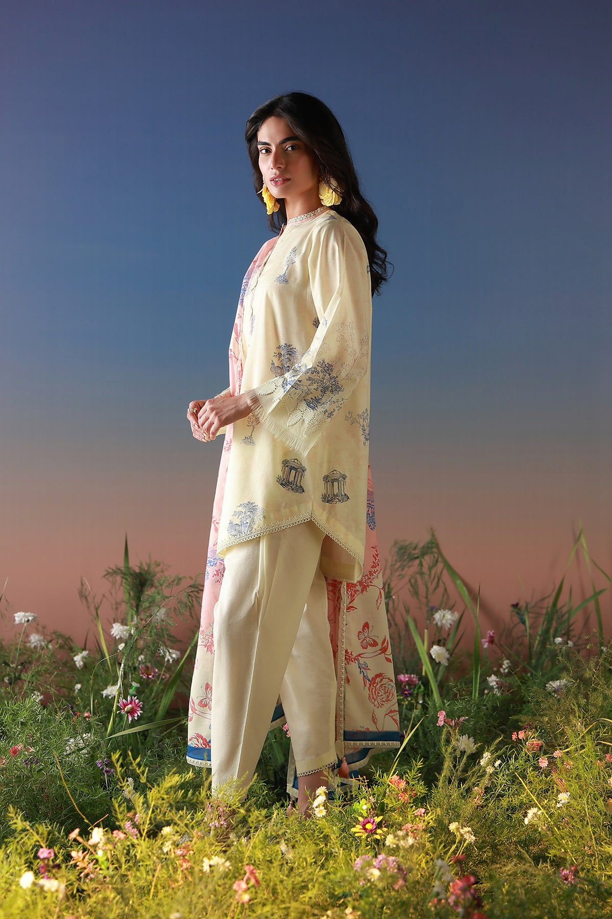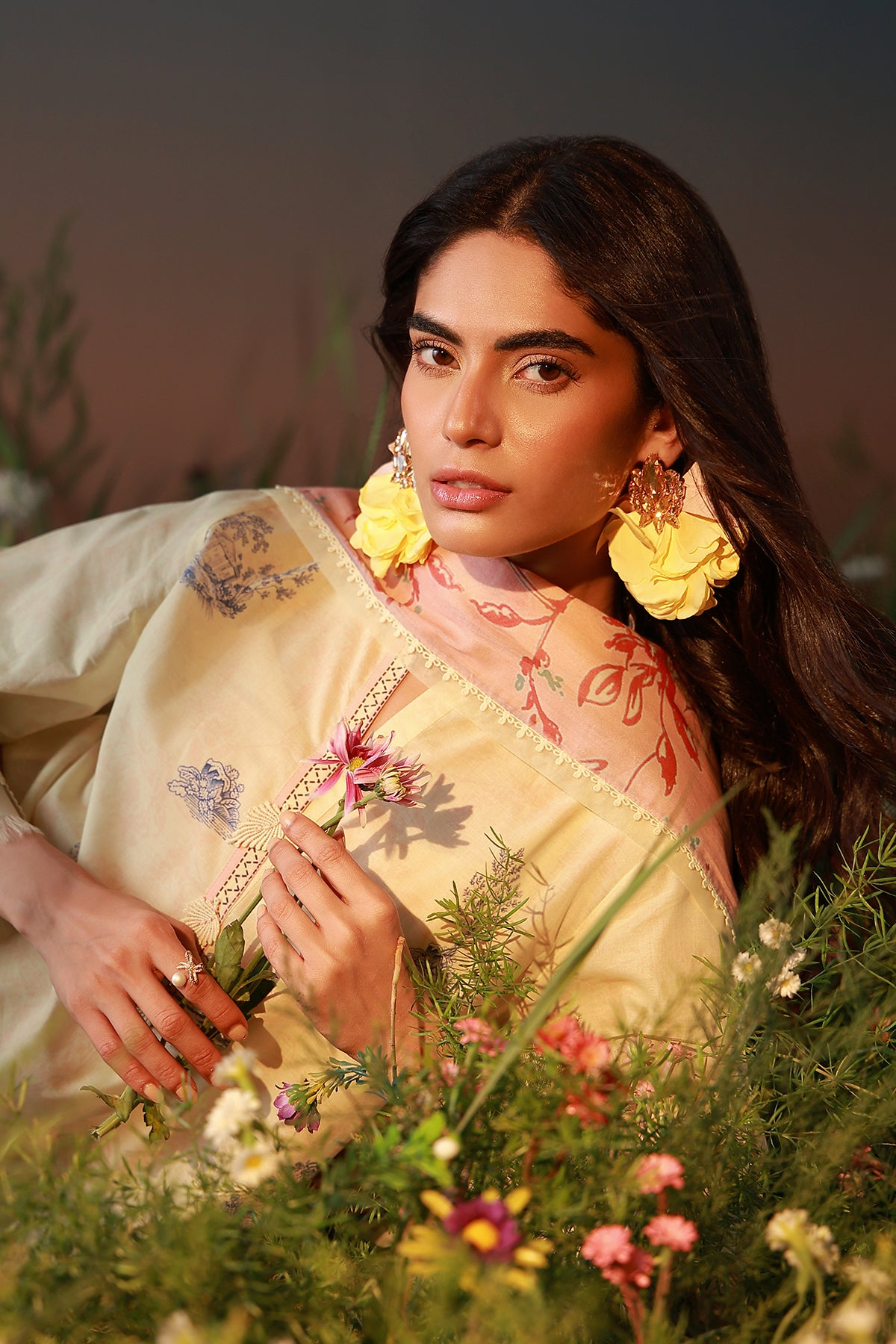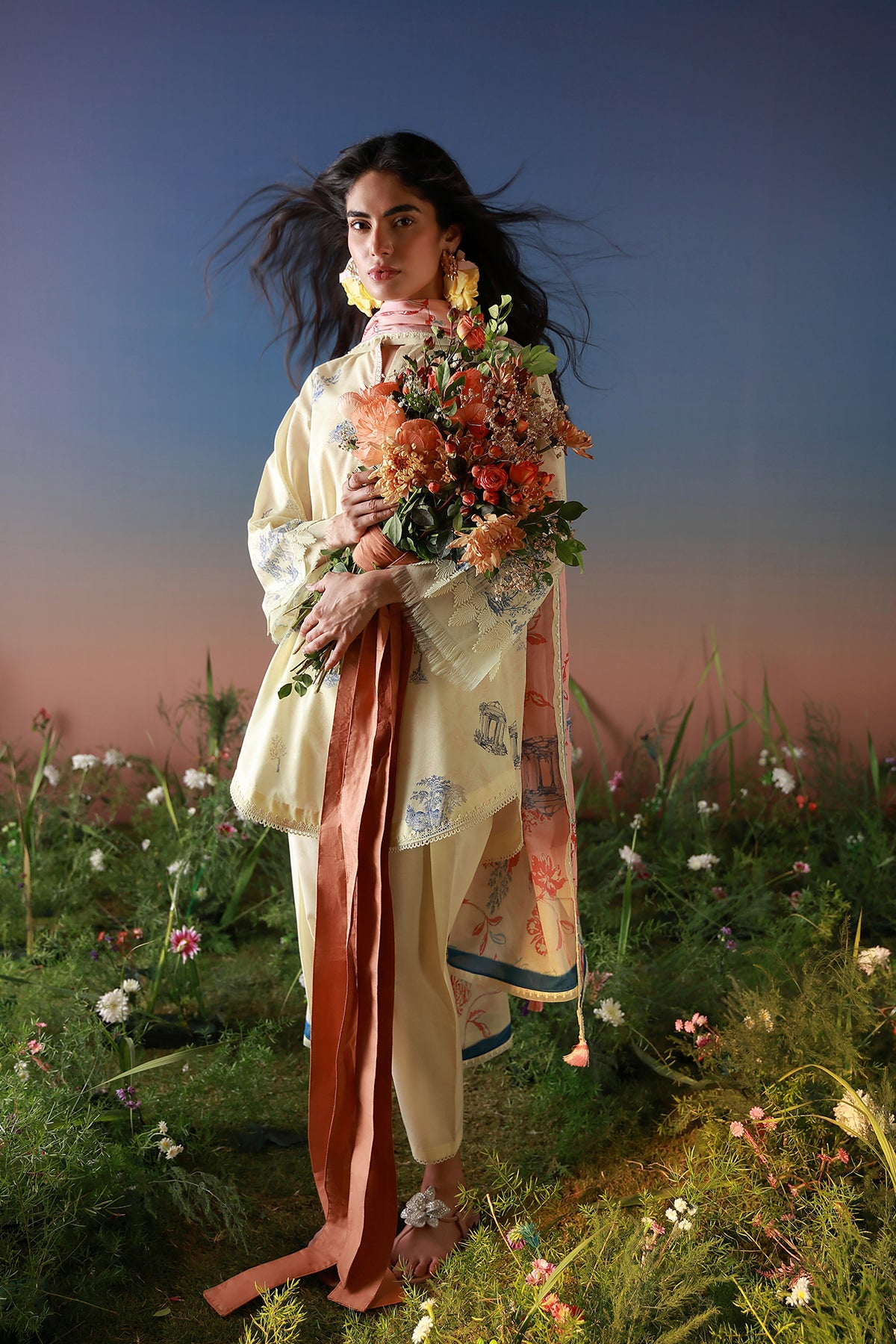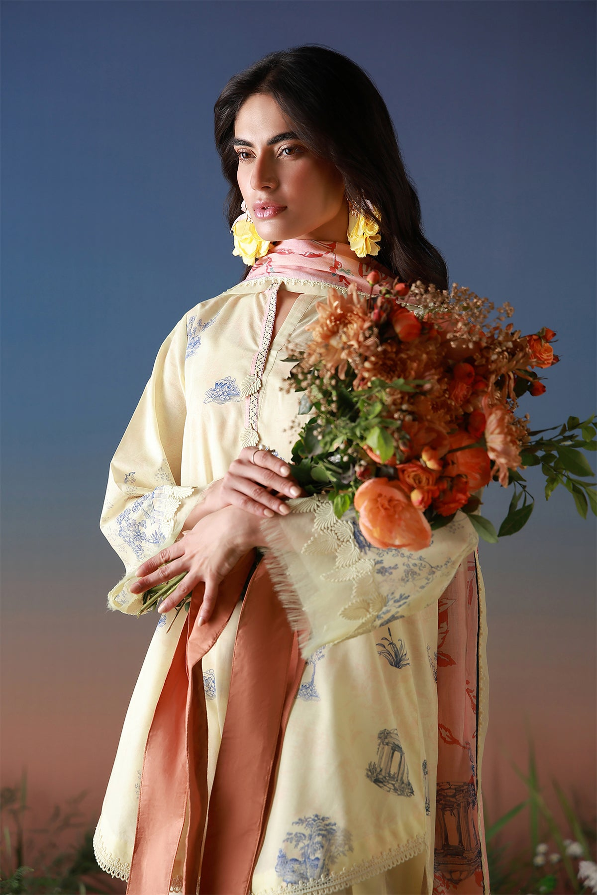 Buttery yellow tones meet delicate blue floral sprigs for a light, breezy aesthetic. The dupatta carries soft contrasts, paired with classic pants for ease. Understated, airy, and effortlessly wearable.