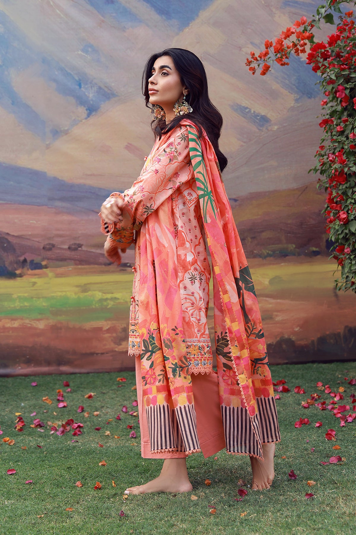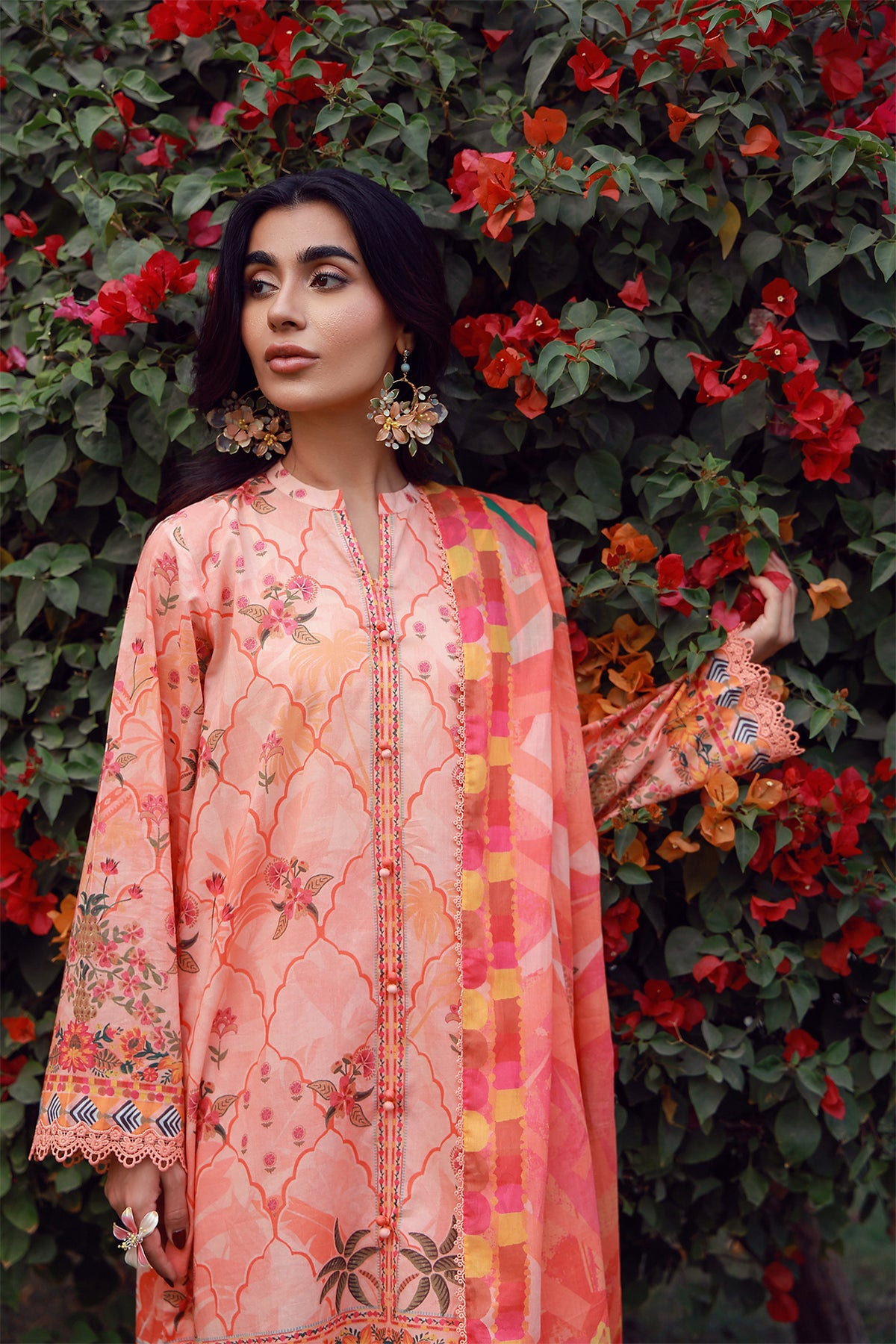 Warm coral and peach hues layered with oversized tropical florals for a sun-kissed feel. The flowing dupatta echoes the print’s vibrancy, paired with subtle pants for balance. Joyful, expressive, and summer-ready.