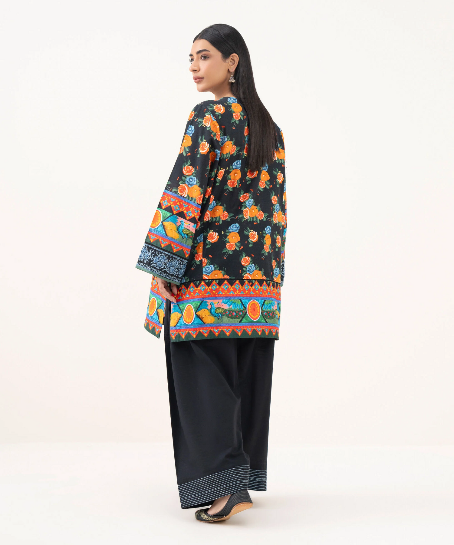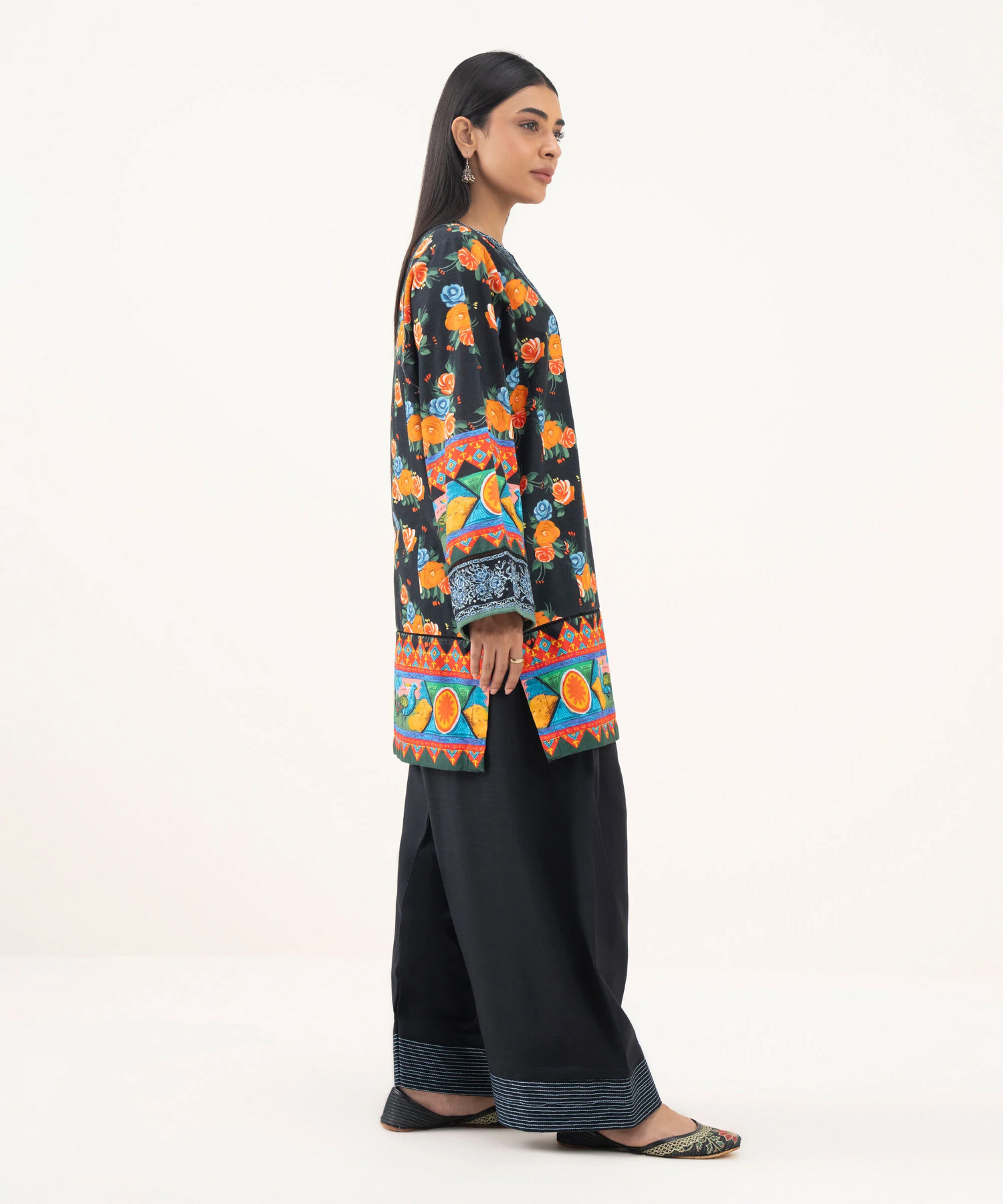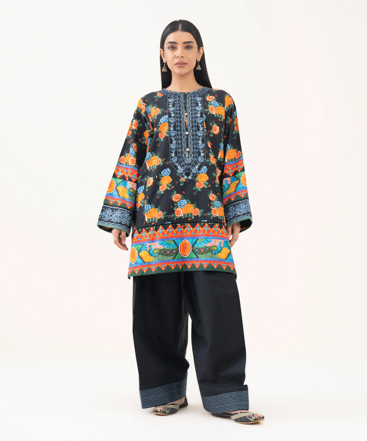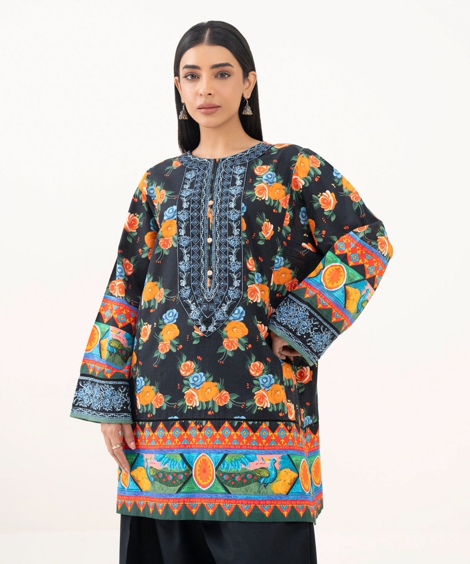 Printed With Embroidered Front Panel, Printed Back Panel, Round With Slit Neckline, Full Sleeves, Short Length