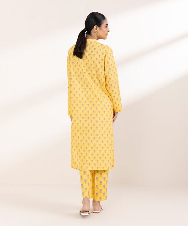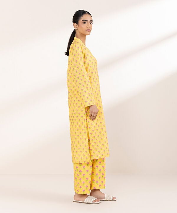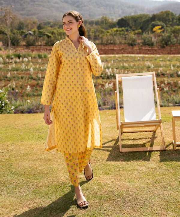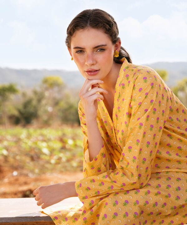 Make a statement in our printed yellow, lawn, a-line shirt with a y-neckline.