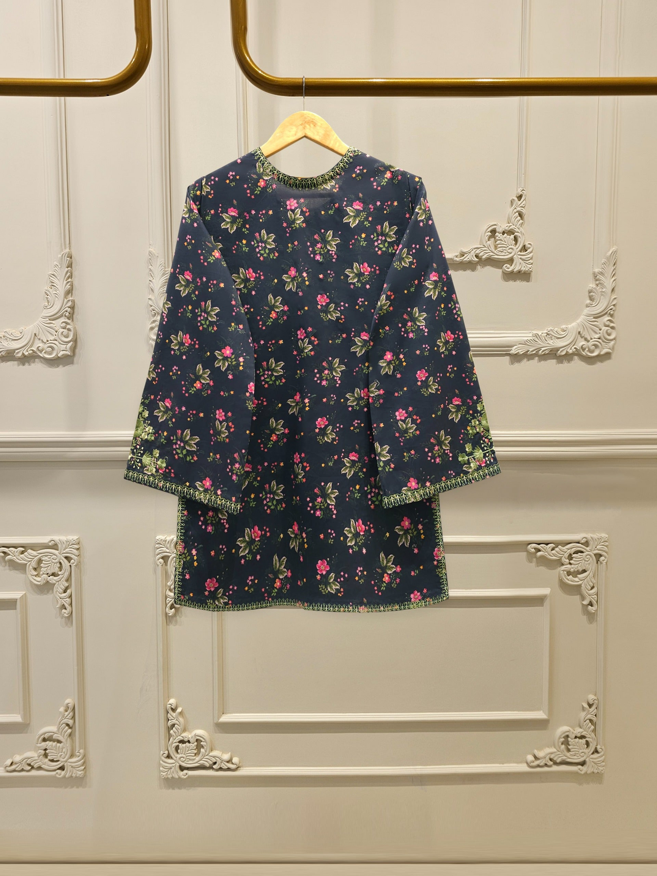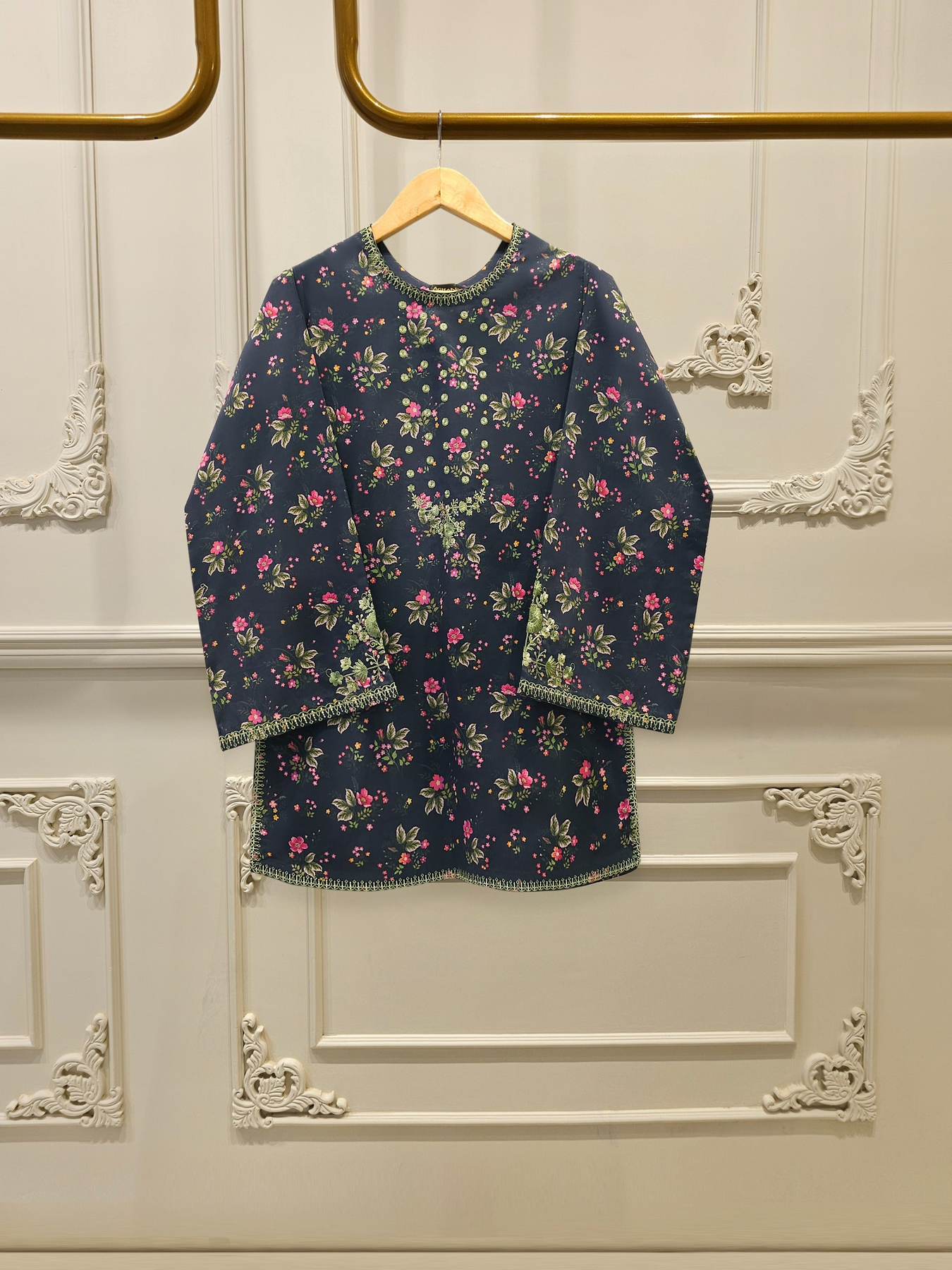 Elevate your summer wardrobe with this beautifully crafted blue printed cambric shirt, featuring intricate Chikan Kari work on the sleeves and daman. Designed for timeless elegance, this piece blends breathable lawn fabric with traditional craftsmanship, perfect for festive occasions or casual sophistication. Pair it with pants for a complete look.