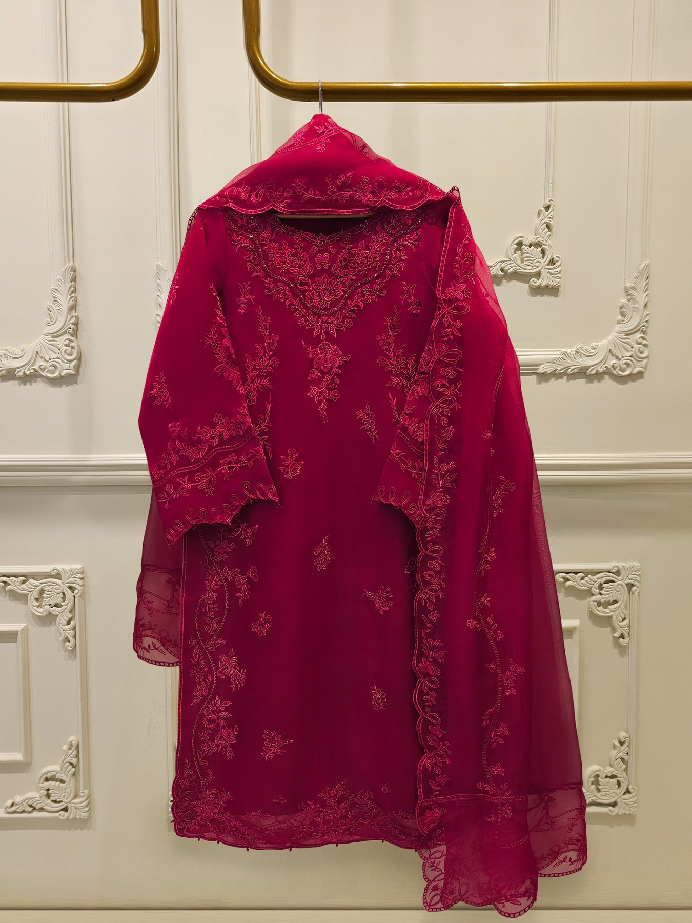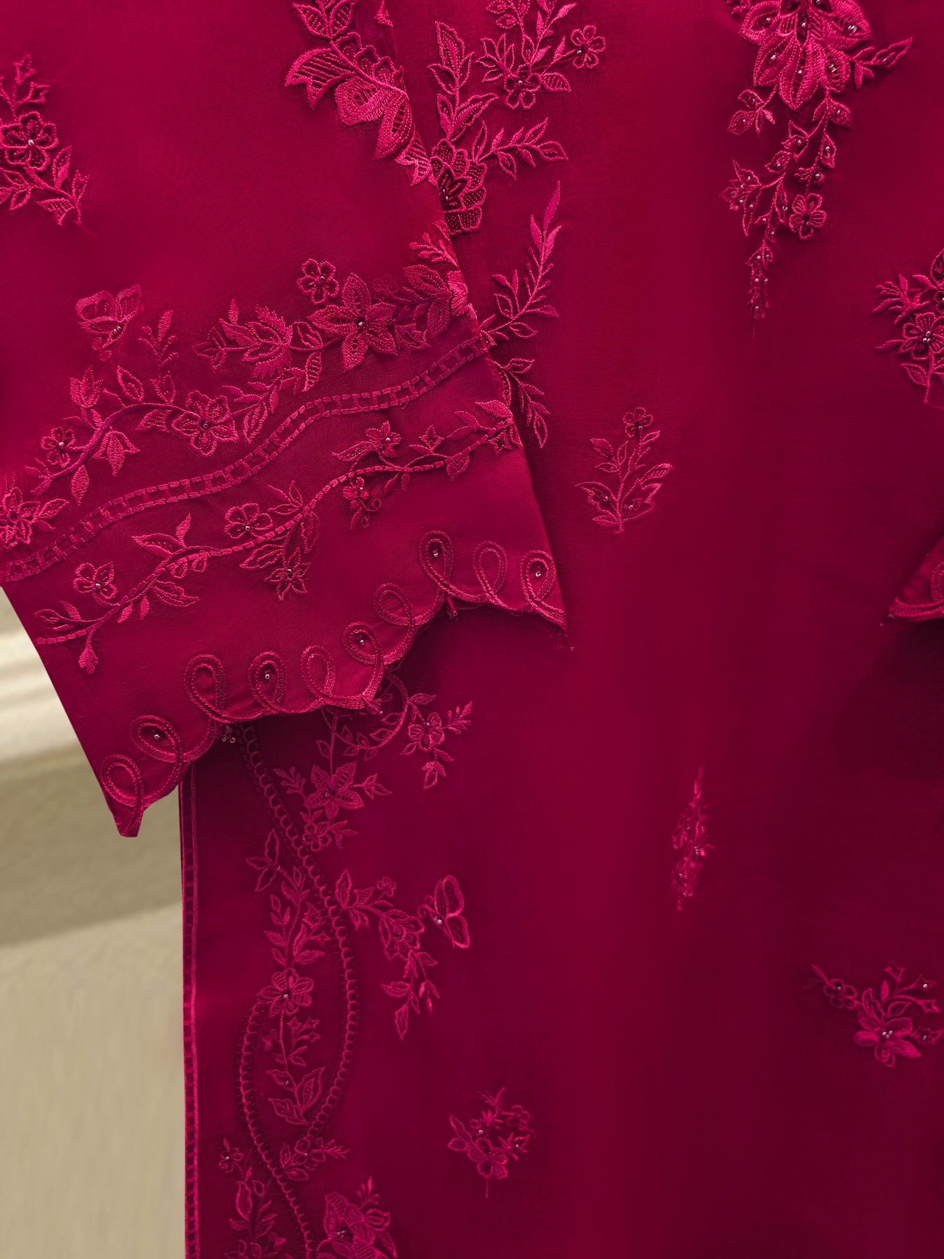 Elevate your style with maroon embroidered organza straight shirt crafted with utmost care and attention to detail. The shirt features intricate embroidery on the front and sleeves, adding a touch of timeless charm.
