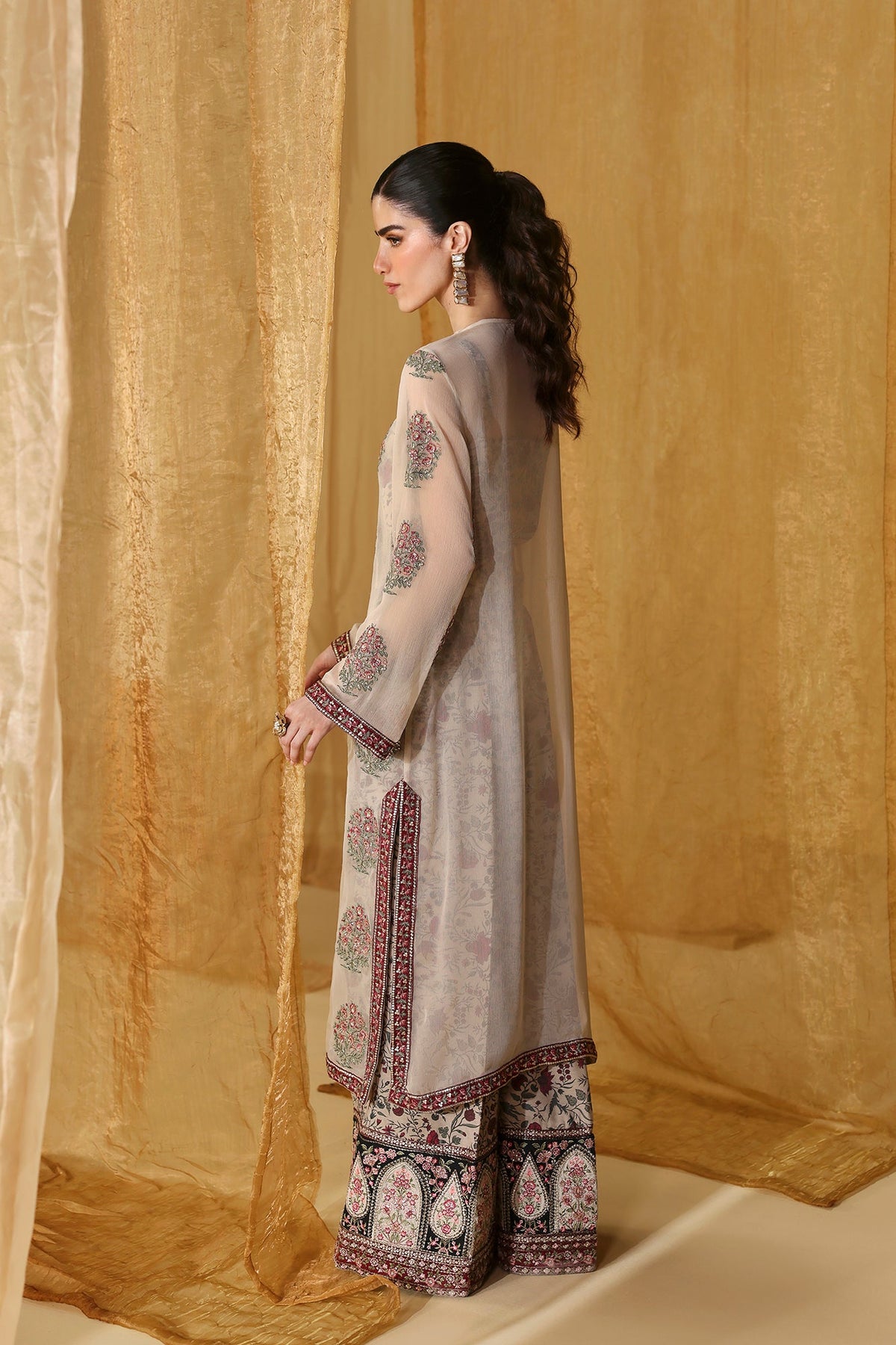 Look breathtakingly beautiful in this mesmerizing off white outfit. Crafted in a contemporary long length silhouette, this elegant shirt features beautiful floral embroidery in enchanting green and red colors with scintillating details. Illustrating a mesmerizing look look, the divine gorgeous shirt is paired with a printed inner slip and a classically crafted printed flared trouser adorned with beautifully embroidered border at bottom opening, you can't help but feel like a diva in this fairytale ensemble to style at festive events.
