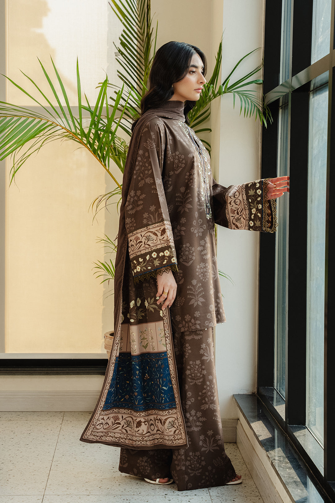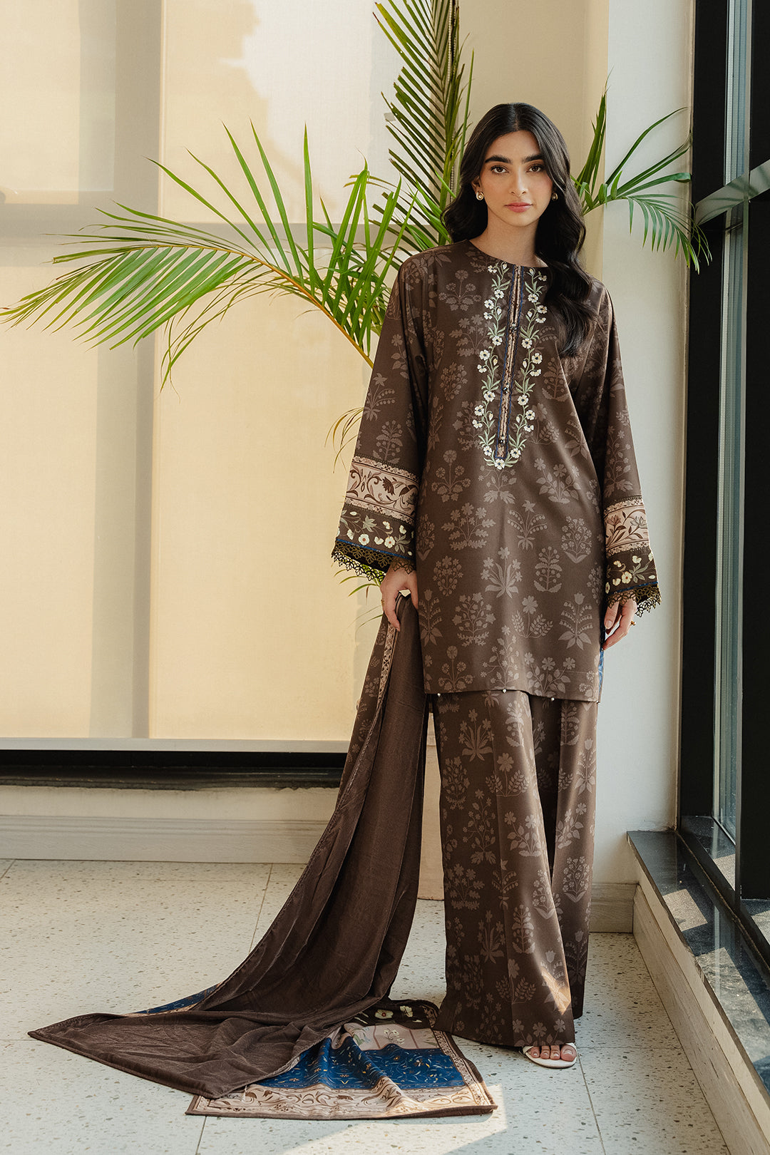 • This khaki stole made in soft velvet and crepe fabric in floral print can be paired with "Haich top" to complete the look.