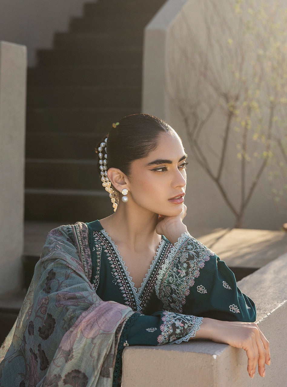 This elegant deep teal 3-piece embroidered Lawn suit features beautiful scattered embroidered motifs and a heavily embroidered border on the hem and sleeves. It is paired with a lovely contrasting dupatta showcasing a delicate floral print. The set is finished with simple matching trousers