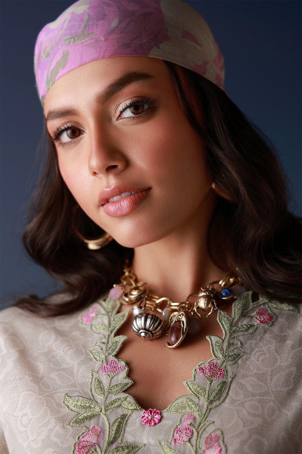 Step into understated luxury with this exquisitely embroidered ensemble, crafted in a soft neutral palette and adorned with delicate pastel French florals. The intricate neckline embroidery and wide statement sleeves add a graceful charm, while the printed and embroidered silk dupatta in contrasting magenta and green hues complete the look with timeless elegance. Perfect for daytime festivities, intimate gatherings, or festive soirées, this ensemble blends tradition with modern sophistication.